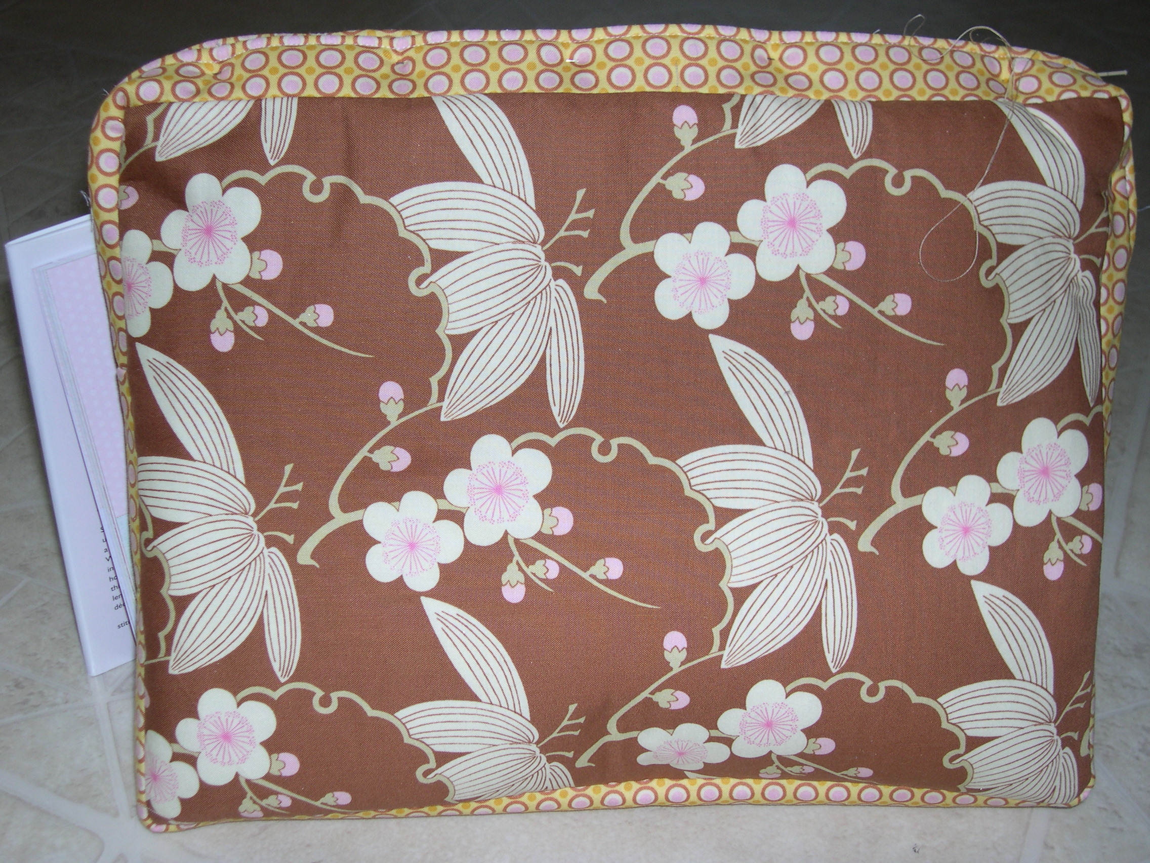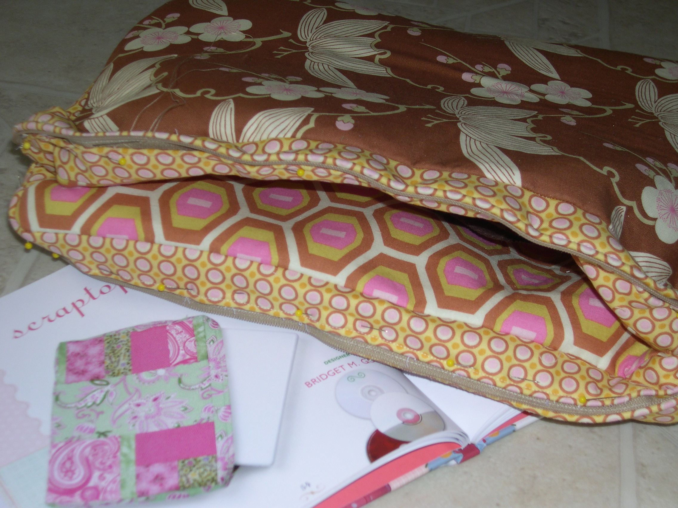 Thank goodness I had made the portable cushions from Sew,Mama,Sew’s tutorial series or I would never have figured out how to do the zipper and gusset. The directions for that part in this book were very minimal, so I used the directions from the cushion tutorial and things went together quite smoothly. I will post another picture as soon as I finish the hand sewing and handles.
