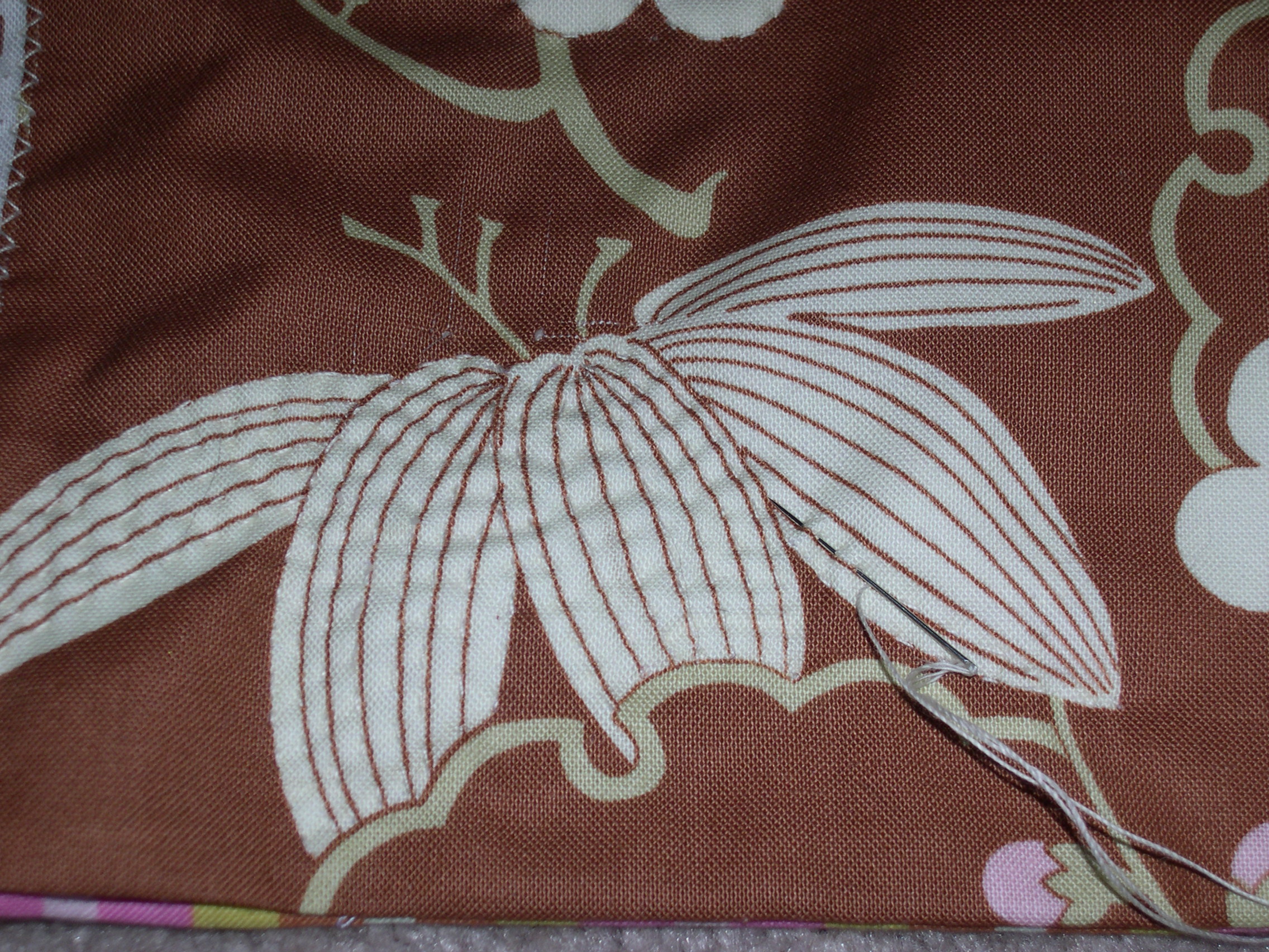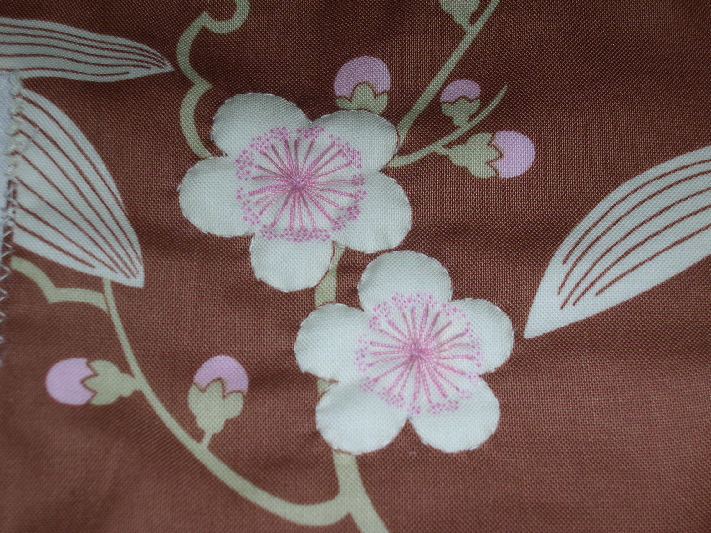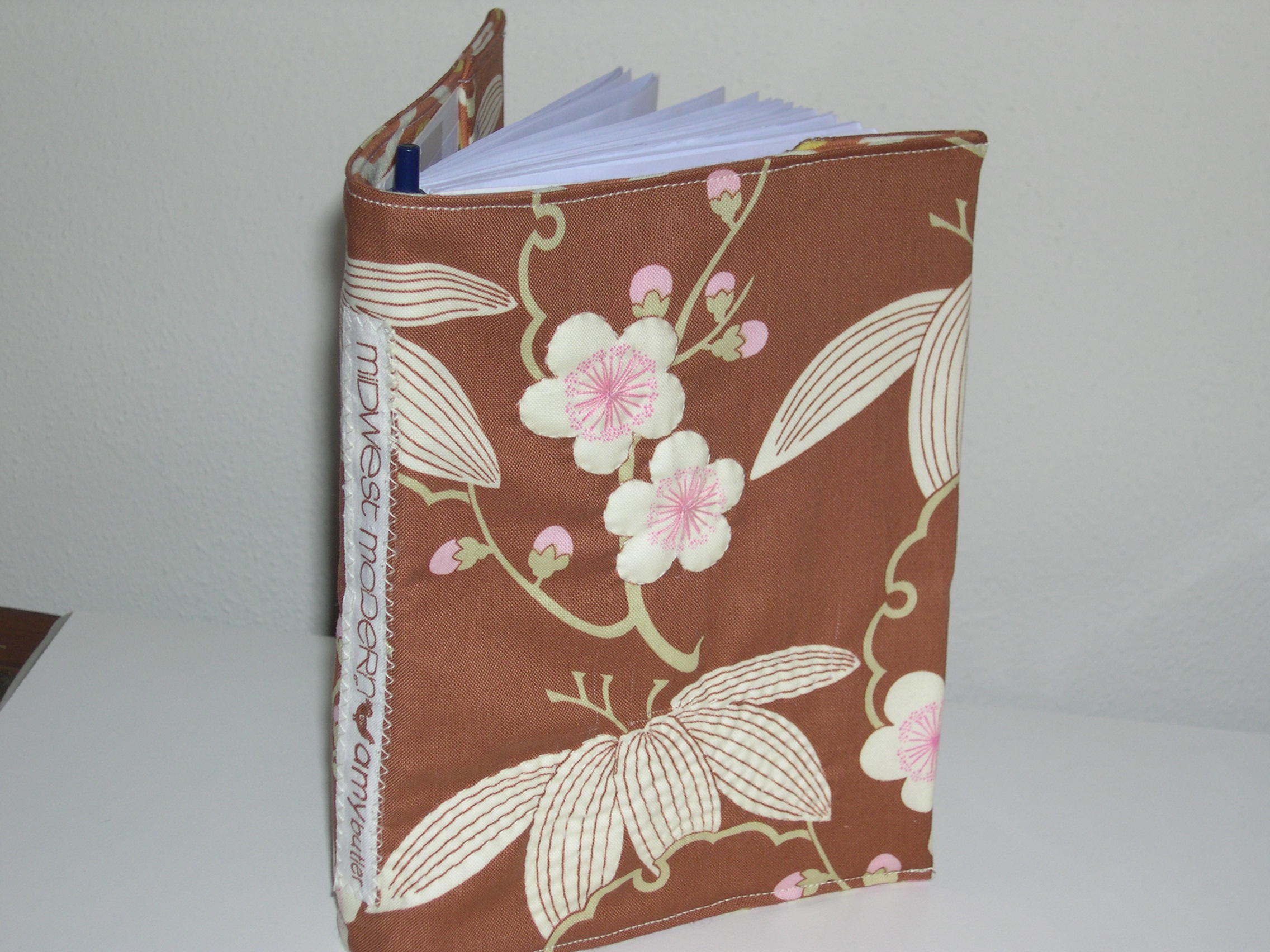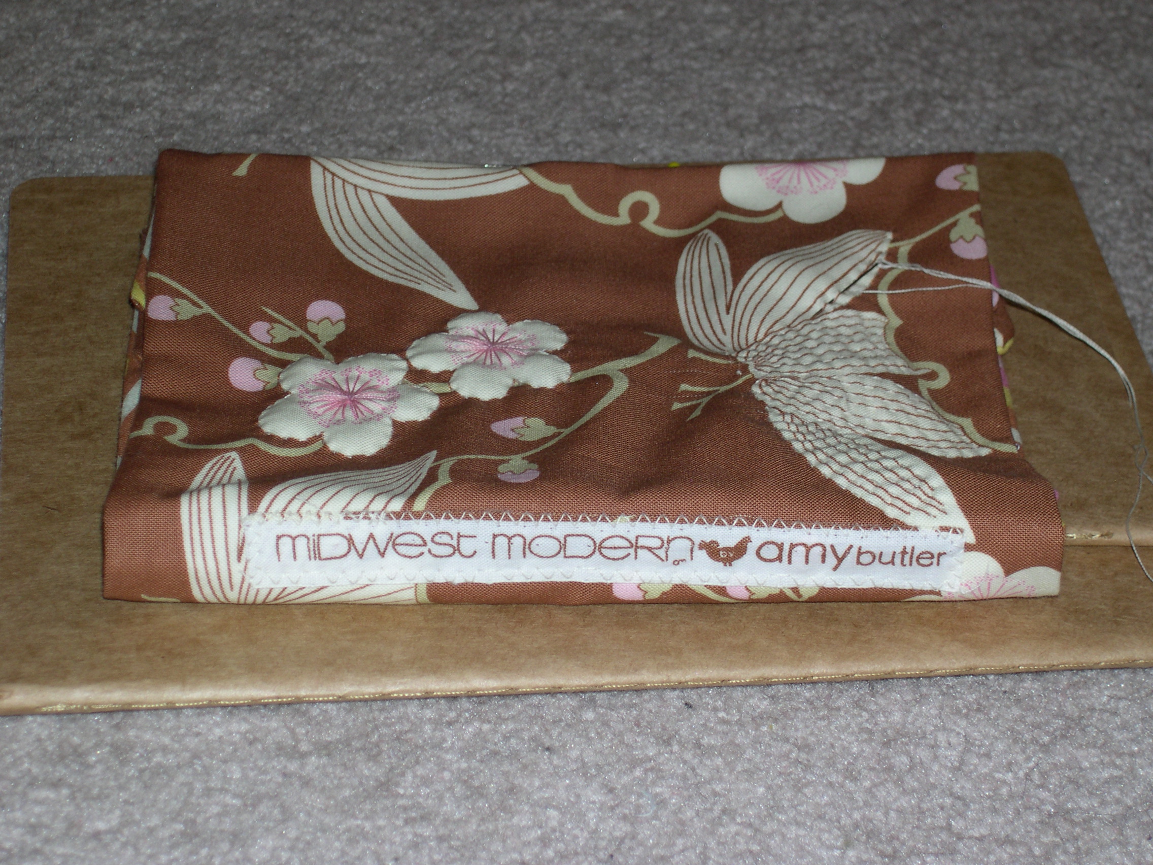 I was working on this notebook cover from the trailing cherry fabric by Amy Butler, and I thought those flowers would be a good place to practice my hand quilting stitches.