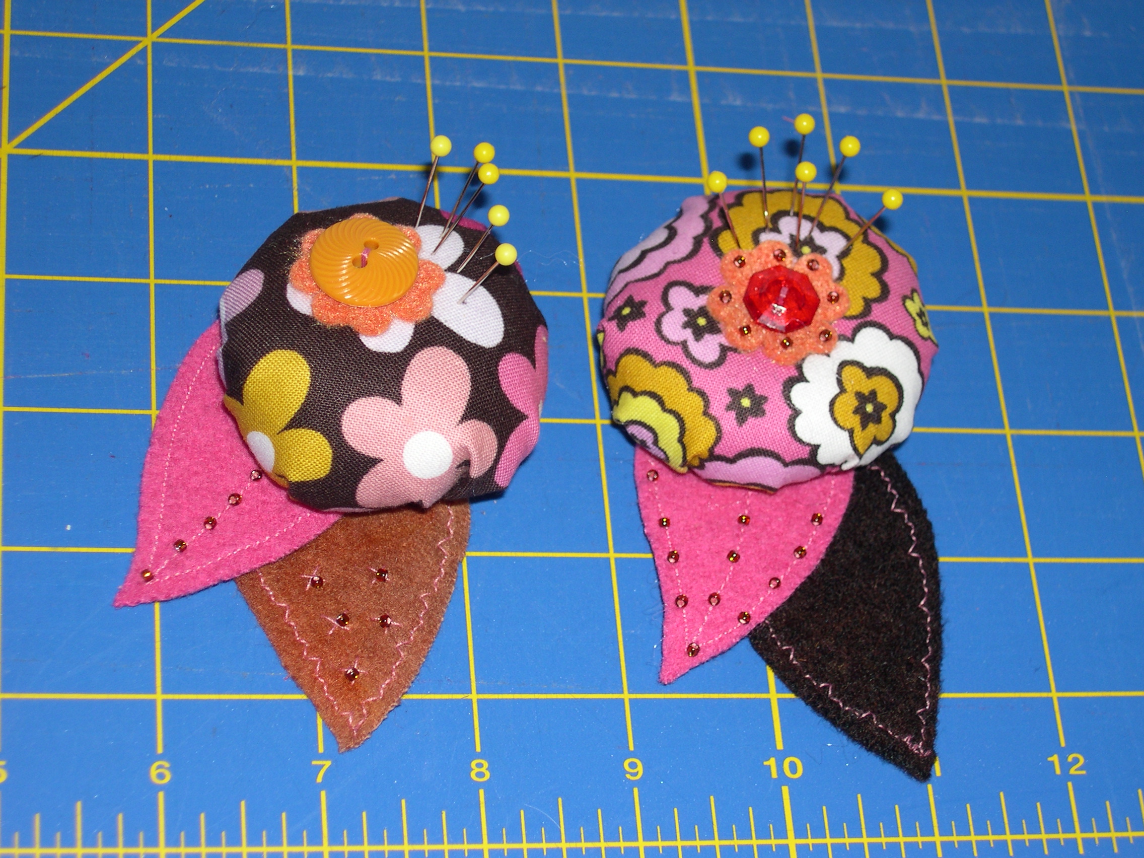 I started out with these adorable pin cushions made from none other than my favorite – chocolate lollipop fabrics. They have embellished felt leaves for a base.
