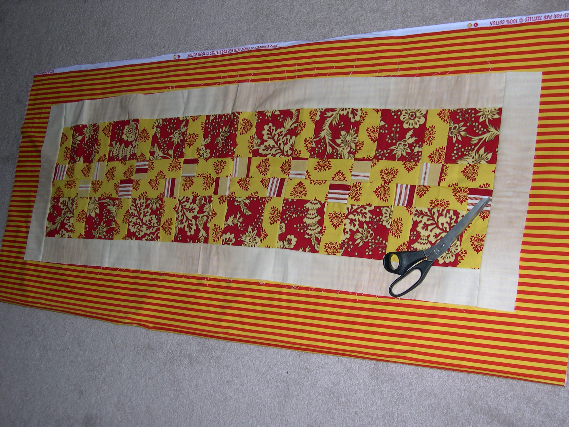 I am also working on this red and yellow table runner using three Michael Miller fabrics and this cool disappearing 9-patch pattern from Spool Sewing.