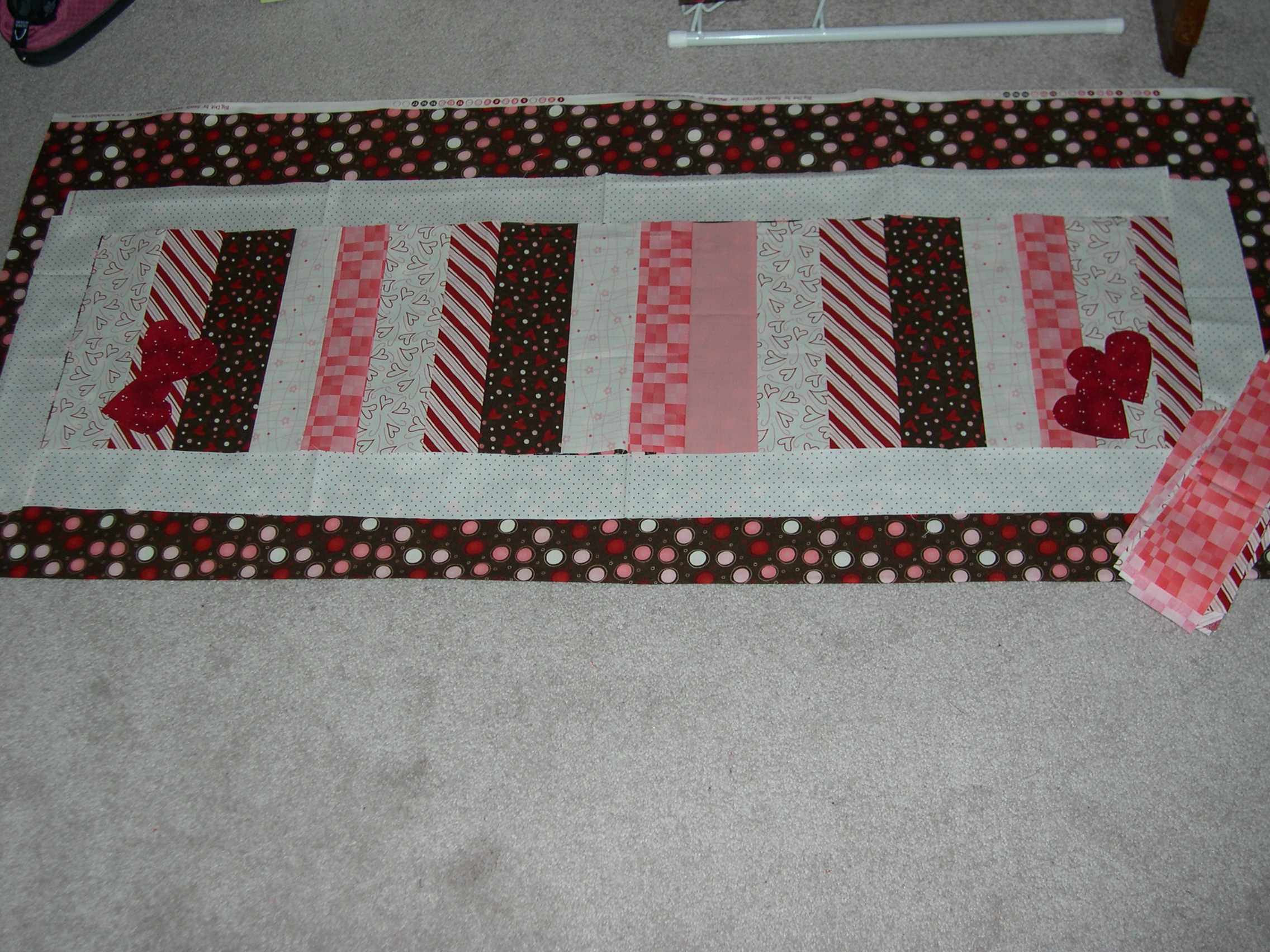 The first sewing project I am working on is a table runner for Valentine’s Day. I used Doris’ pattern from Threads of Conversation, but I had to change the measurements to accommodate the fabric quantities I had in my stash.