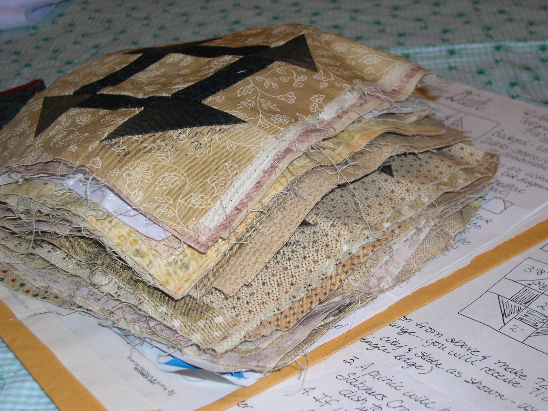 The second exchange was a churn-dash block exchange, where participants brought 72 blocks in four variations to exchange. This time, we each signed our blocks, which is a great way to remember who else participated (especially when you get to my age and start to forget some names of old friends). Here is a picture of the pile of quilt blocks that have been tucked in my sewing stash for too many years.