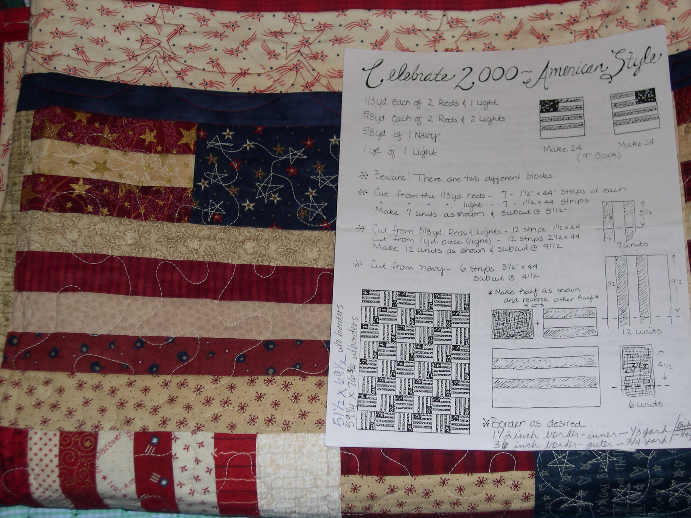 In the first quilt block exchange, participants were given instructions to make 48 flag blocks and bring them to the pot-luck exchange party for our Celebrate America 2000 party.