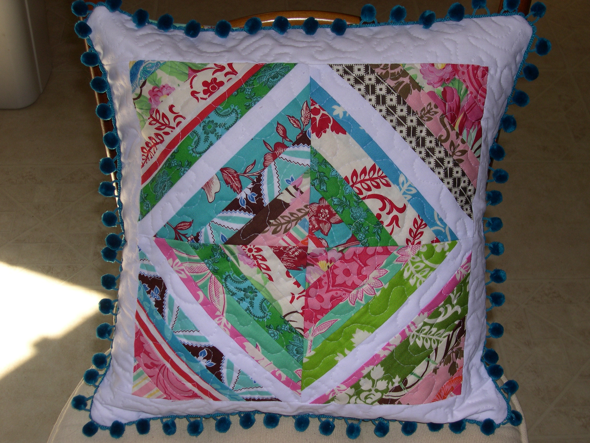 4. Oh, I love neat, crisp bindings! I have one to do over the next couple of days, and your pretty bindings have gotten me in the mood for a little hand sewing. I love string blocks, too, and they make great pillows! I like the addition of the pom poms. Really cute!