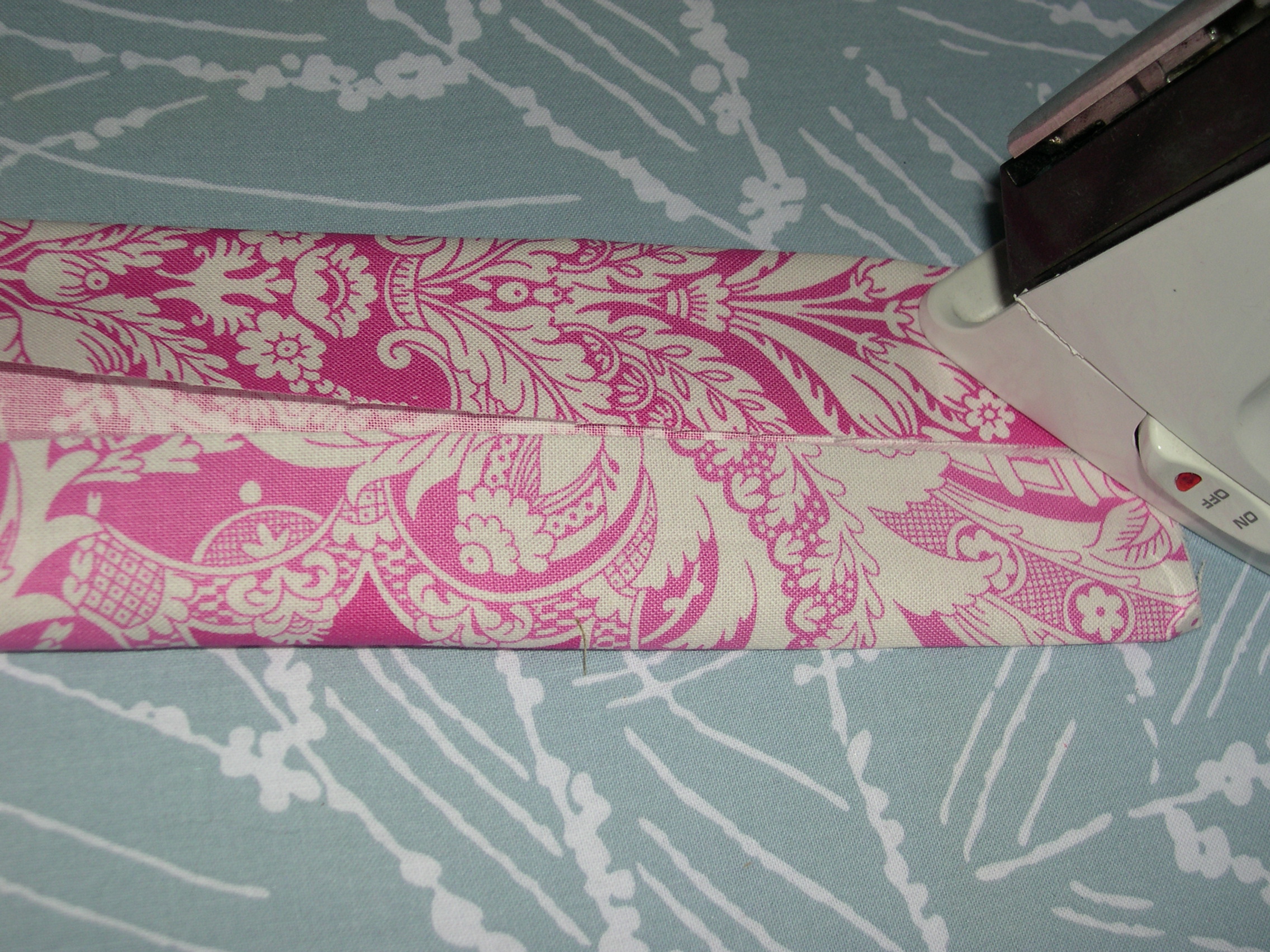 Fold one of the strap fabrics in half, wrong sides together and press. Open and fold raw edges toward center fold and press.