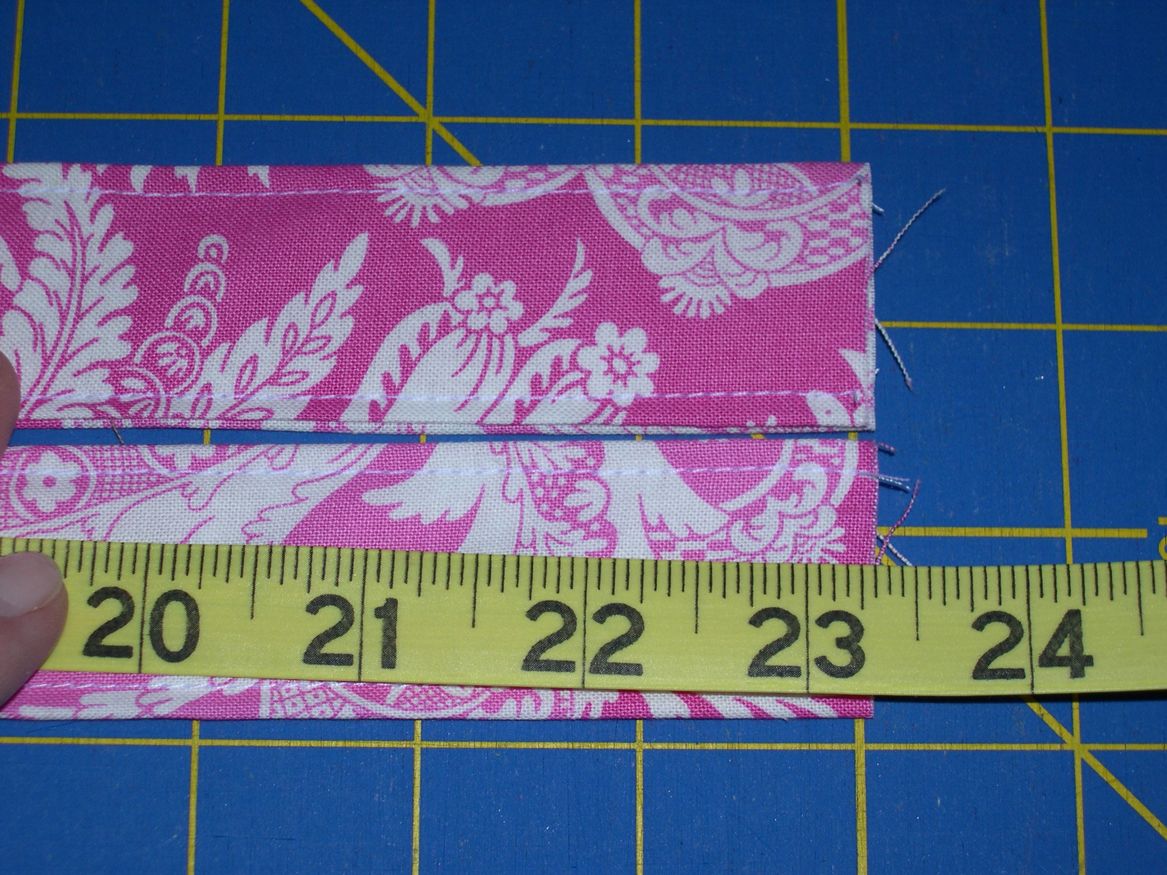 Top-stitch on each side, about 1/8-inch from folds. Measure the straps to gauge the length. Mine came to about 23 inches long, which was fine for me.
