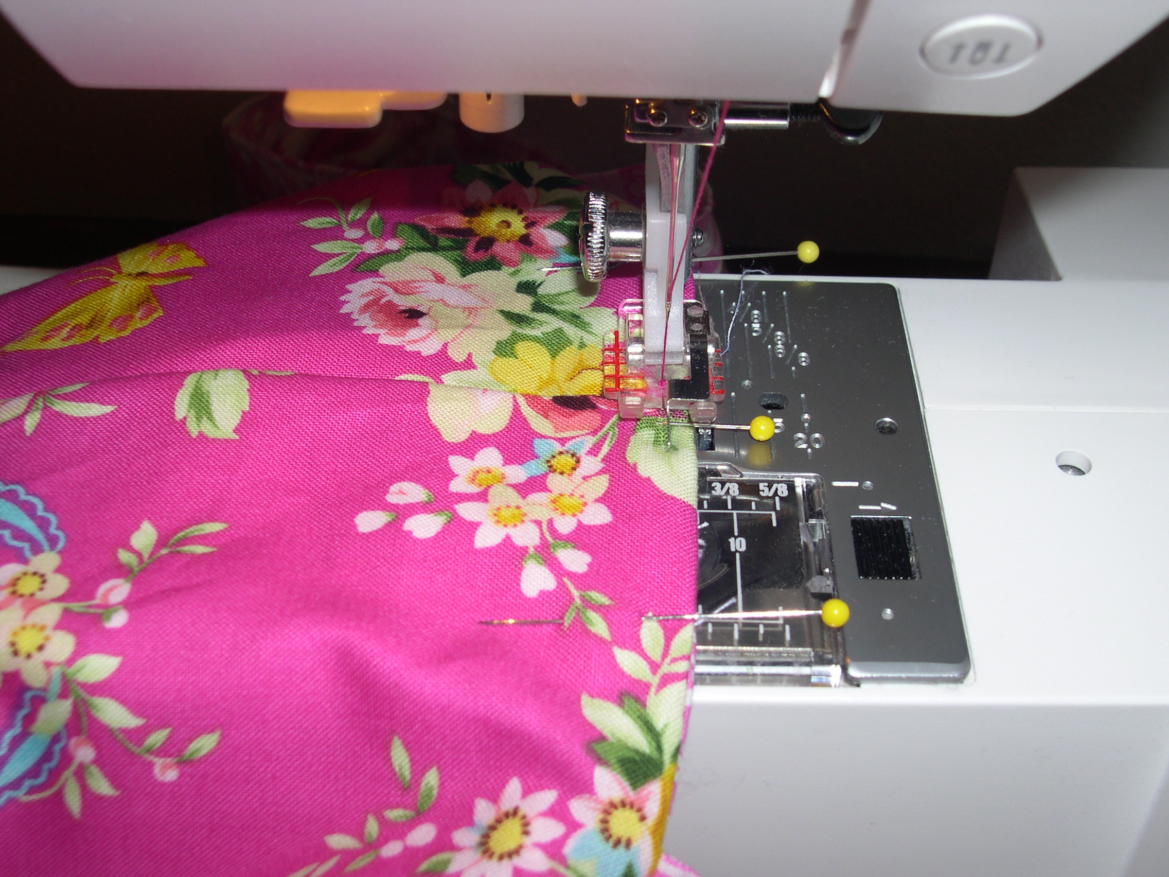 Insert the outside bag (which should be RSO) into the lining bag (which should be inside out), smoothing the layers together and making sure the handles are neatly tucked in between the two bags. Pin, pin, pin. Sew the two layers together with a 1/4-inch seam.