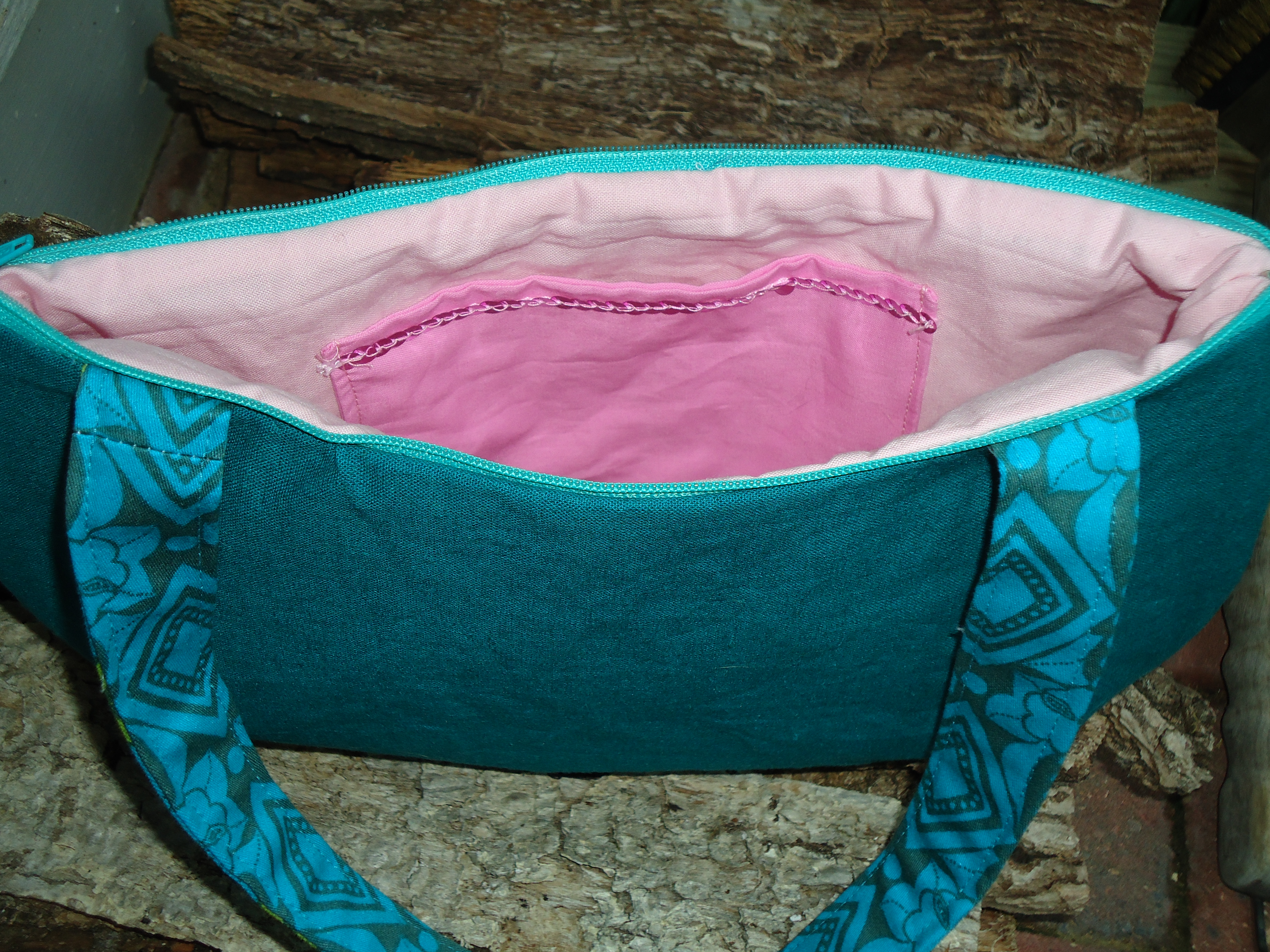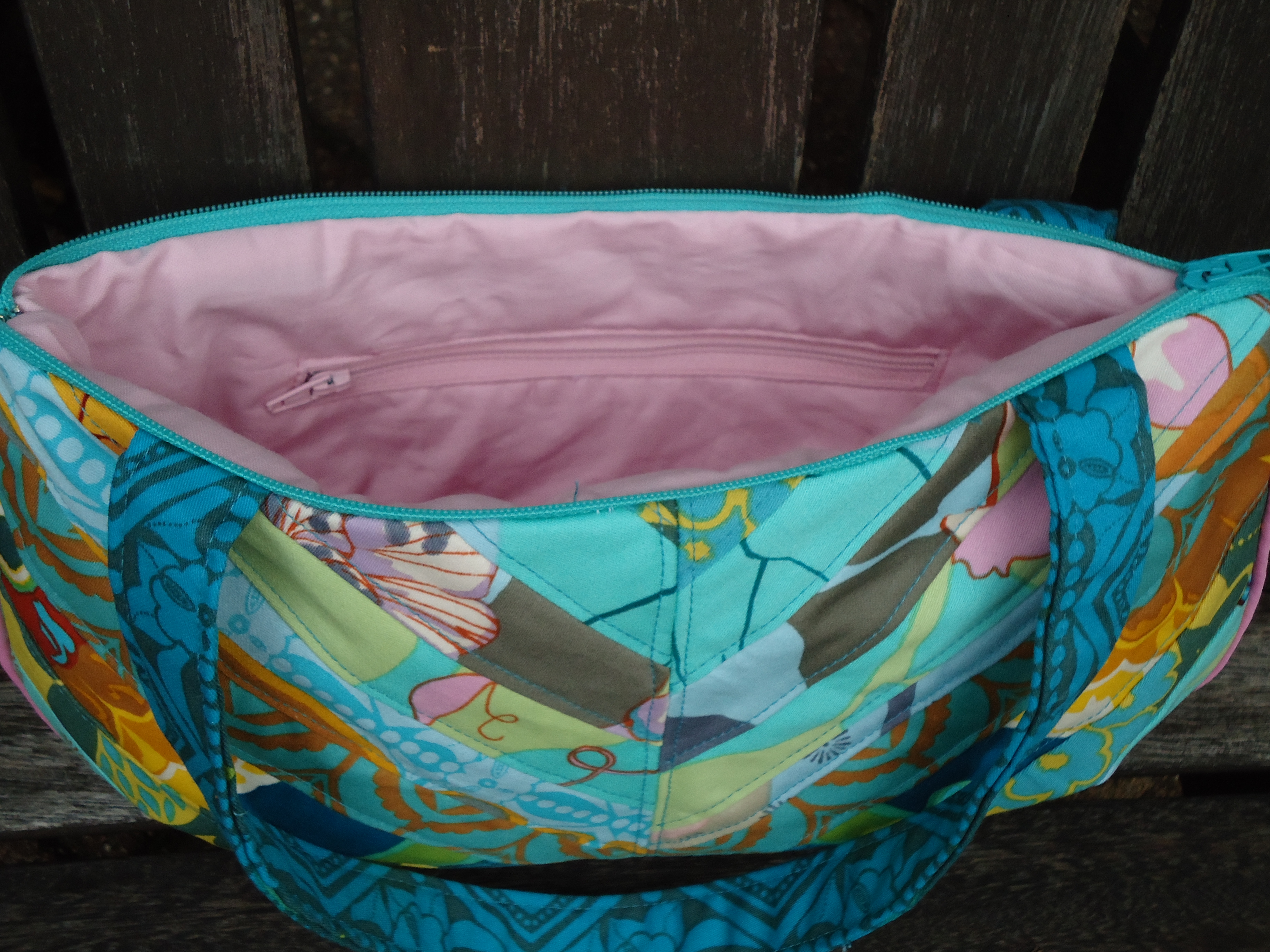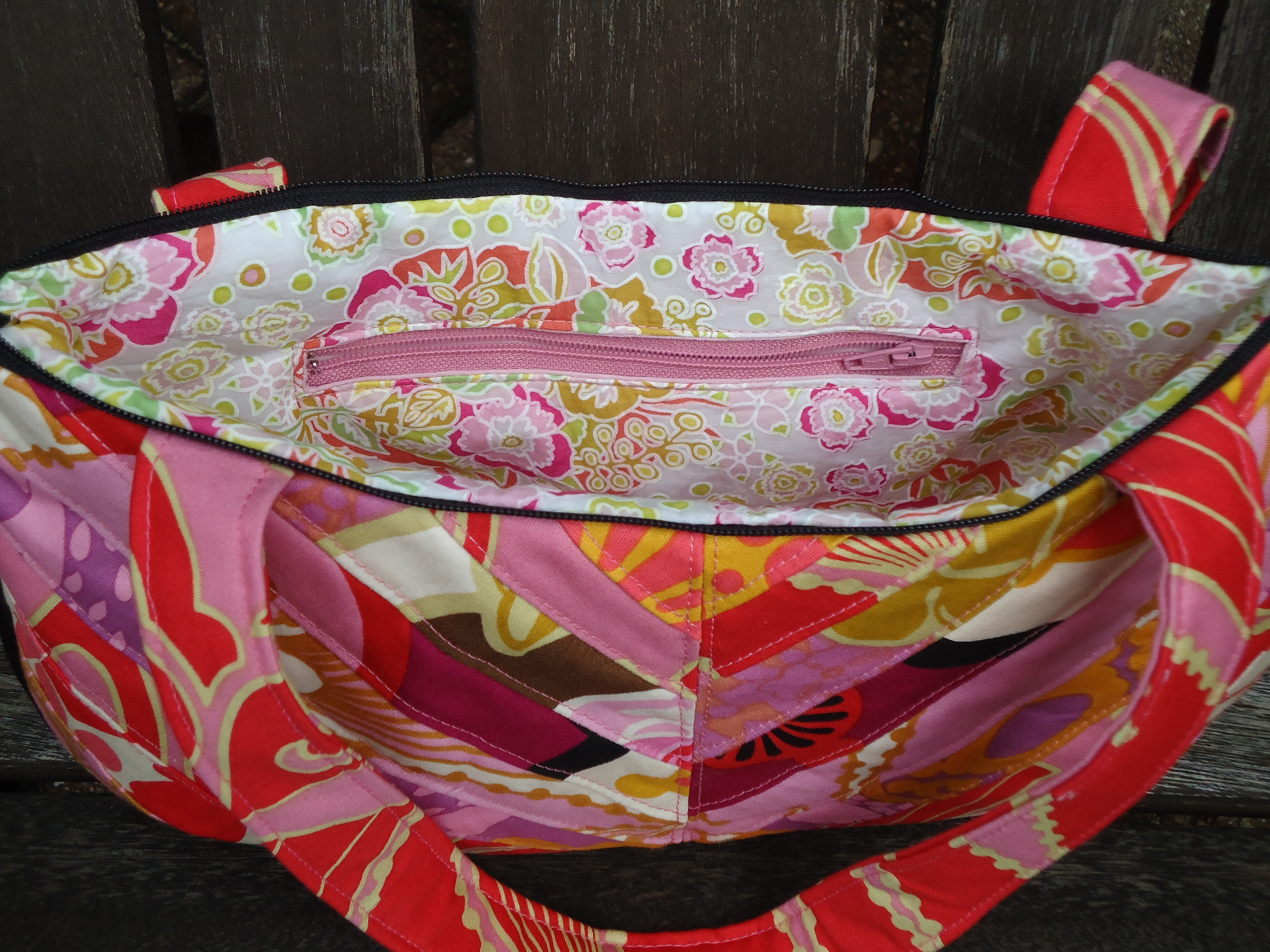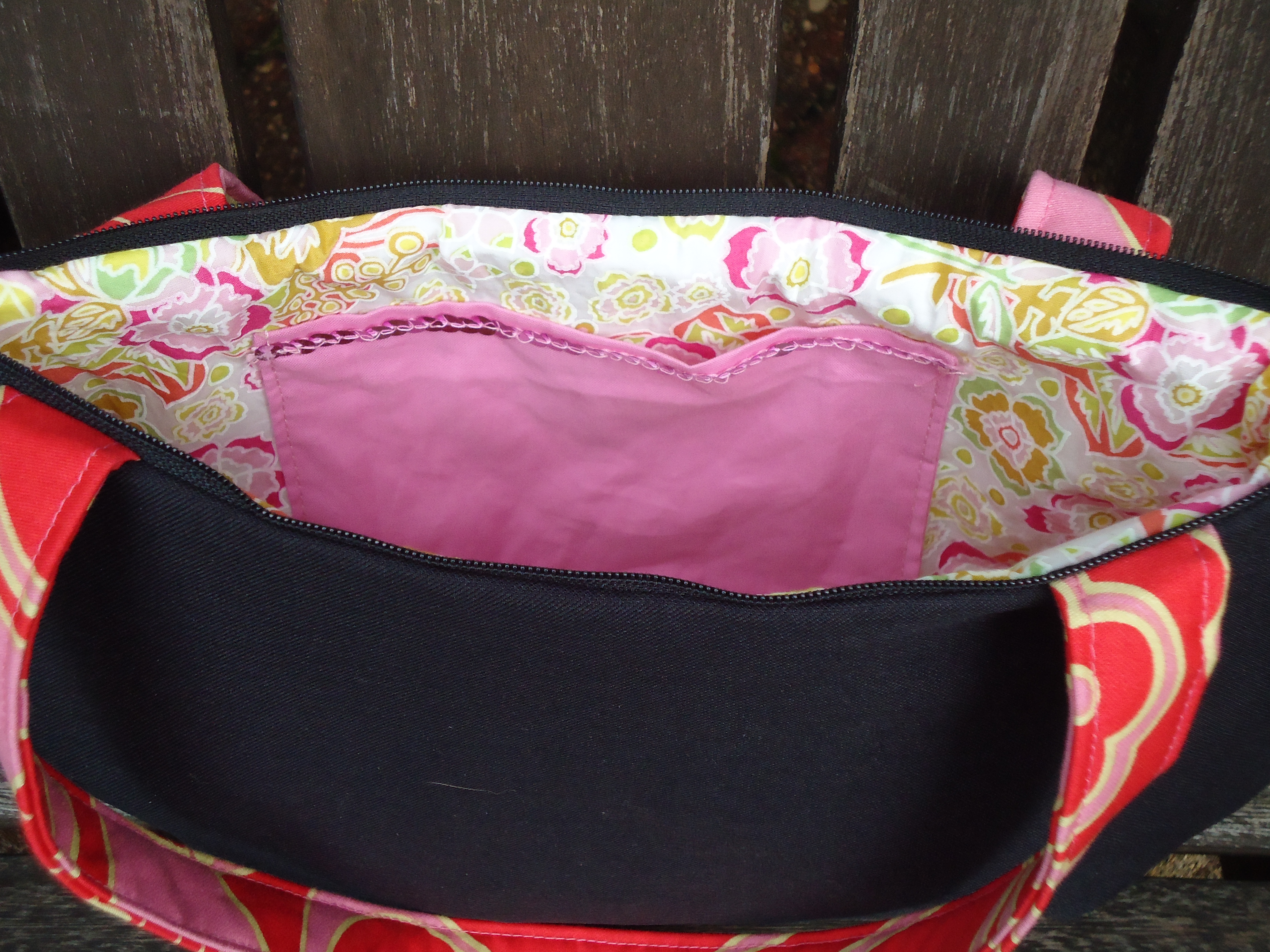 I love the pink zippered pocket on the inside, which I am getting better at installing.