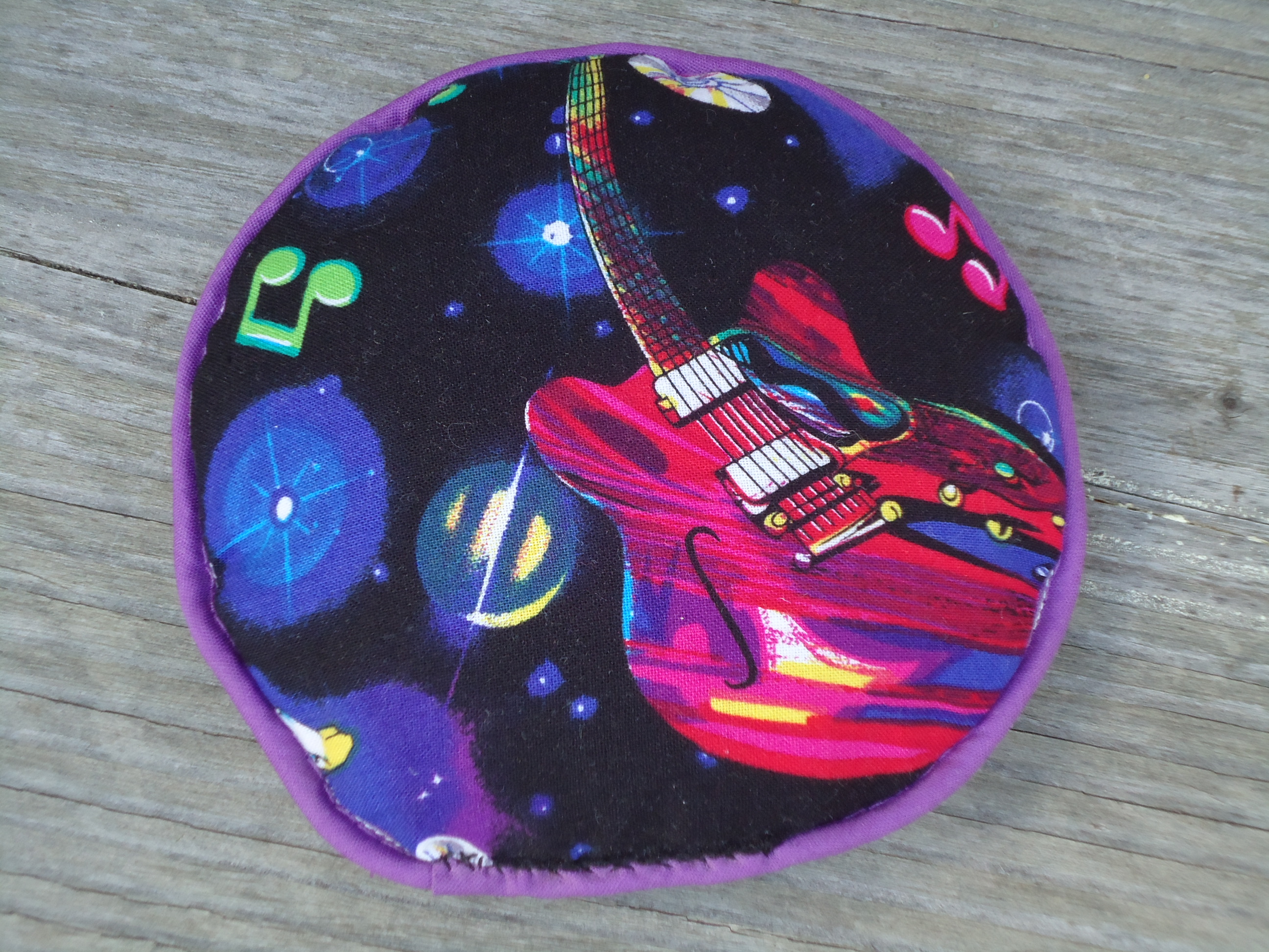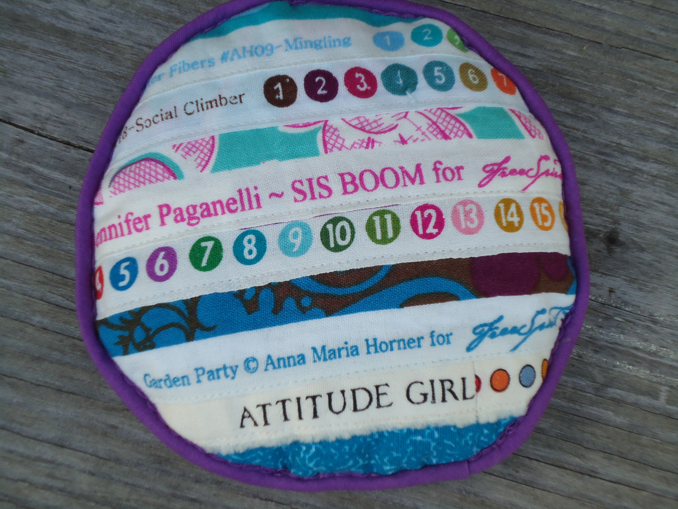 I recently sent her a package full of selvages I had been collecting for the past several years, so this was our trade. She knew the fabric designerslove, and she even included an appropriate saying at the bottom of the round. She knows I like rock music, so she picked out this awesome fabric for the back.
