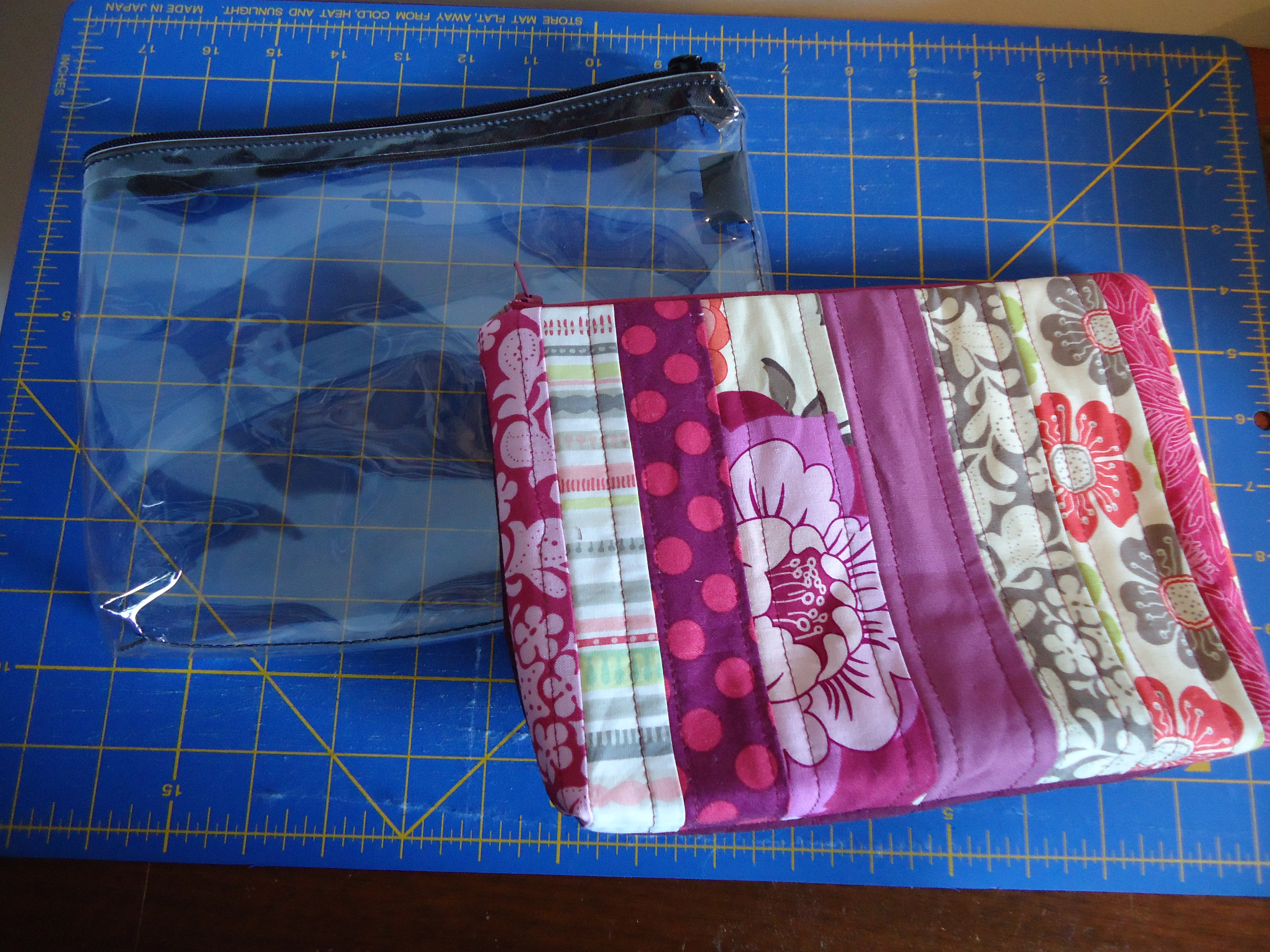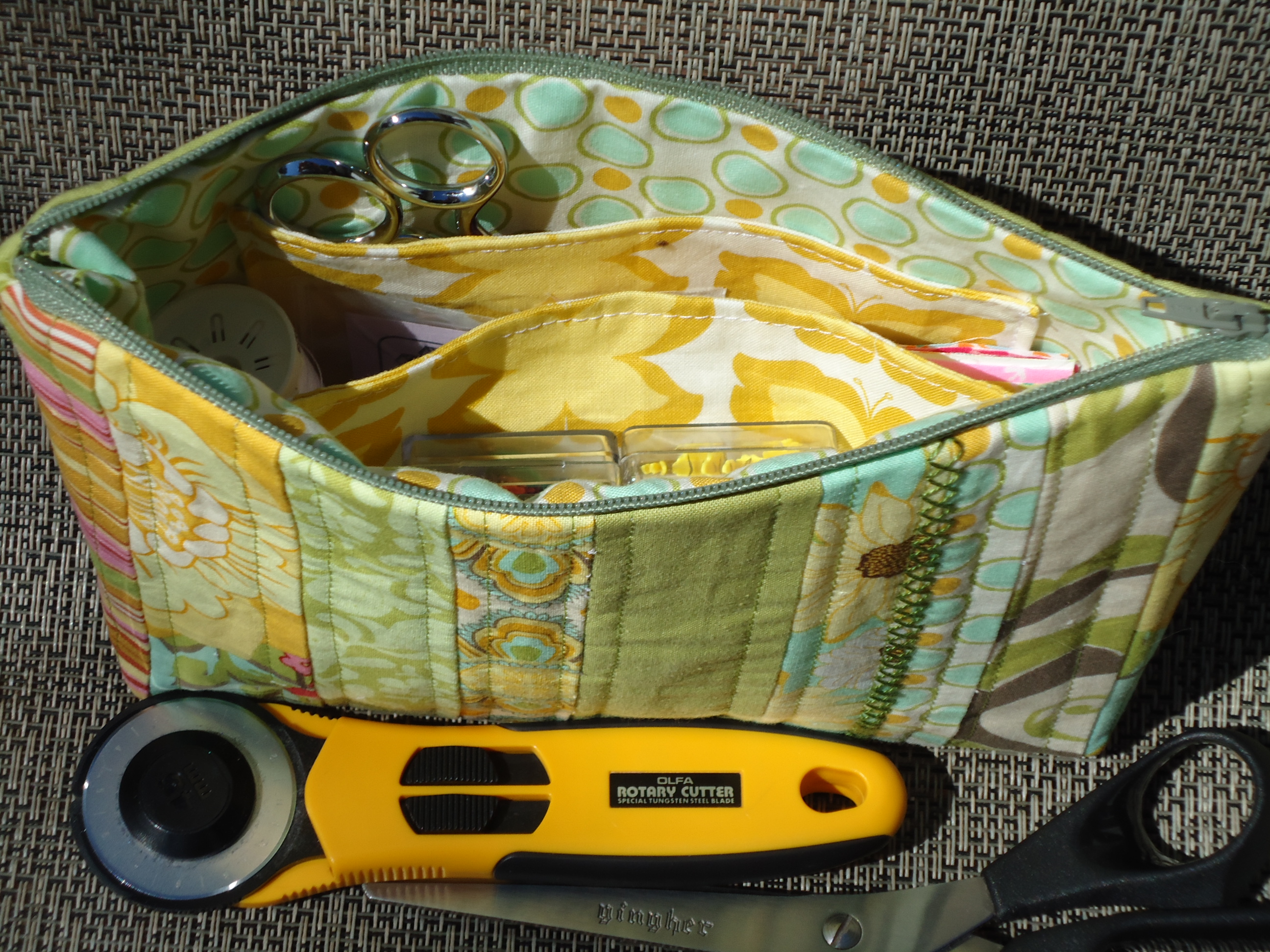 These project bags measure about 10 inches wide and 7 inches tall, perfect to hold your needle case, scissors, hand sewing supplies, rotary cutter or whatever you travel with,  and have a pocket inside to store your small, loose items like a box of pins or stitch markers for knitting.