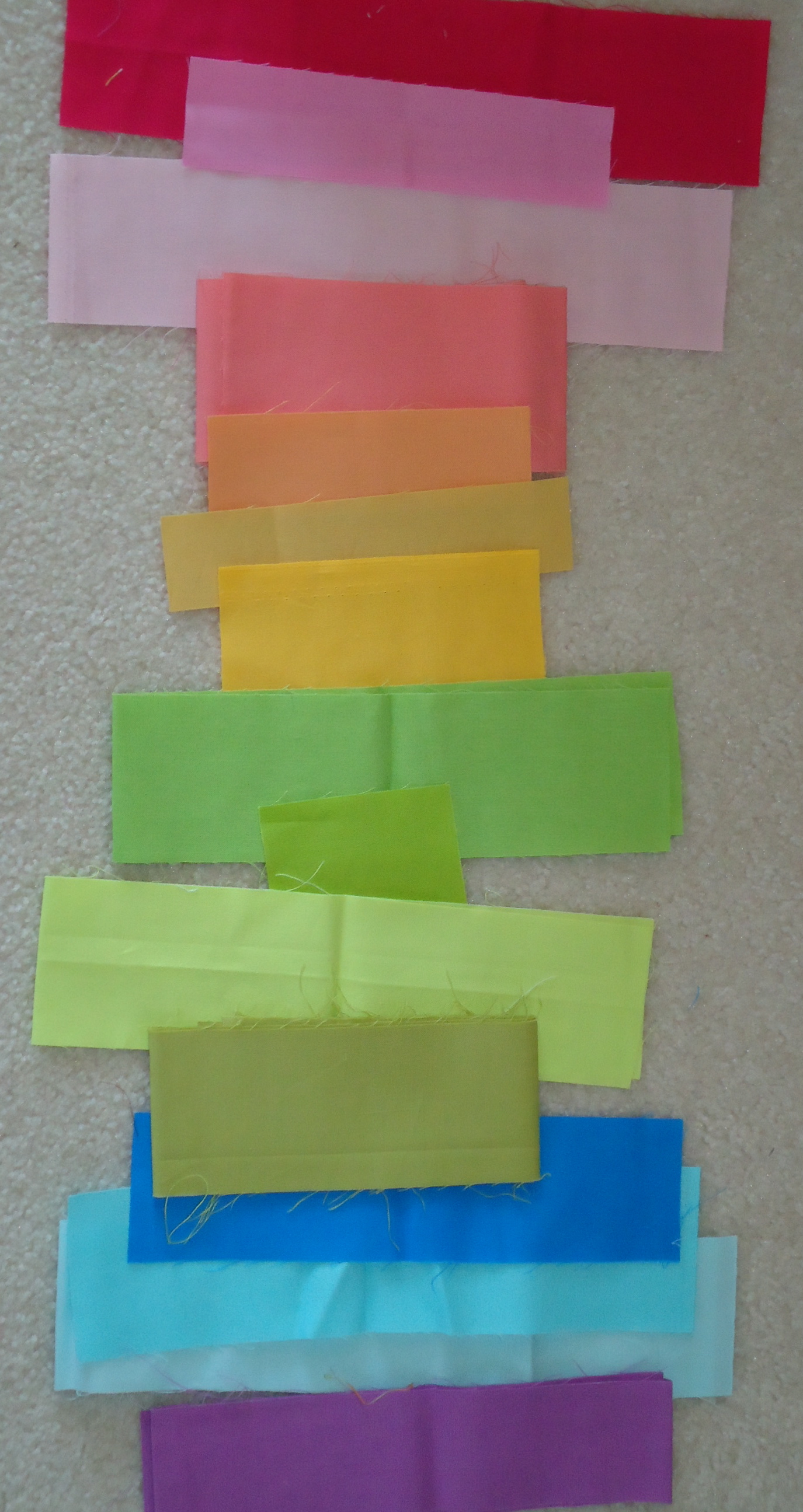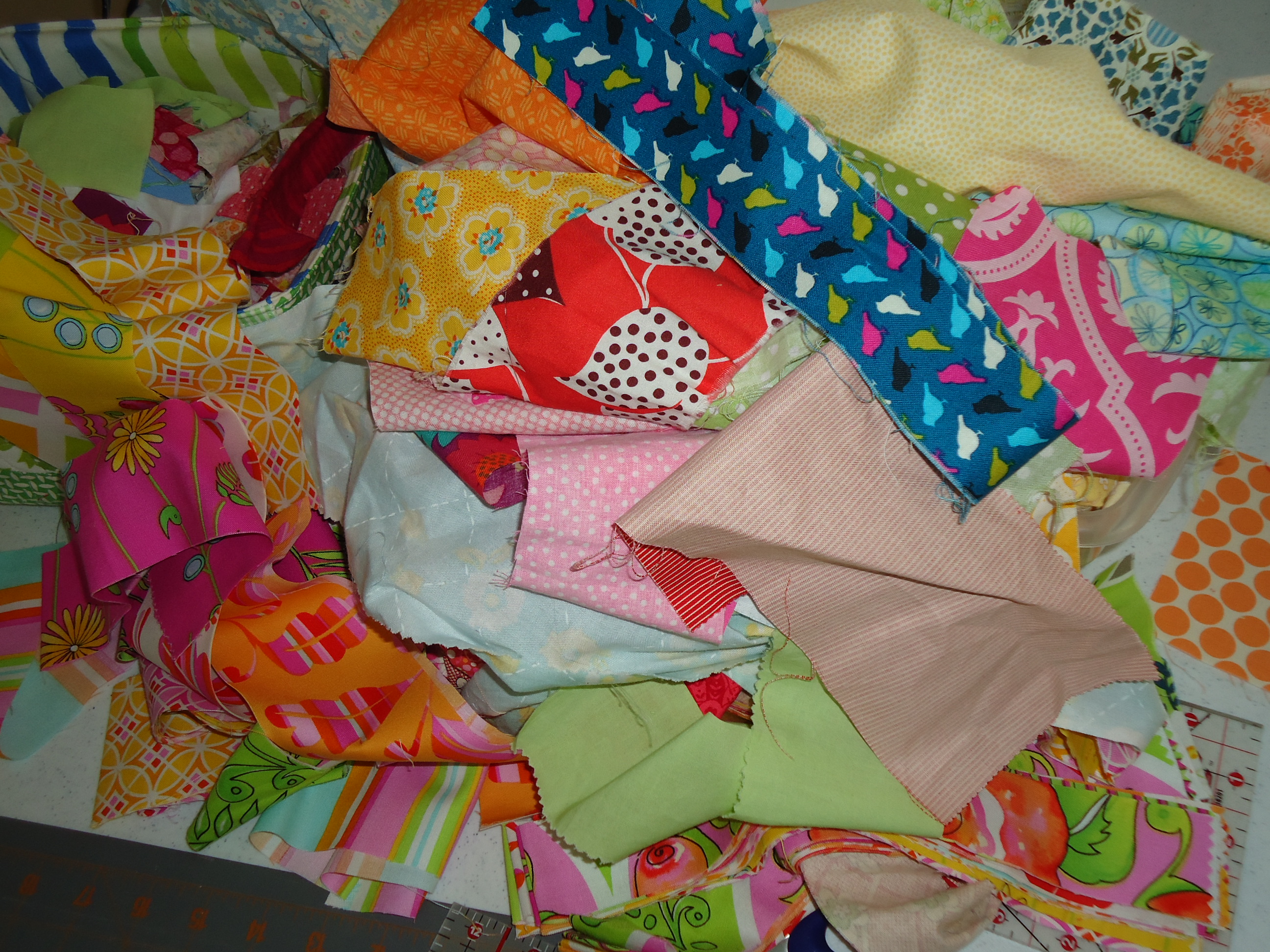 I posted on her blog that “I spied you in one of her pics” too:):) Ticker tape quilts ARE so much fun. Can’t wait to see what you do with that idea! Love the rainbow of scraps. They had Kona for $3.99 a yd down here in GA. I got some orange,grey and bone. Already plotting another quilt and I haven’t gotten through the sherbet yet:)–sigh…