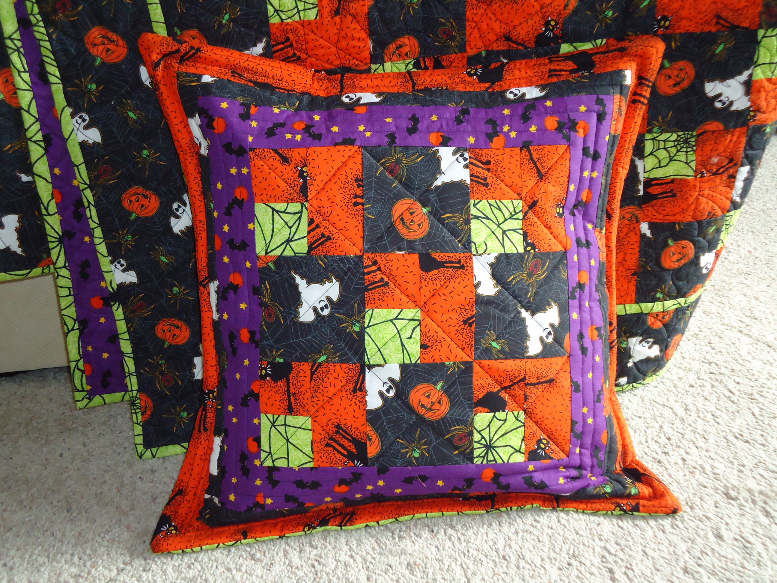 I found an orphan block in my stash leftover from the Halloween quilt I made for/with Dave. So I made a quilted pillow cover to match!