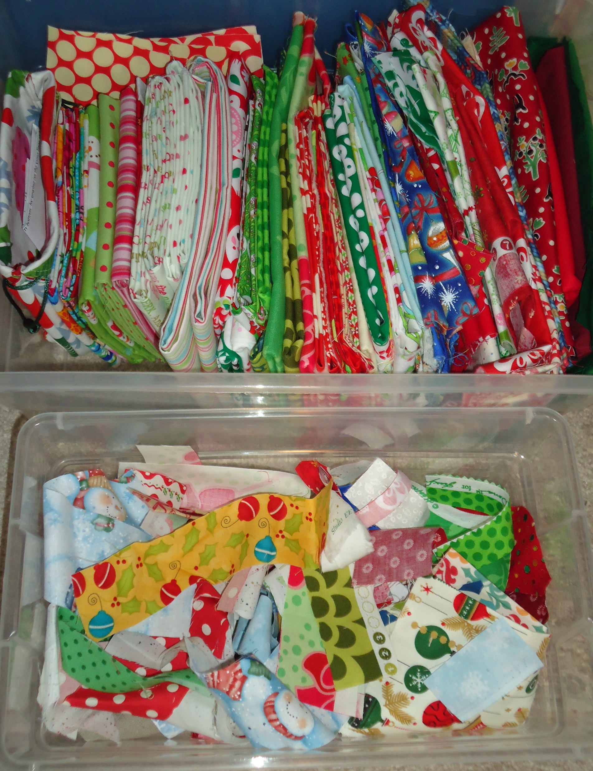 A bin for Christmas fabrics and a bin for Christmas scraps.