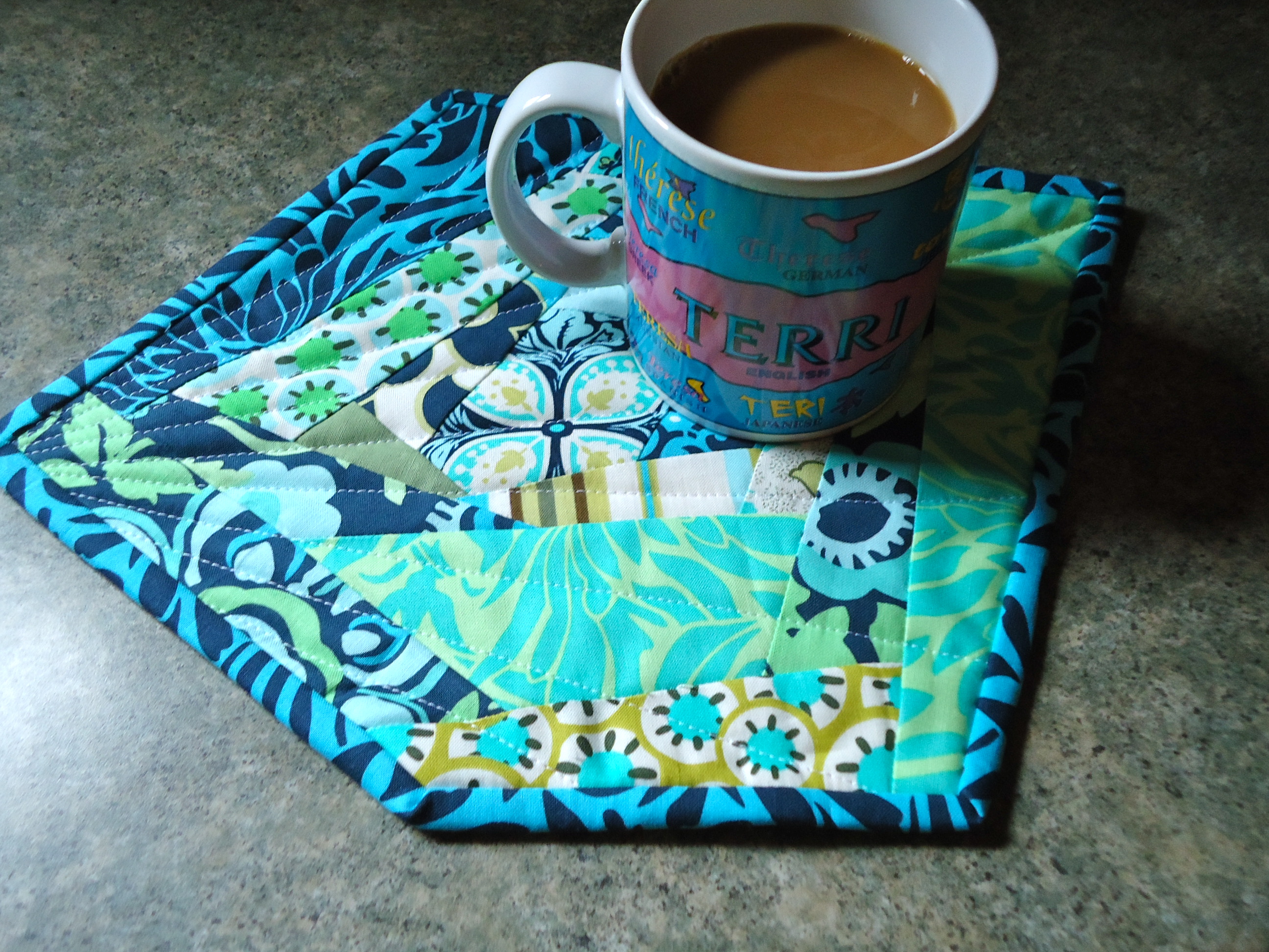 Anywayyyyyy I love your mug rug and what is that fabric in the picture at the bottom?? I really like the colors and designs.