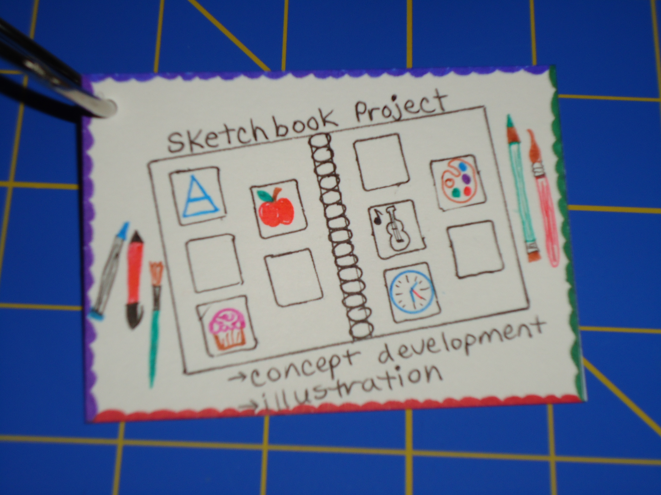 In Illustration class, we are working on The Sketchbook Project where we are going to be illustrating a subject we are passionate about all semester long (more on that later). For this journal page, I drew a mini sketchbook with silly thumbnail sketches.