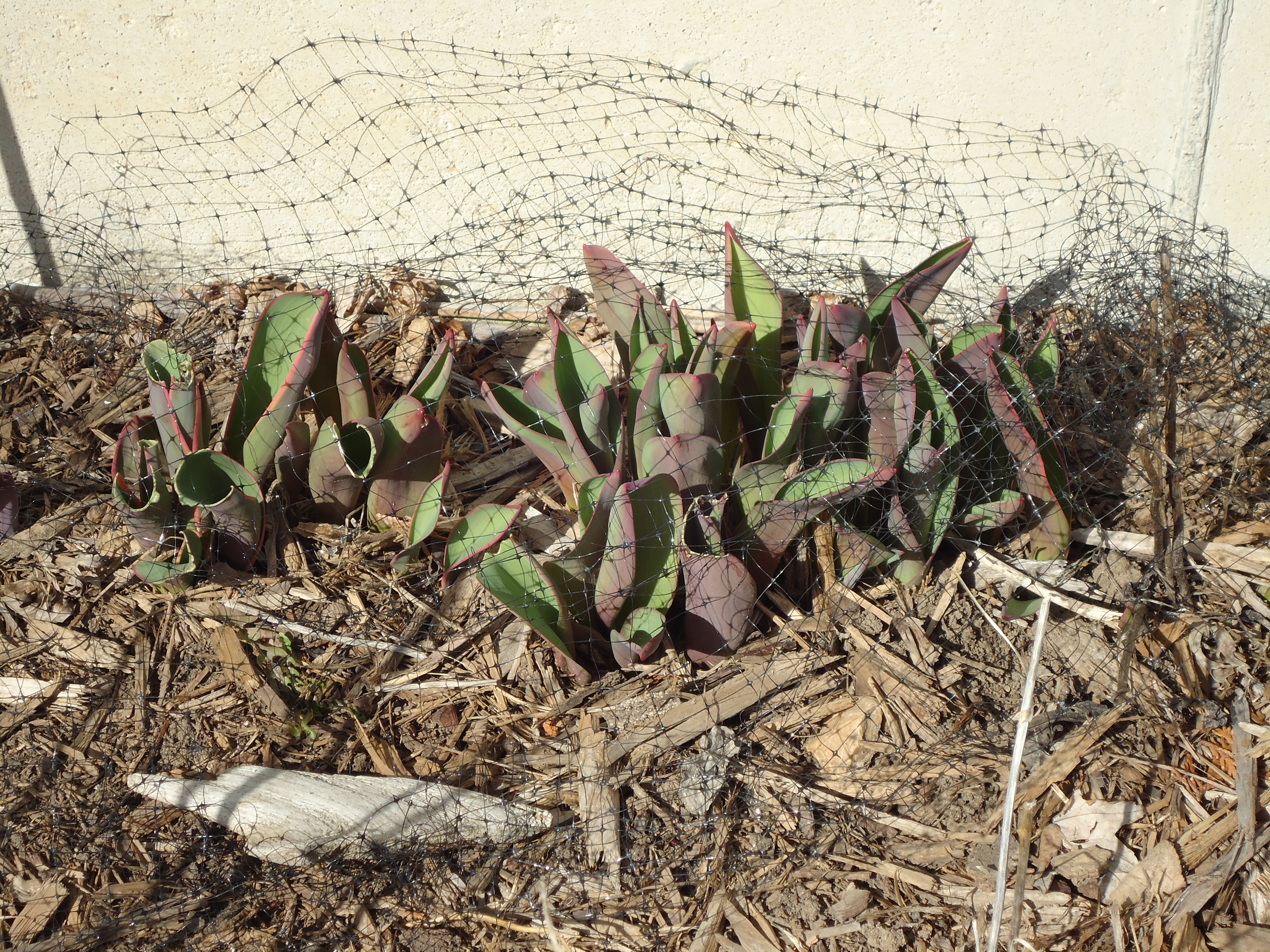 I found some tulips peaking up too, which the rabbits have been snacking on, so I covered these new shoots with mesh wire to keep those pesky rabbits from doing more damage.
