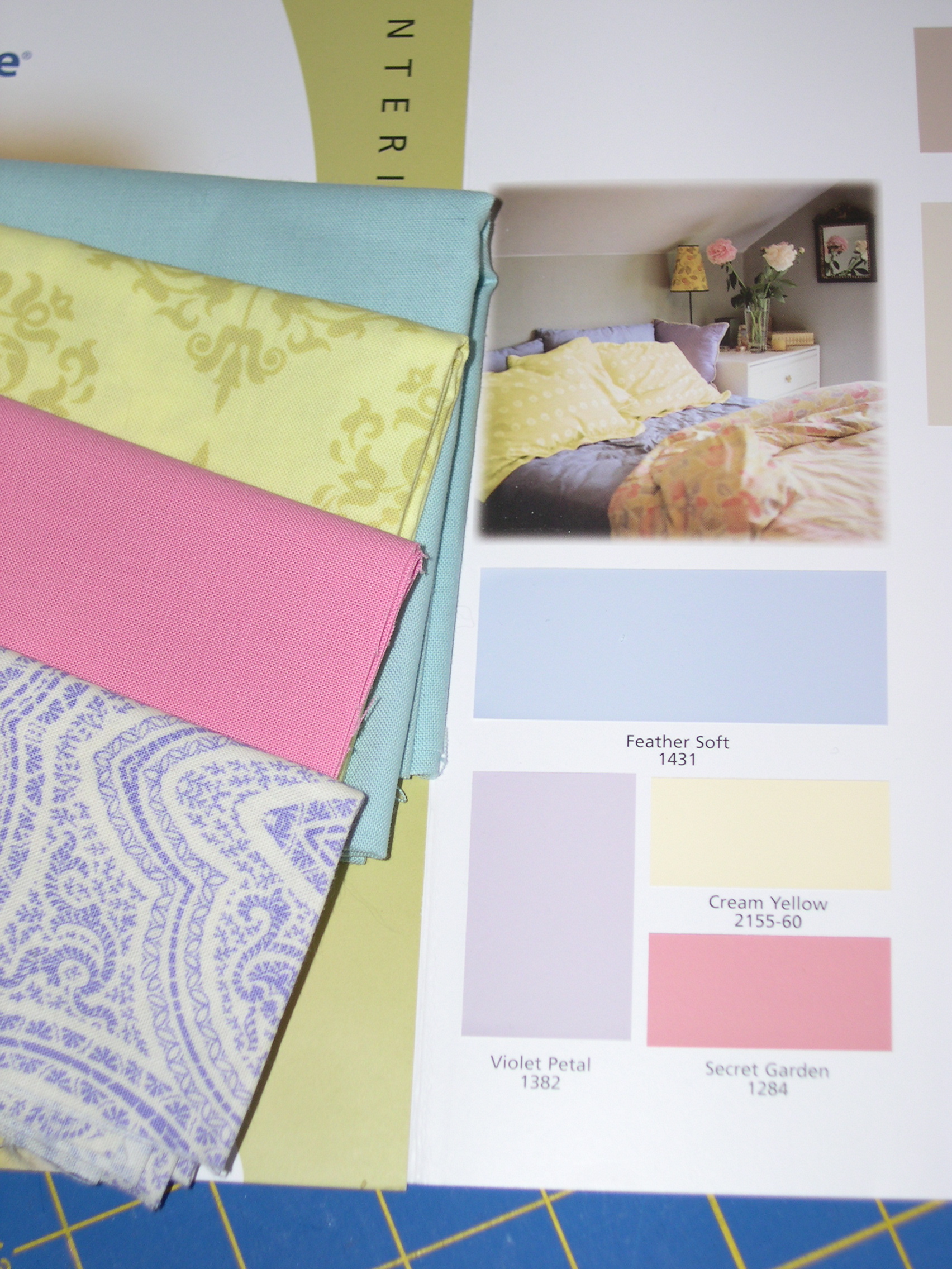 Here’s an example of a paint color scheme I like, and the fabrics I could match from my stash. Definitely a spring color combination.