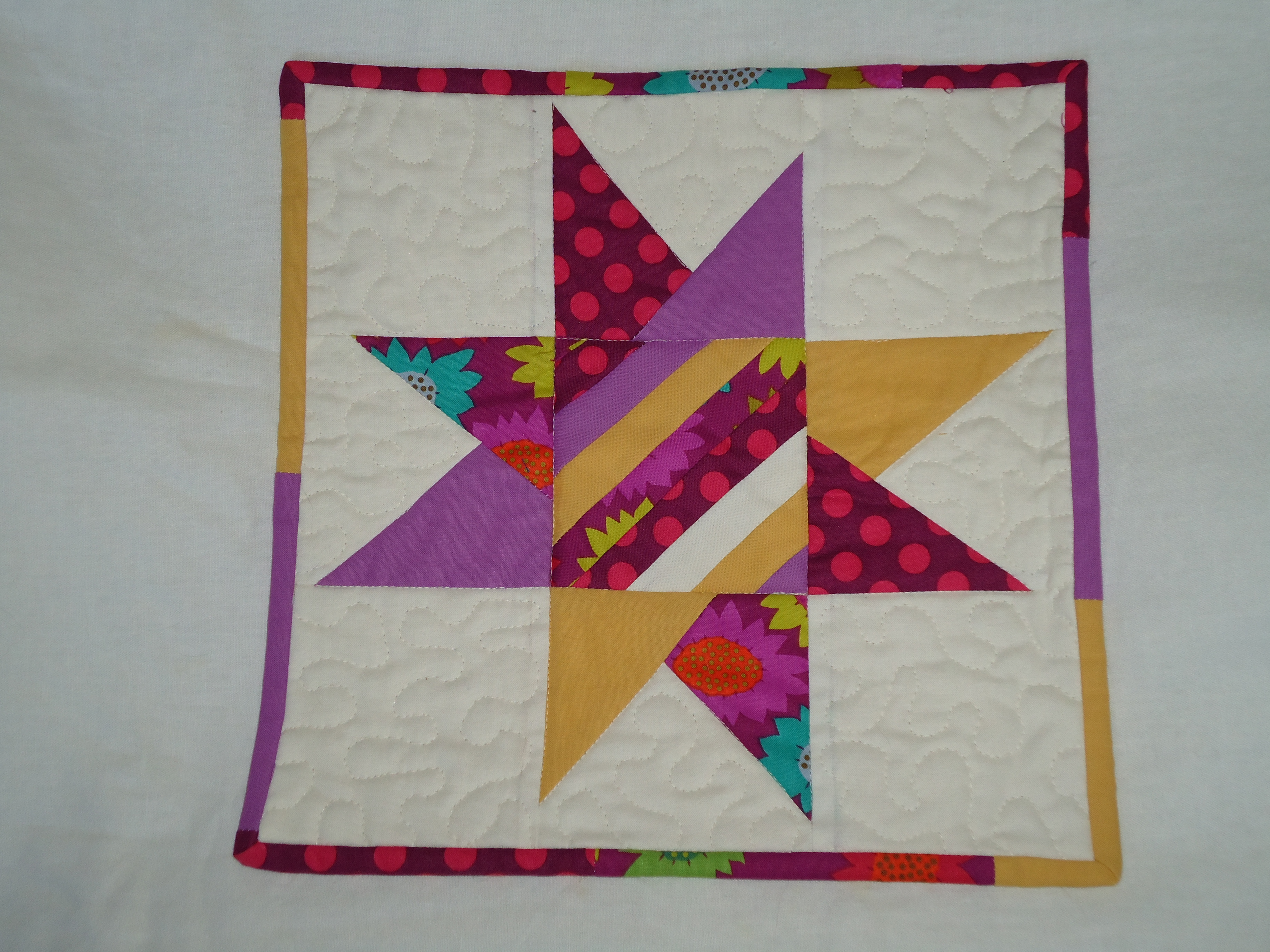 I made my favorite block, a wonky/maverick star, into a mini quilt with these colors. I’m not a big fan of yellow, so I did a string-pieced center to ensure these colors could take turns being next to each other. I also did a scrappy binding which frames this star nicely. This was a fun exercise because I love how this combo turned out!