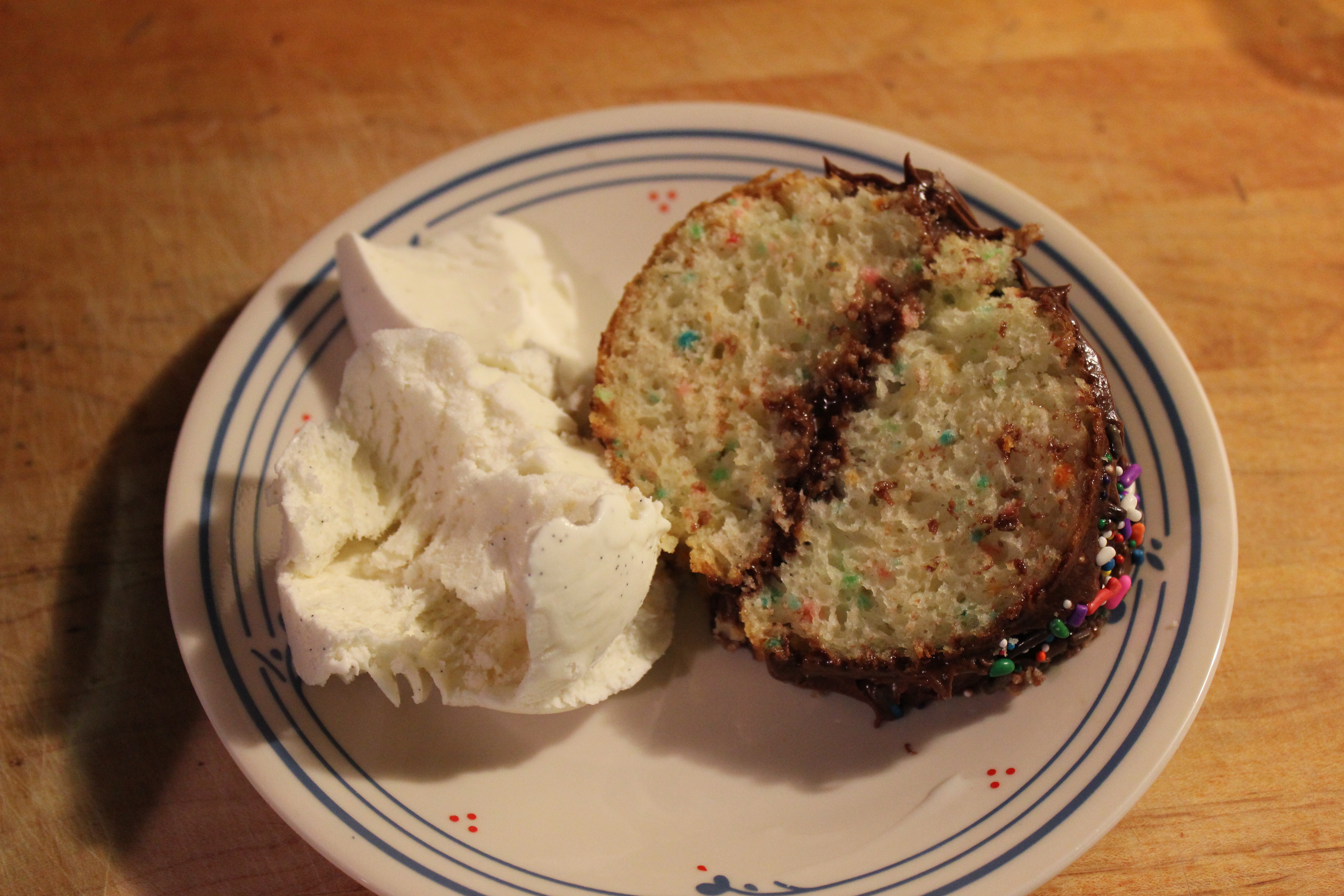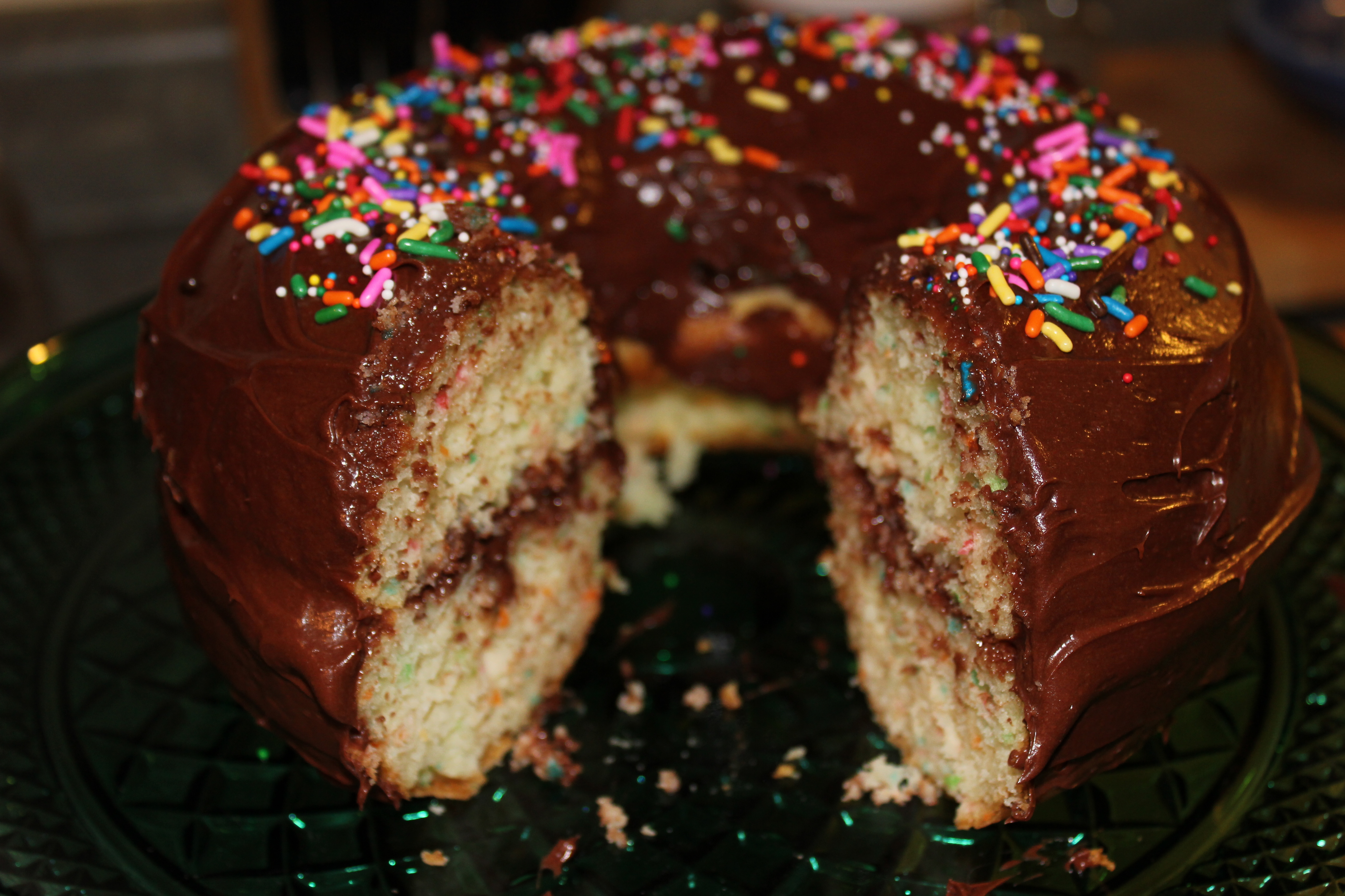 I think the highlight of our baking endeavors was the confetti cake we made in our giant donut cake pans on Saturday night. I say we because we made it together: I baked the cake and Dave frosted it. He likes to do that part.