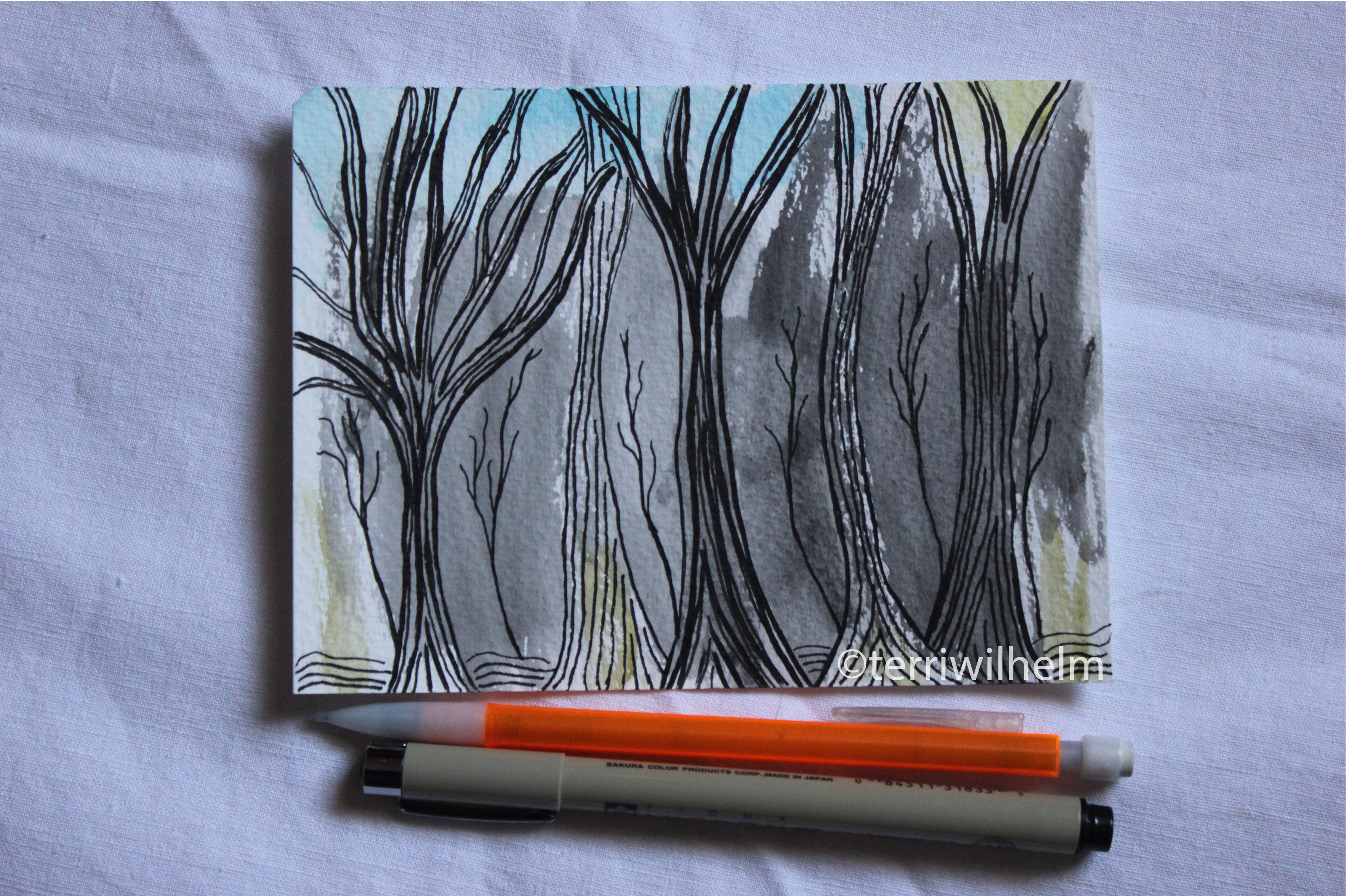 I did this next illustration on a piece of scrap watercolor paper roughly the size of a postcard. I just swept some watercolor paint across, let it dry, and let it simmer for a few days until I could see an image emerge.
