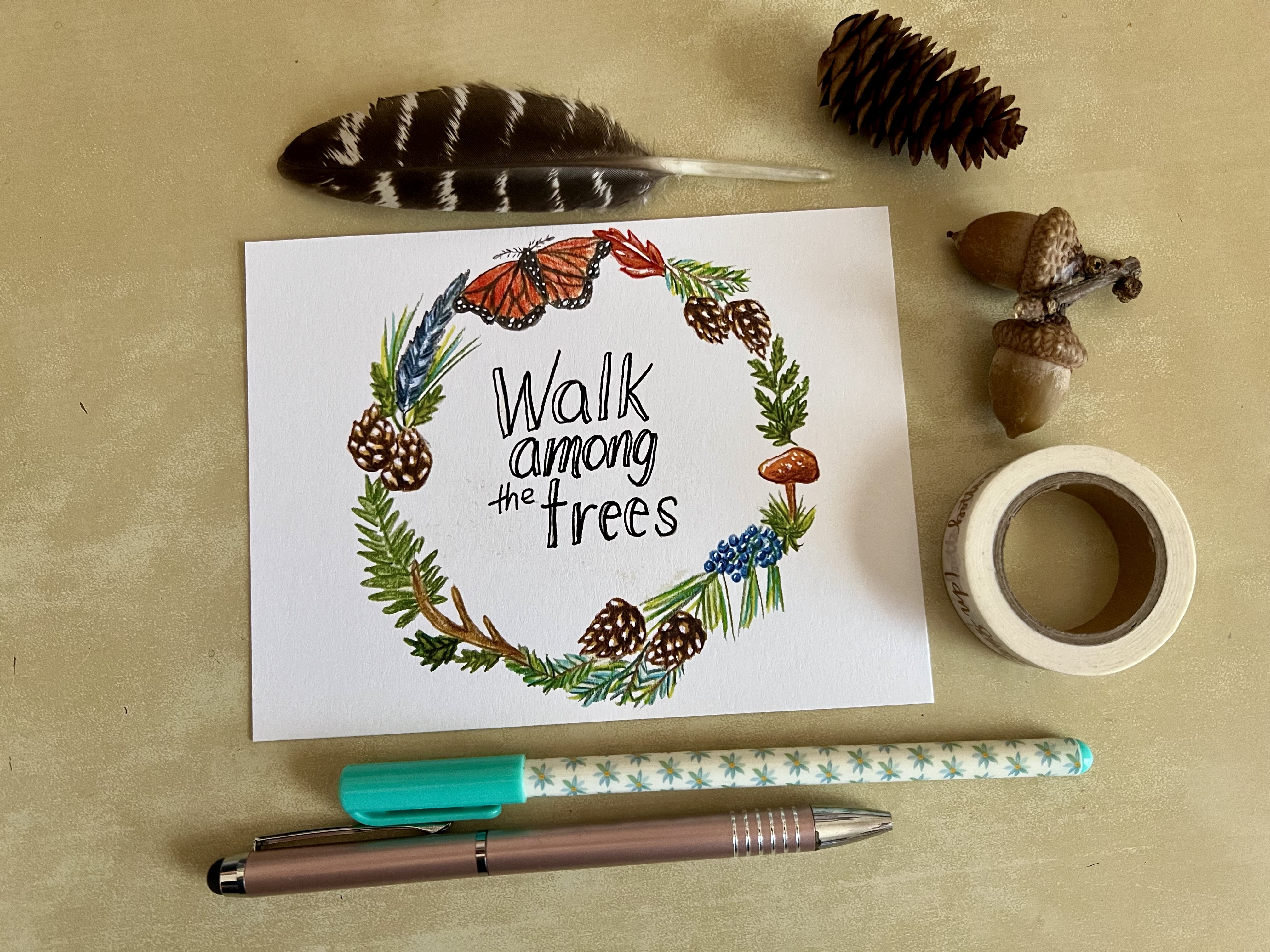 In Module one, our mission was to design a mood board to reflect the inspiration for a collection of patterns we are going to illustrate and design. I love to create whimsical, story-filled wildlife illustrations inspired by the wonder and diversity of the natural world. So my mood board is filled with my own photos I’ve taken on many trails, a trail map from a local forest I love to hike through, color swatches I painted with colors I use frequently in my artwork, trail treasures I’ve collected, and one of my own wreath illustrations. My husband said: “that looks like you!”