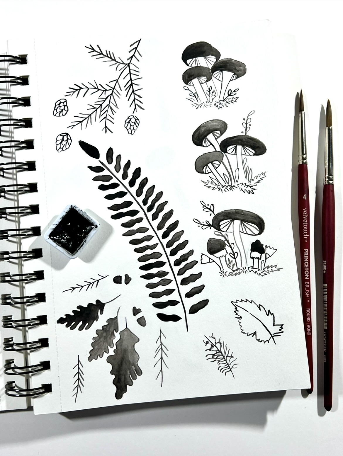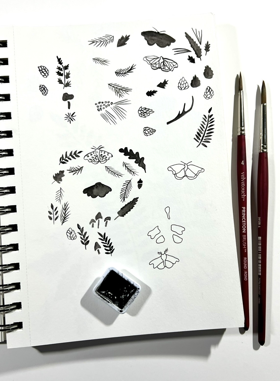 A few pages of motif sketches. Inspired by forest trails, evergreen botanicals and the magic of slow forest wandering. Earthy textures, delicate natural elements, and whimsical details to create a serene cozy aesthetic roosted in quiet emotion, connection to nature and storytelling – some of my favorite things!