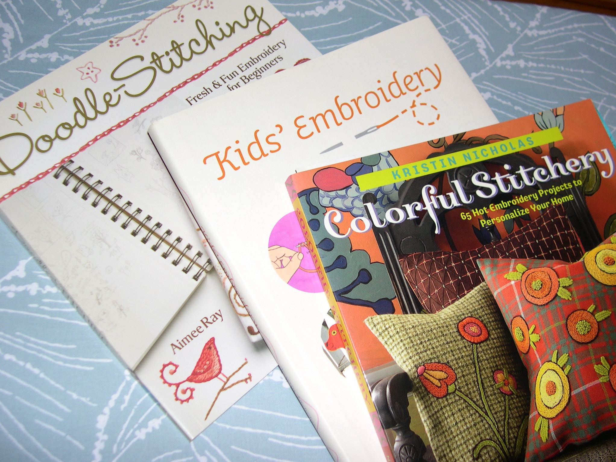 (Doodle Stitching by Aimie Ray, Kids Embroidery by Kristin Nicholas, and Colorful Stitchery by Kristin Nicholas)