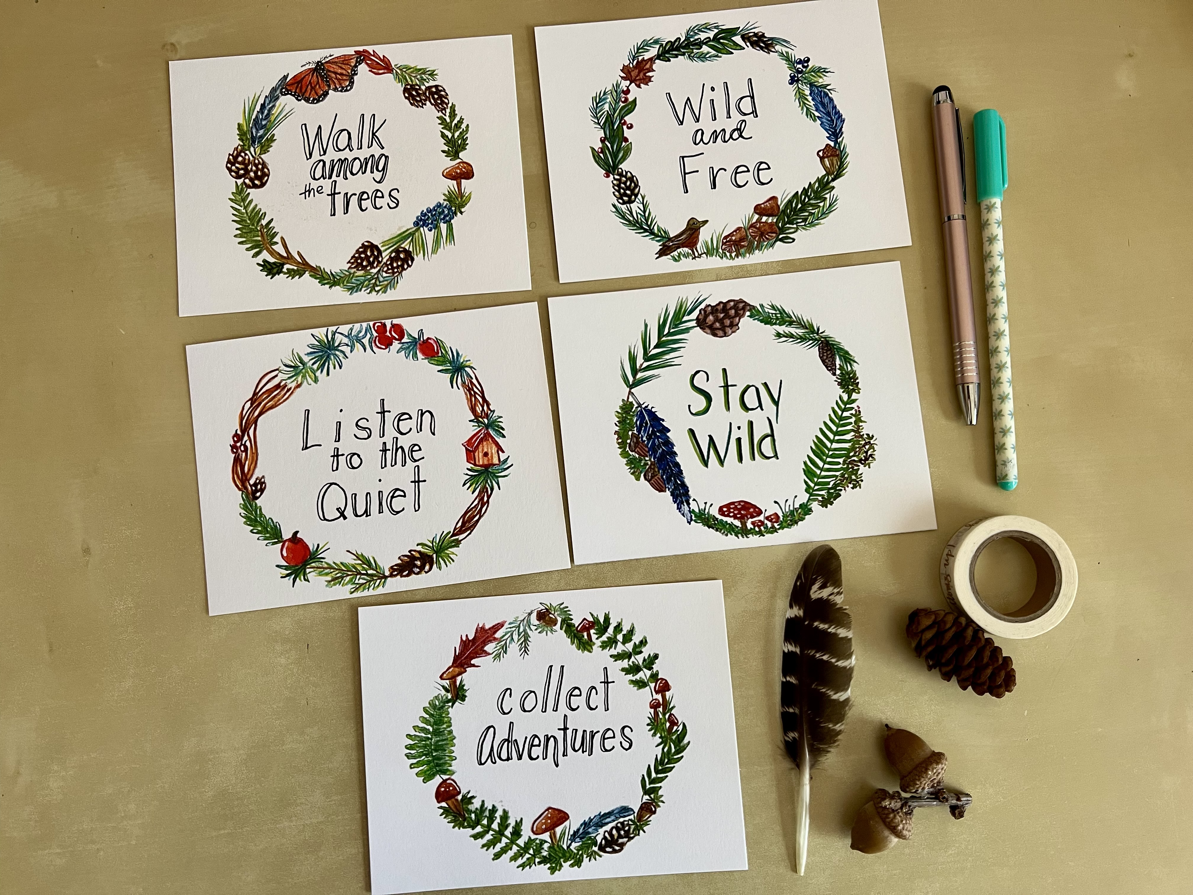 In between working on my weekly sketchbook pages of animal art illustrations, and trying to create something everyday, I’m also having fun practicing hand lettering combined with watercolor wreaths. I turned these watercolor postcard paintings into new notecards in my Etsy shop.