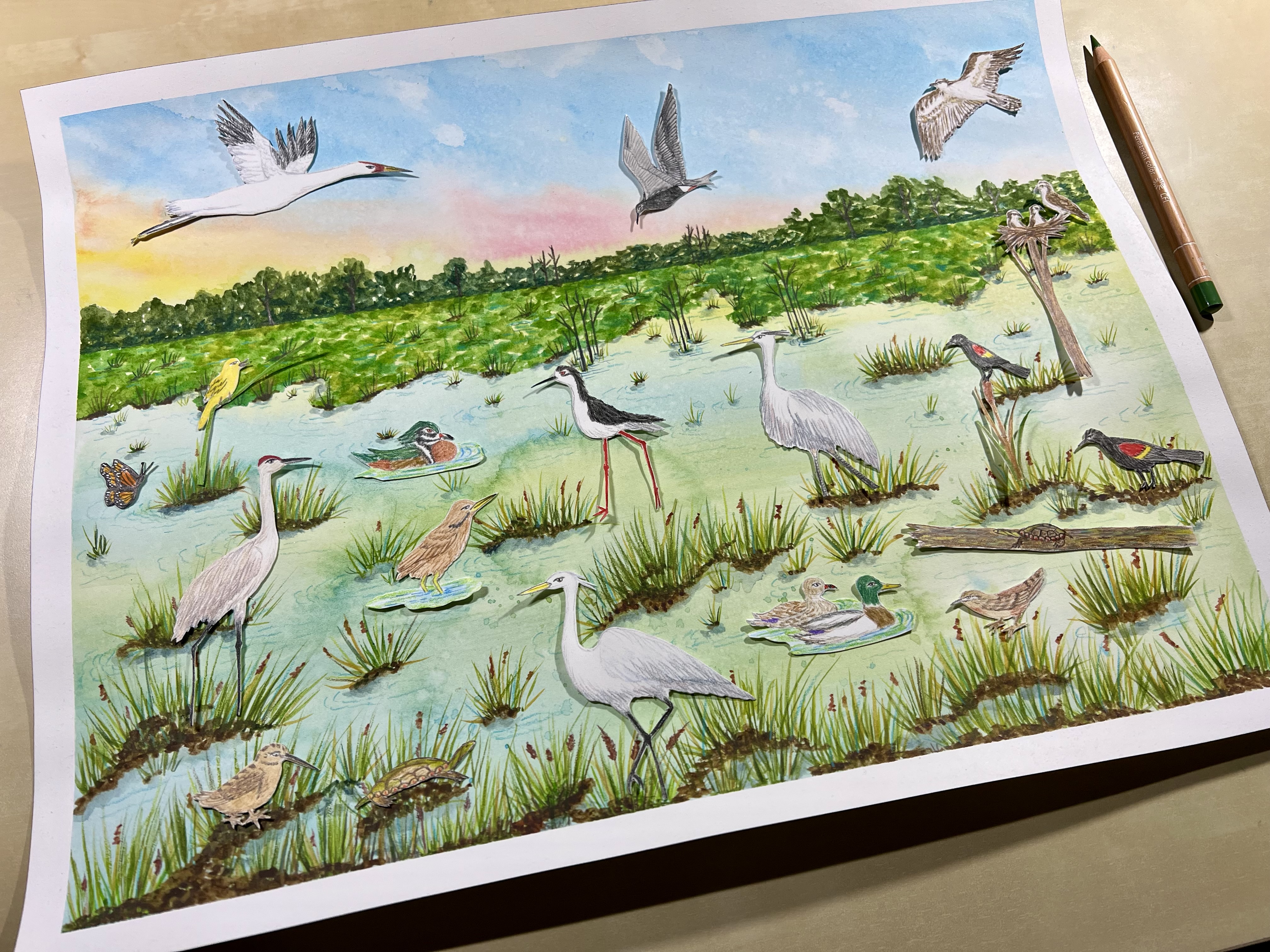 Then I illustrated the marsh background on a large piece of Arches hot press watercolor paper with watercolor and colored pencils.
