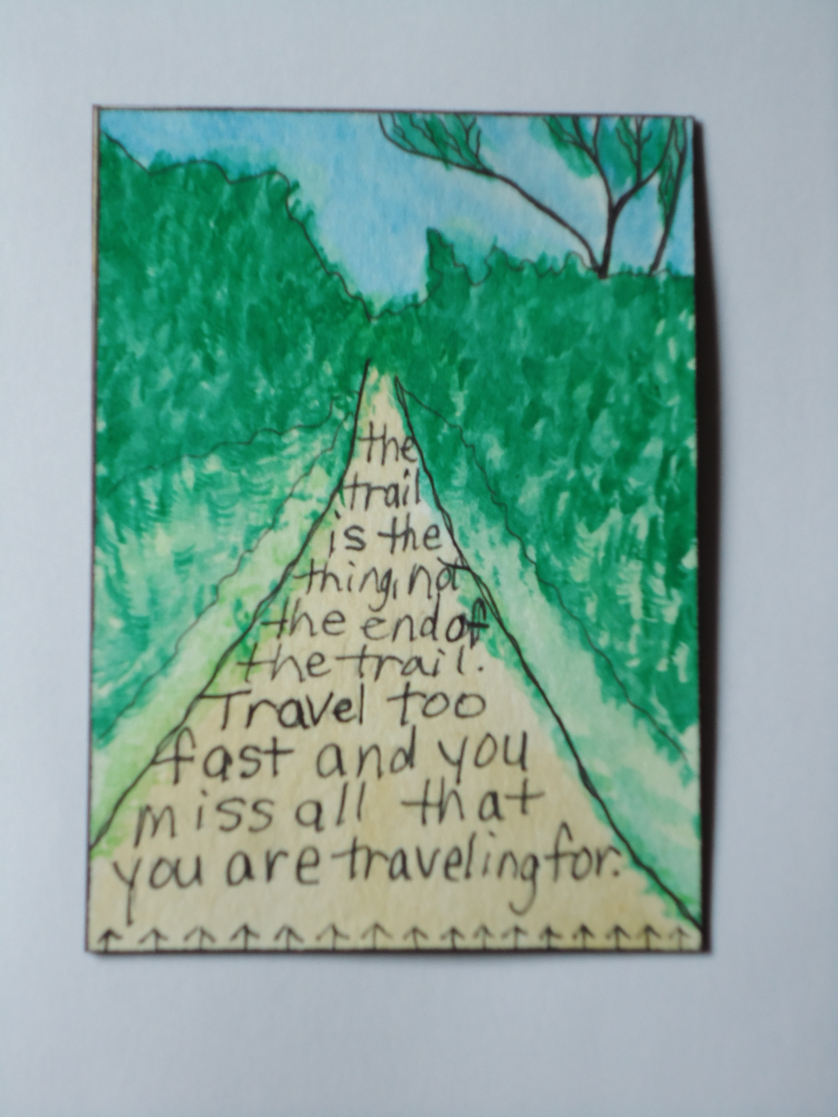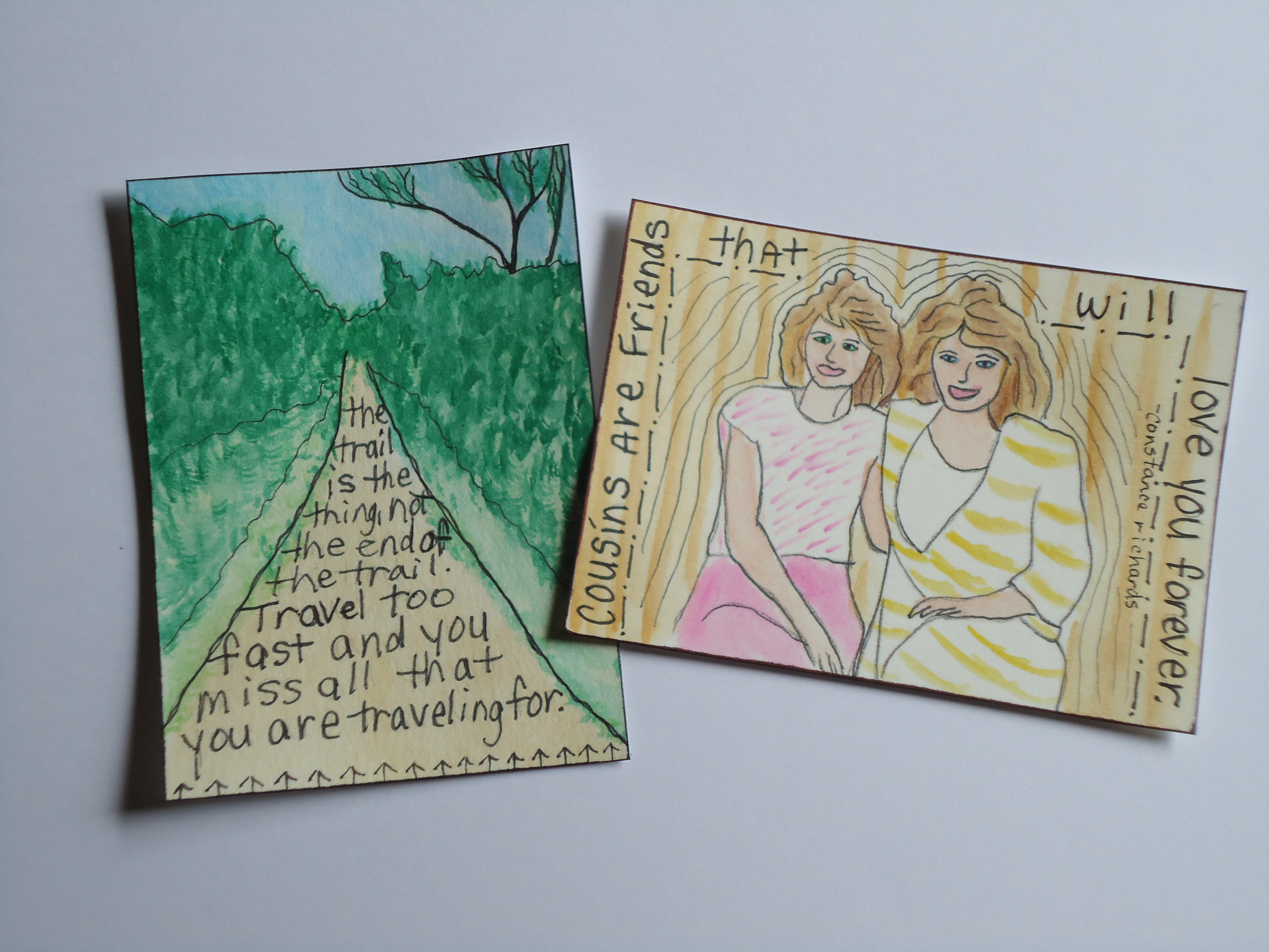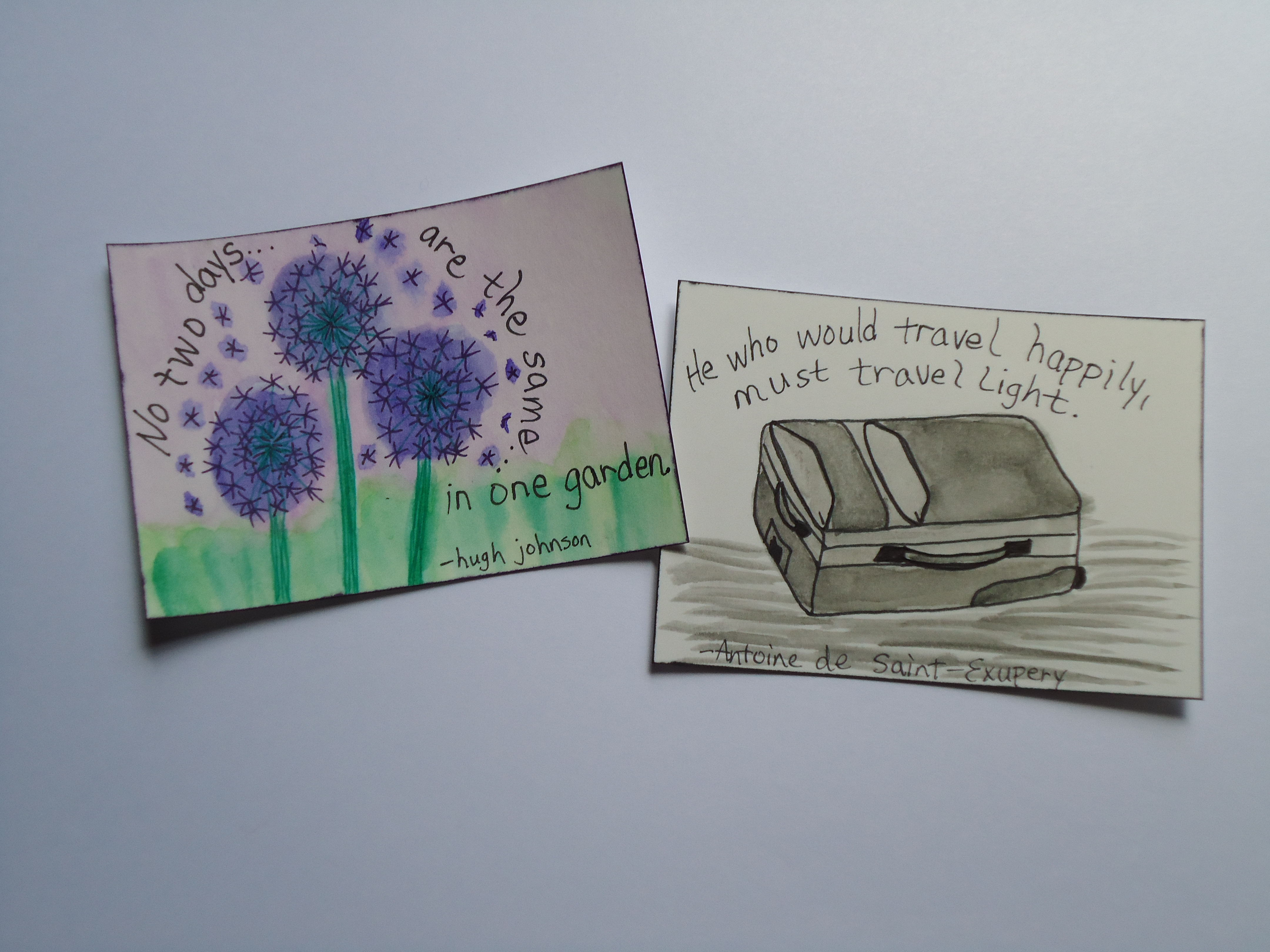 I didn’t do anything significant last week, other than apply for jobs and make a couple new bags. We had a really big thunderstorm come through our area that caused the power to go out for several hours. That would have made cool inspiration for a set of art cards, but I didn’t think about that idea until I started writing this post. Doh!
