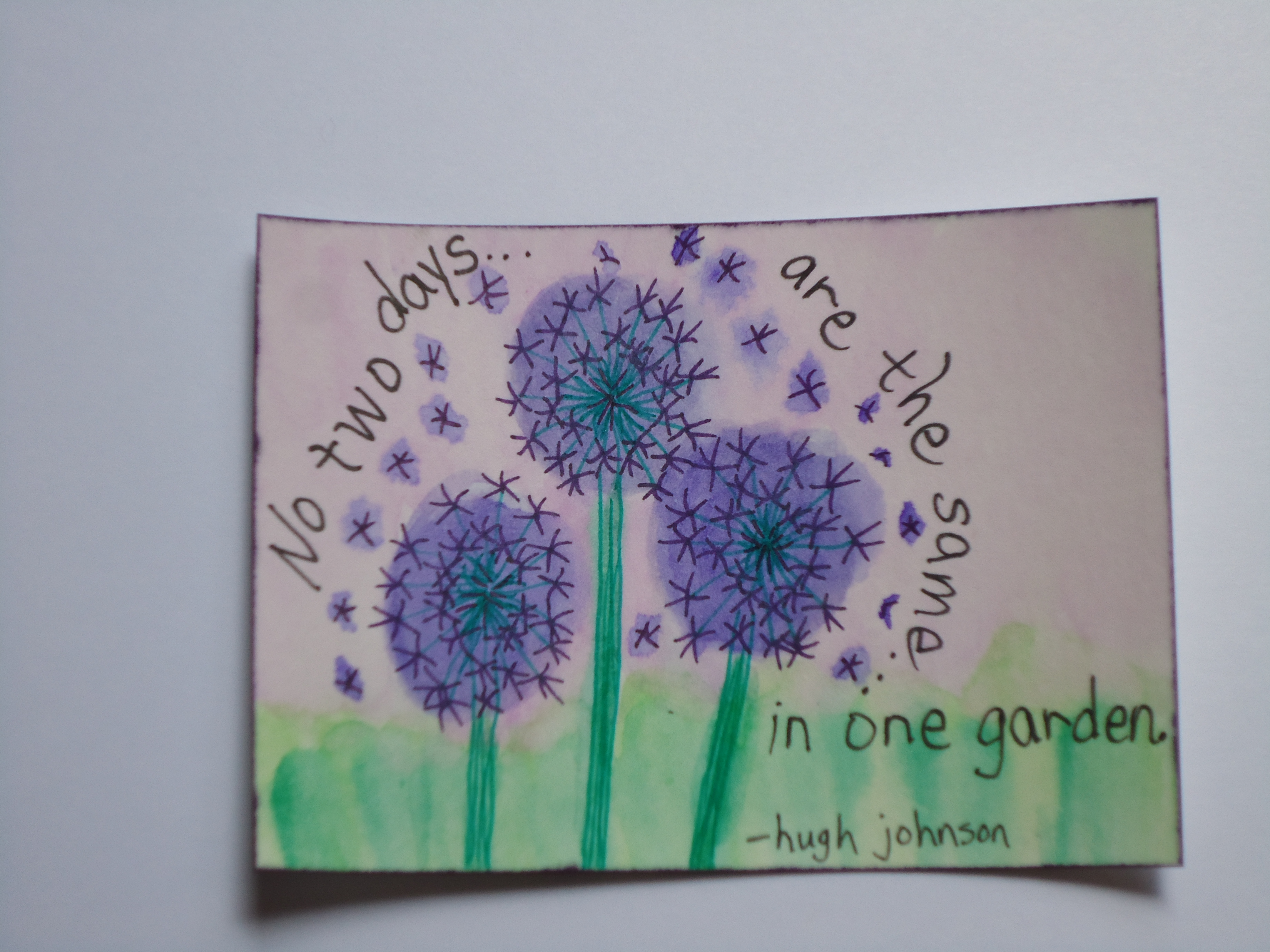 My first inspiration came from my garden, which is always changing. I did a messy little illustration of a few alliums, and then I found a perfect quote that I just wrote in my natural handwriting, which I’m trying to like better. I’ve never been a fan of my own handwriting, whether it’s cursive or printing. But with all these art projects I’ve been working on lately, I really want to like my own handwriting!