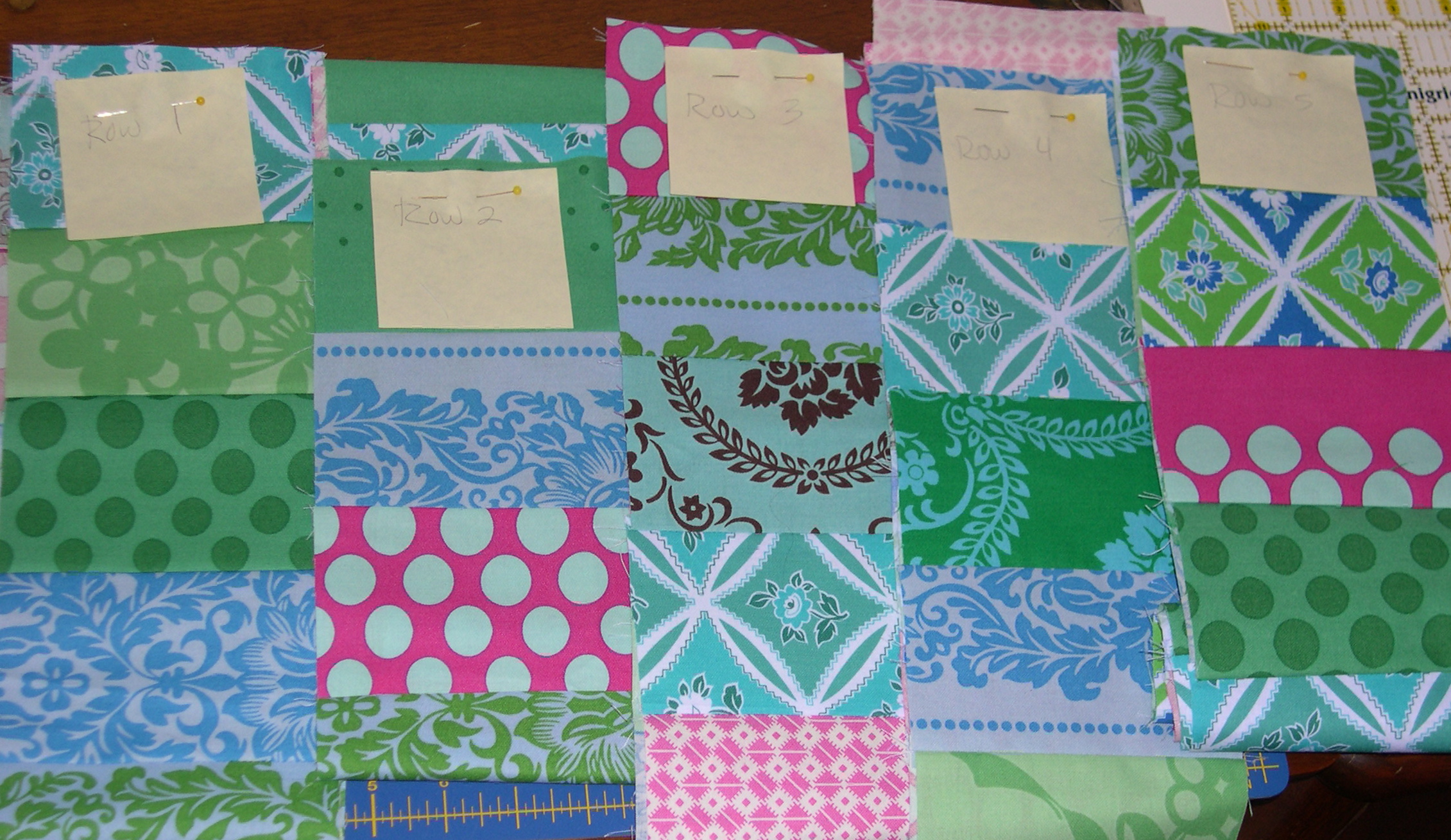 I am using the coin quilt pattern from the Moda Bake Shop. I cut ten fat quarters into 5″ strips, and then into 3.5″ coins. Easy peasy. Then I laid them into five rows of 22 coins.
