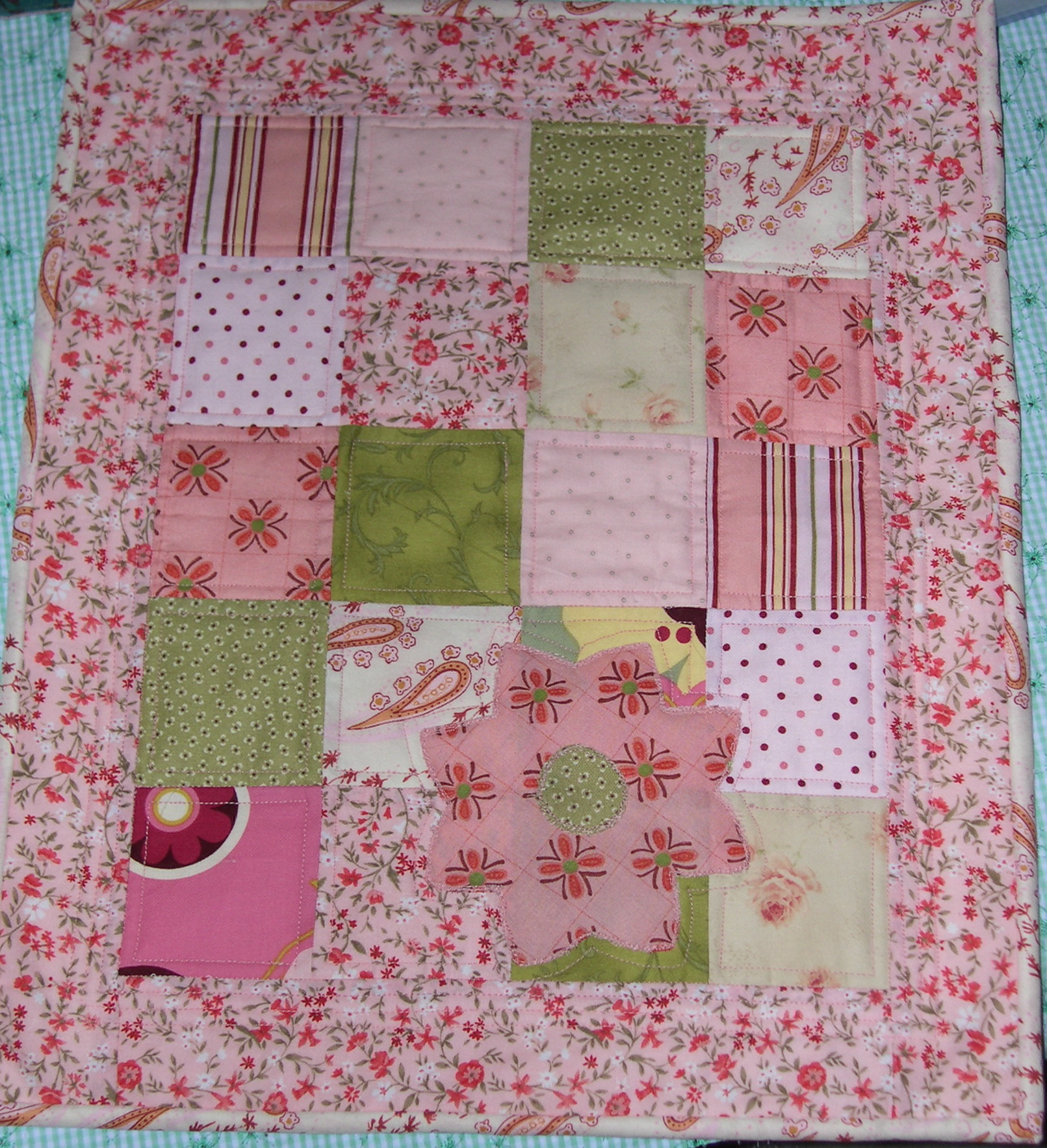 I quilted a frame on the inside of each square and in the border, and then I tried that sketchy stitchy applique method around the flower.