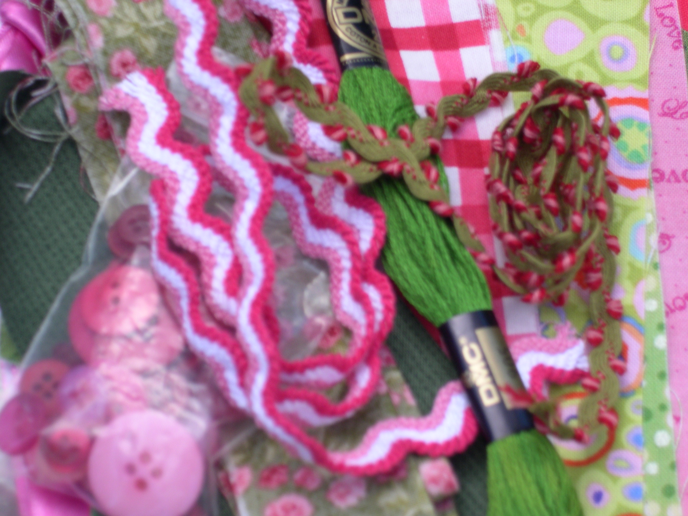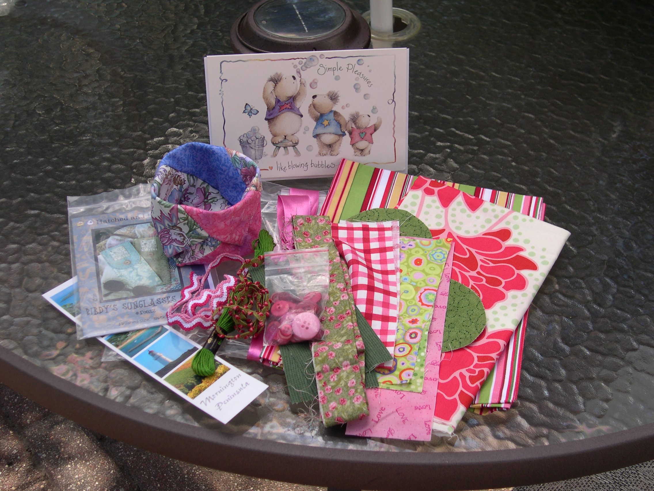 I feel so lucky that Karen who lives in Australia got my name. She included a flower piece of the new Pop Garden fabric collection by Heather Bailey, a striped piece that might be from Sandi Henderson’s Farmers Market fabric collection, and other pieces of pink and green that will look great together, perhaps in a log cabin patchwork block, which is what I have in mind with an embroidered friendship message on the other side.