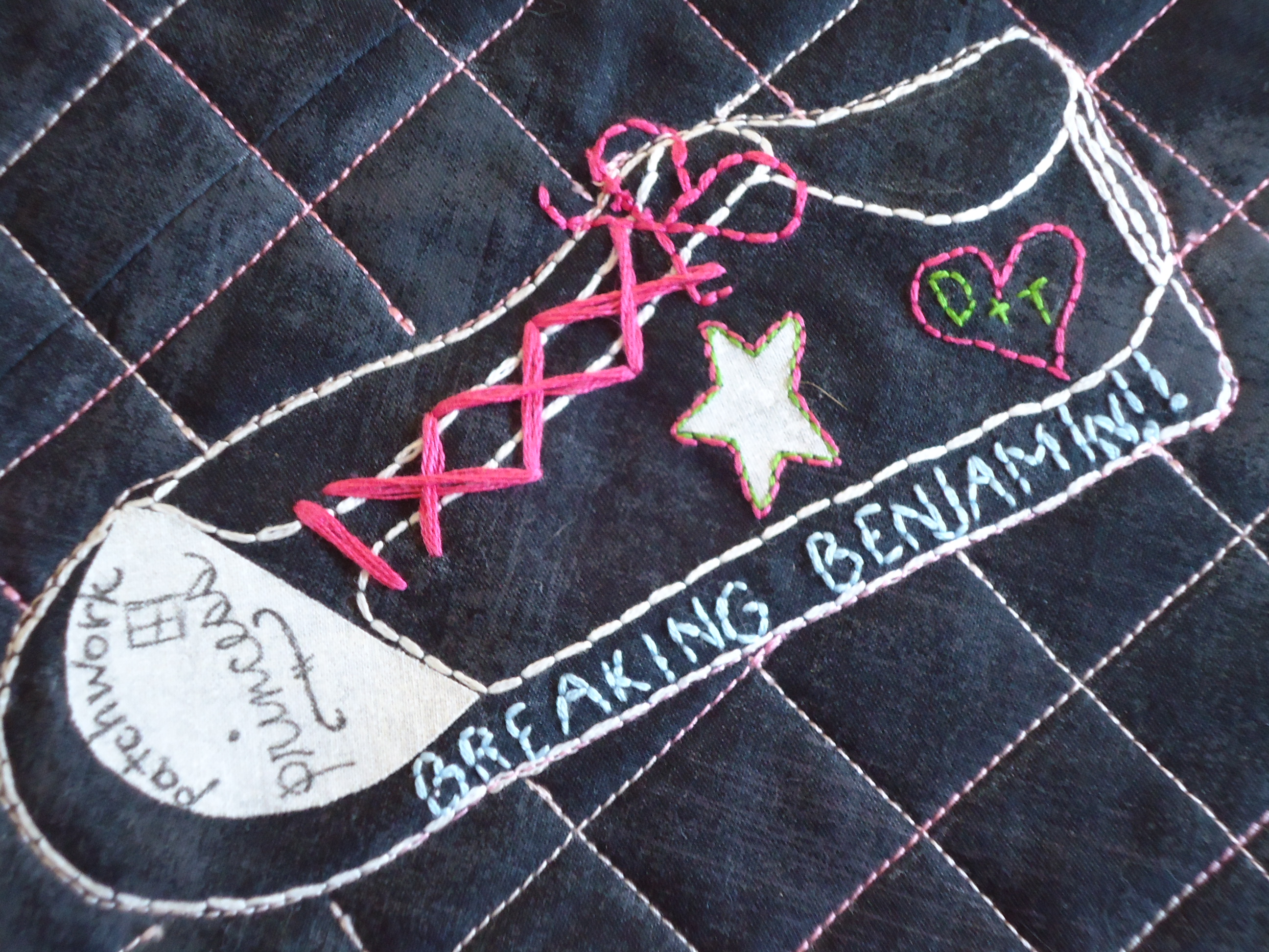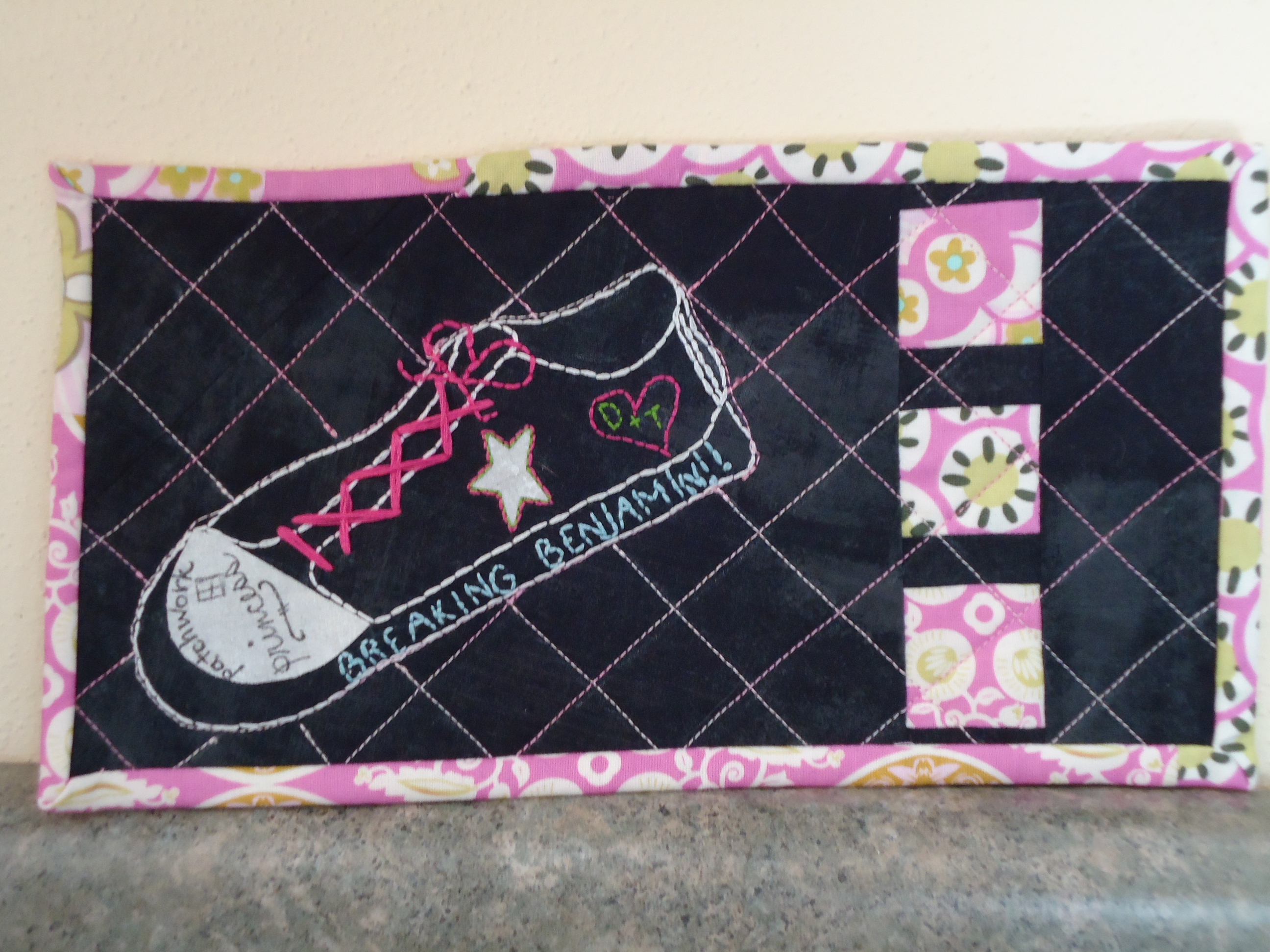 She remembered how much I love Converse shoes. She also remembered that my favorite band is Breaking Benjamin. (Yes, hard rock music. Don’t hold that against me!) Finally, she knows I love patchwork. So she combined all those fun things into a mug mat with an appliqued Converse shoe customized with this fun embroidered graffiti.