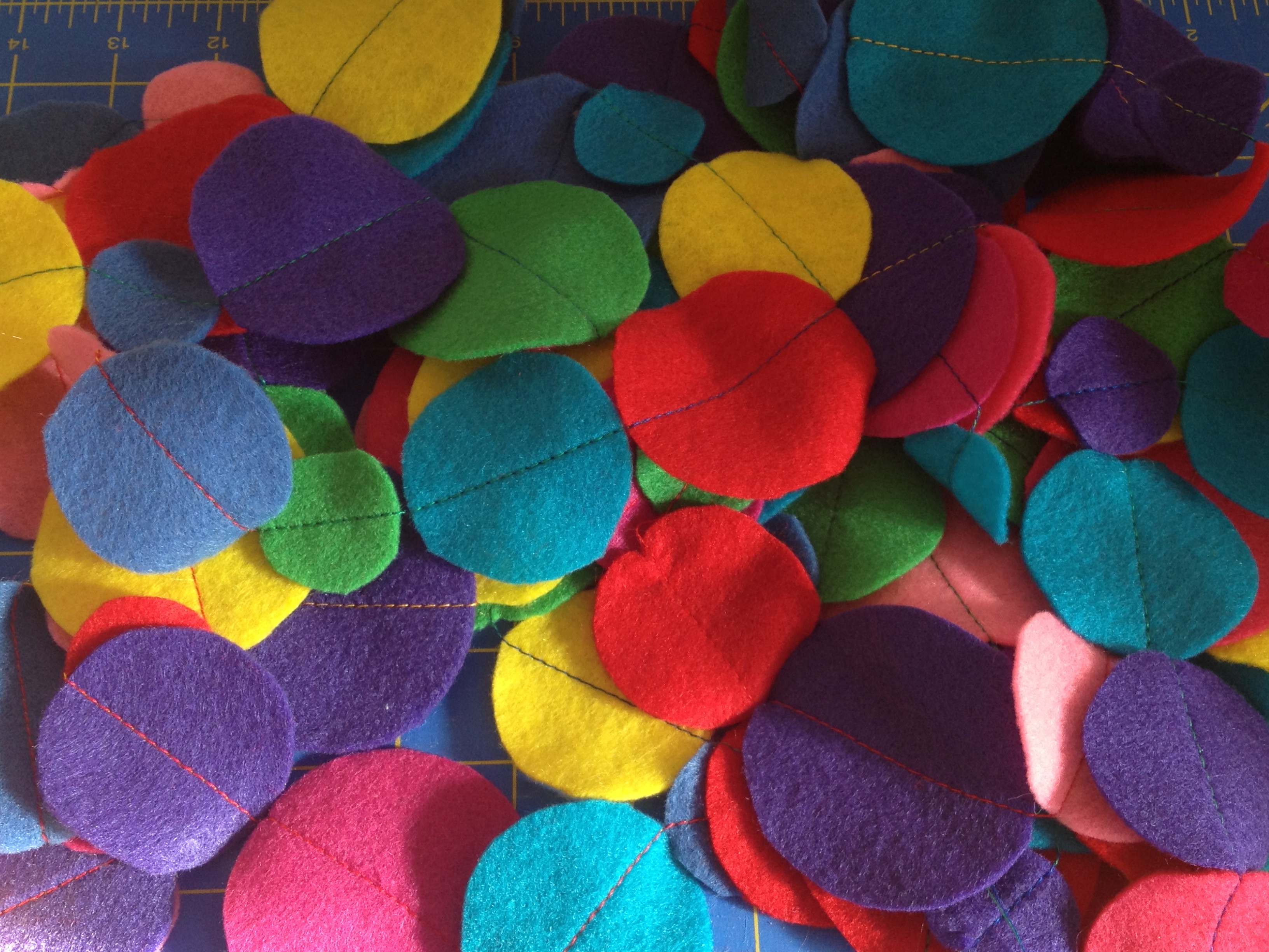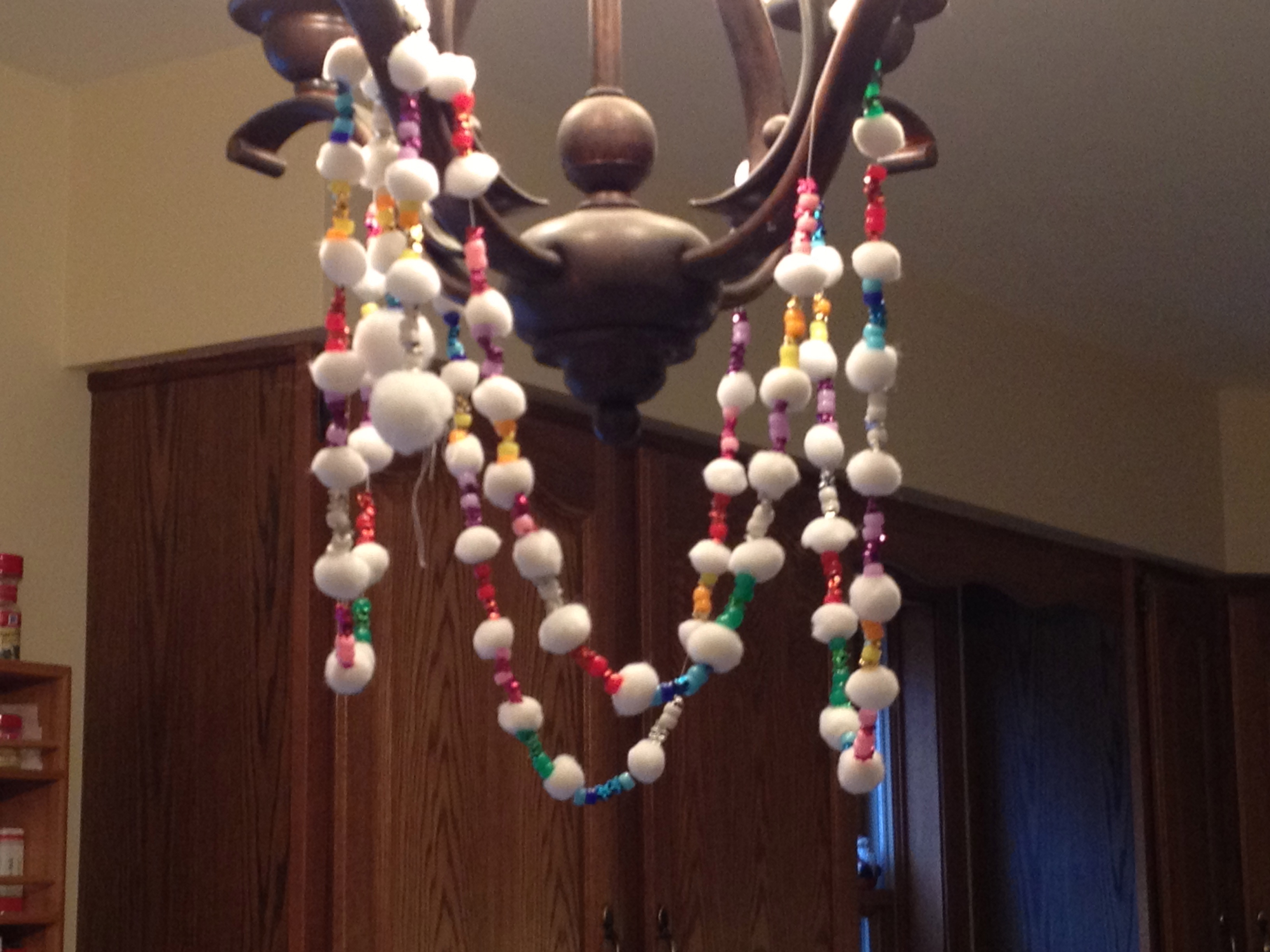 I made this one a few years ago with white pom poms and a variety of colorful beads, and decided it went well with the felt circles.
