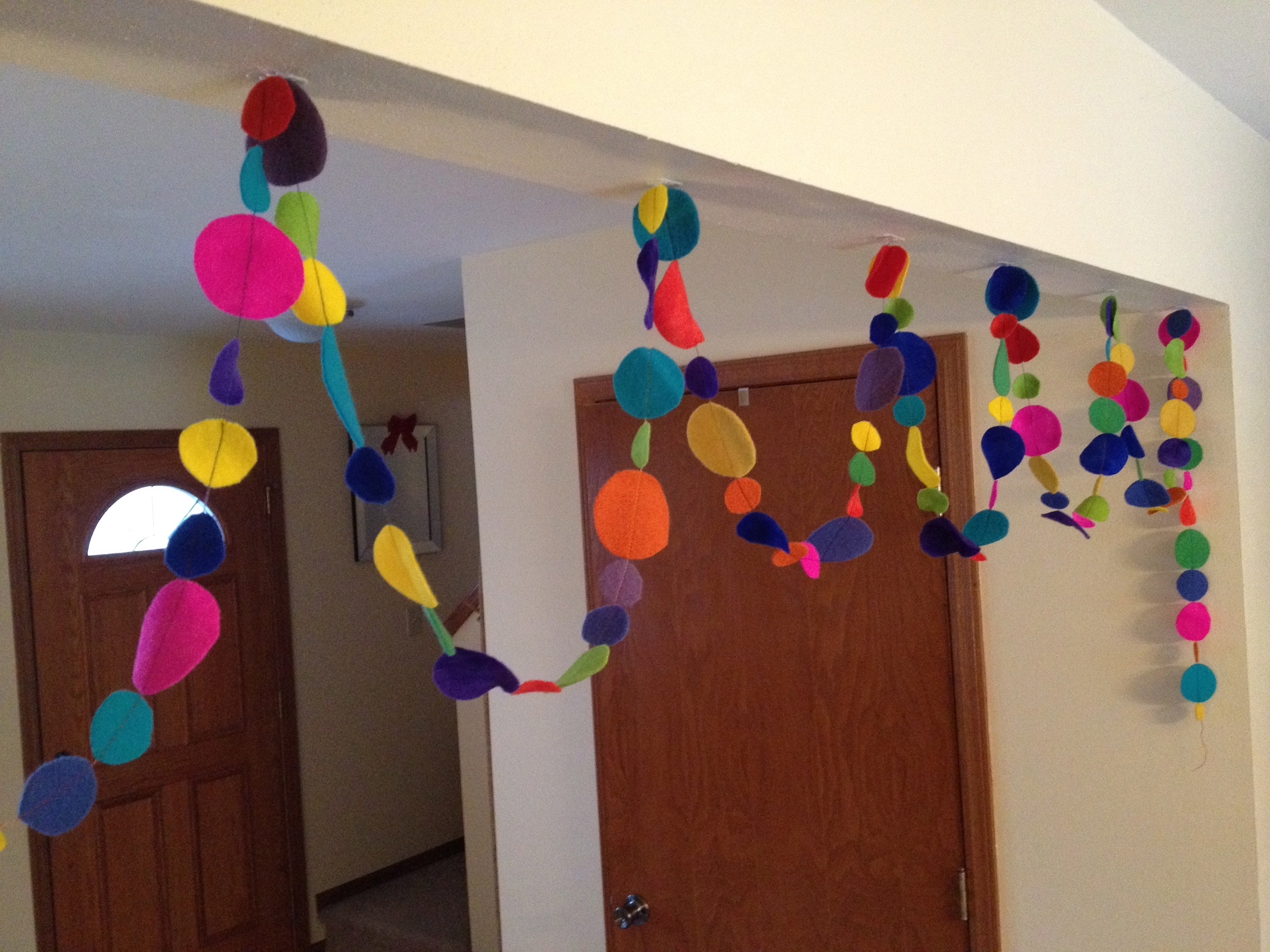Over the holidays, I thought it would be fun to have some festive New Year’s Eve decorations to put up. I used this project from The Purl Bee to make the felt circles garland.