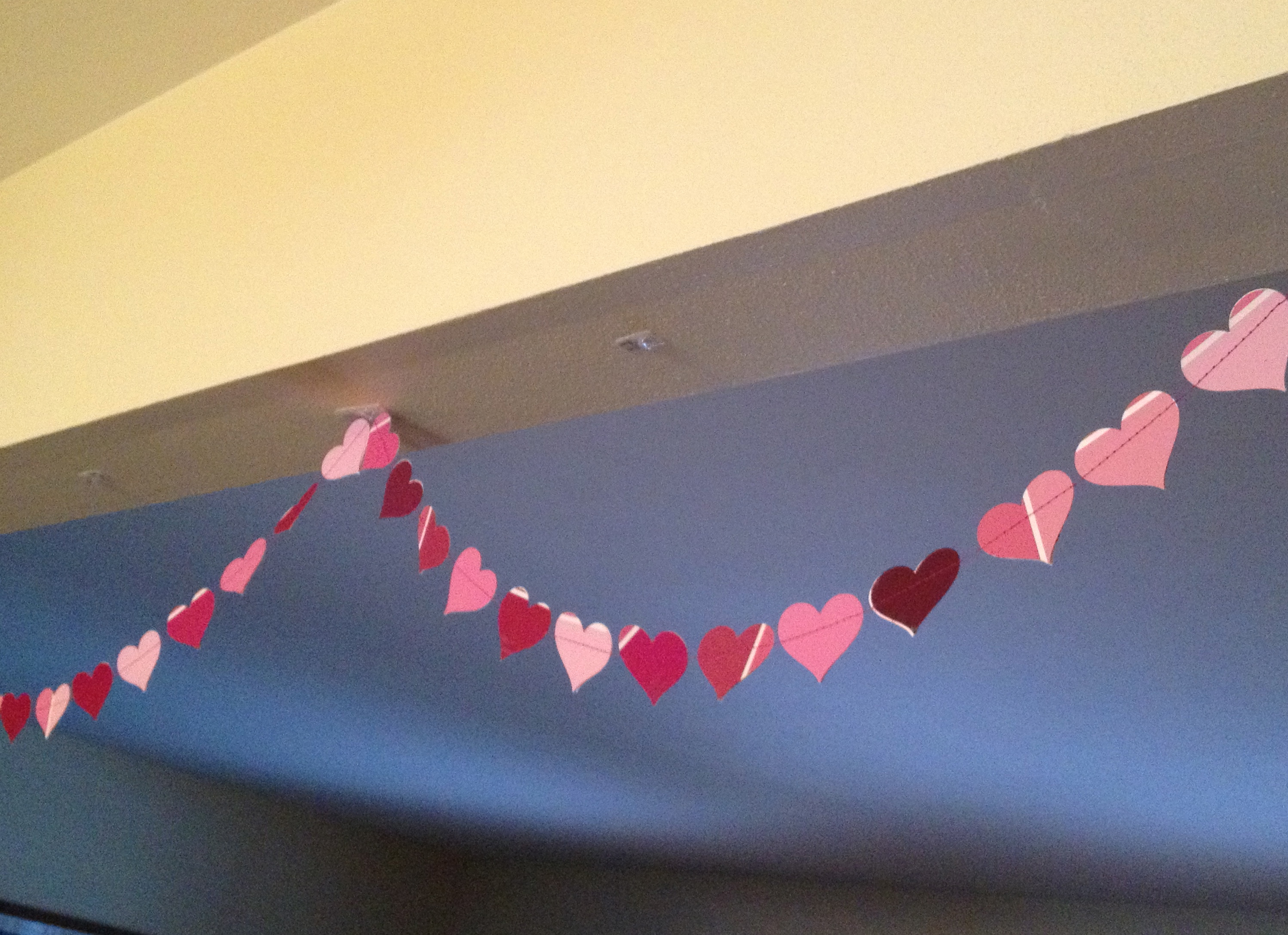 The paint chip garland I found on the Internet but I can’t find the right site. (Click on this one for a good reference.) It’s made from a variety of pink and red paint samples and a heart punch.
