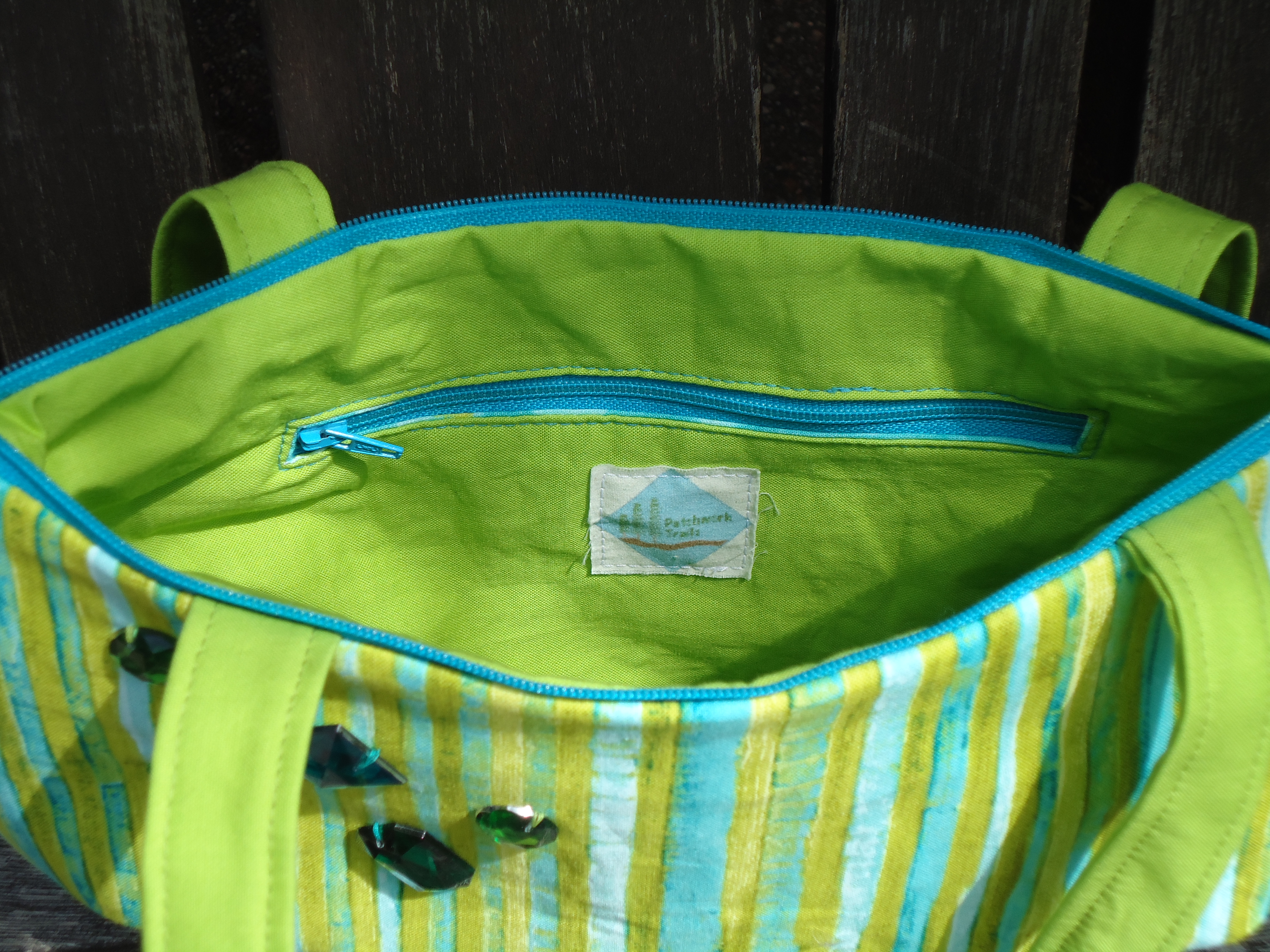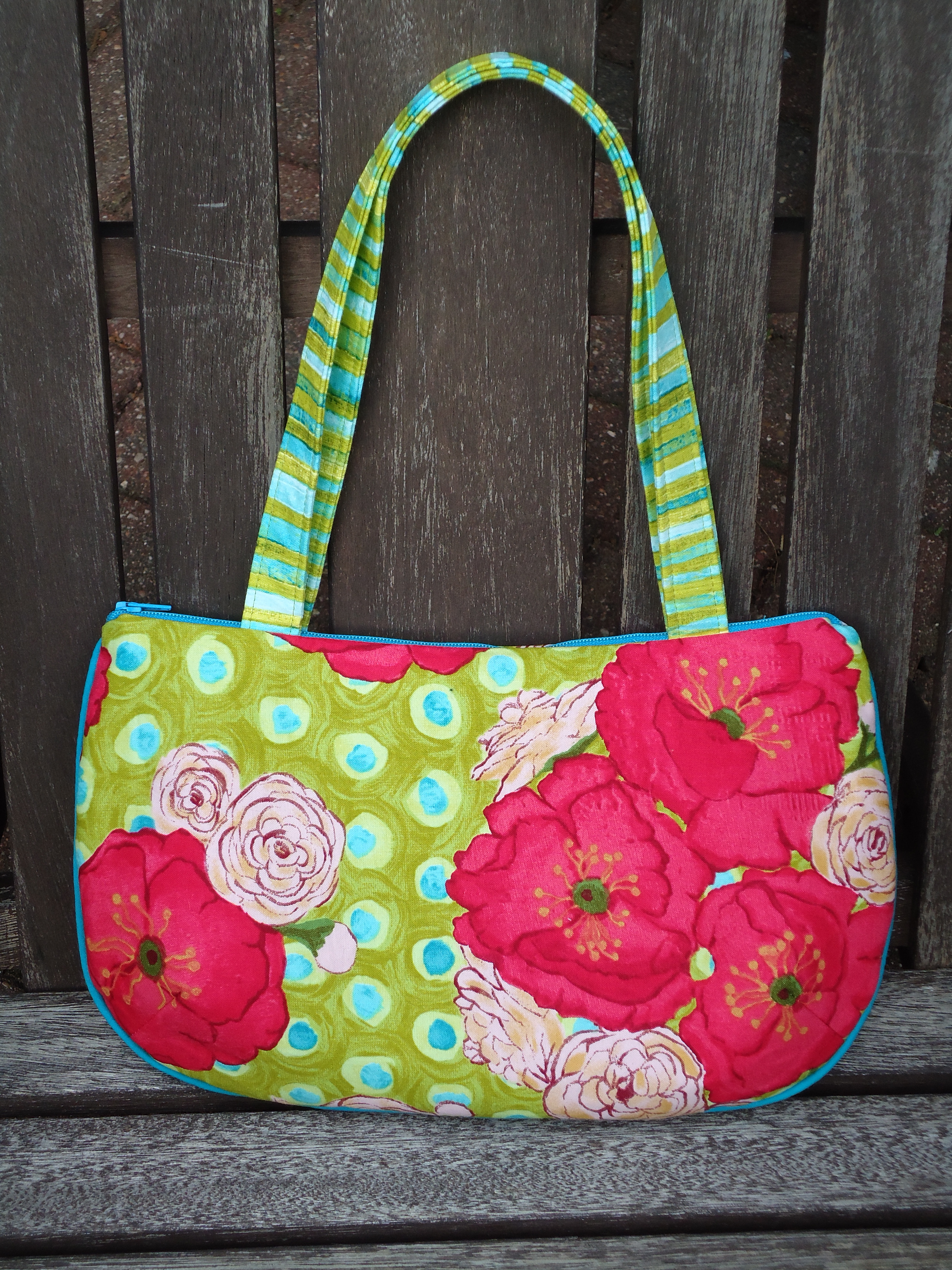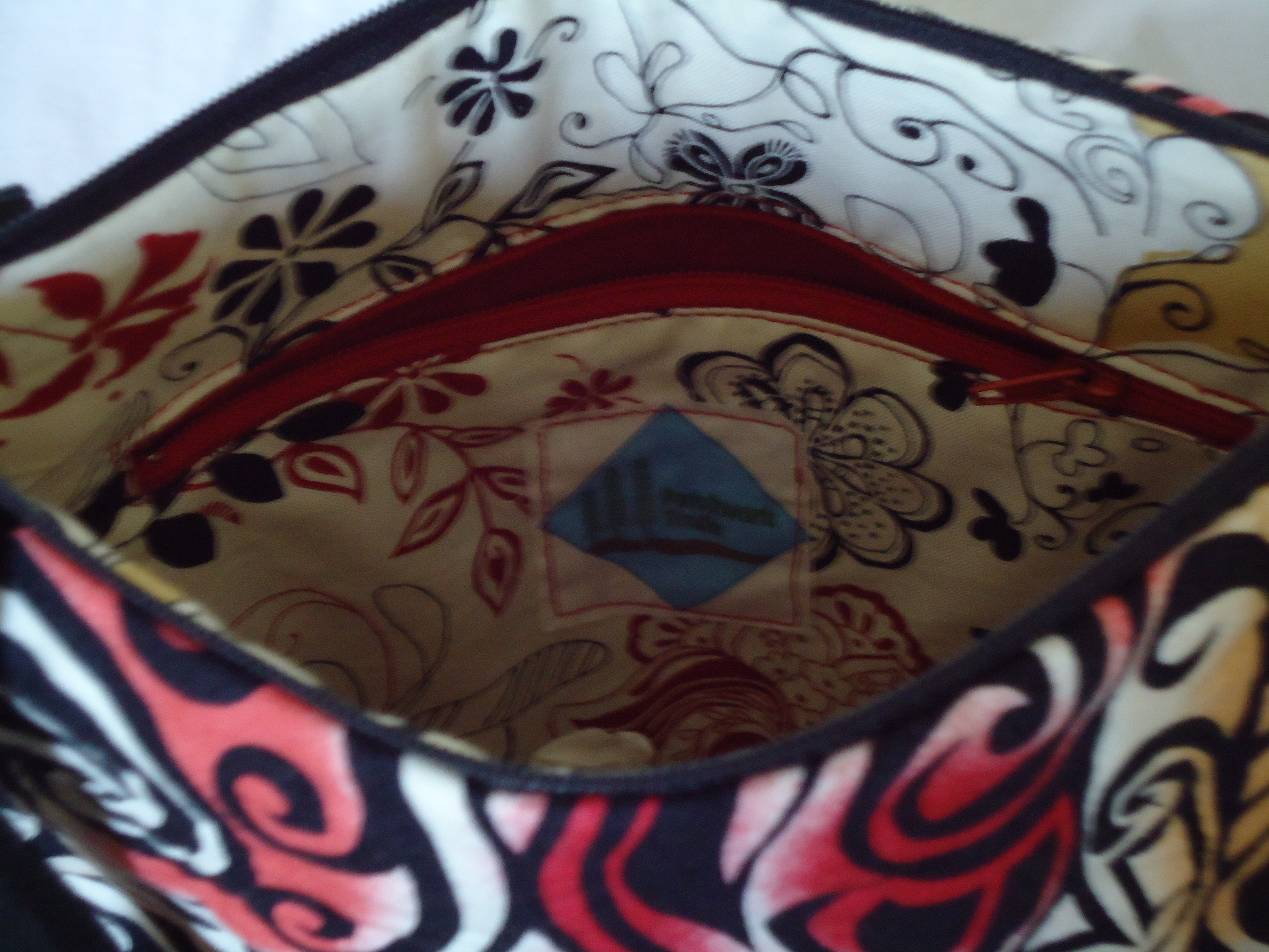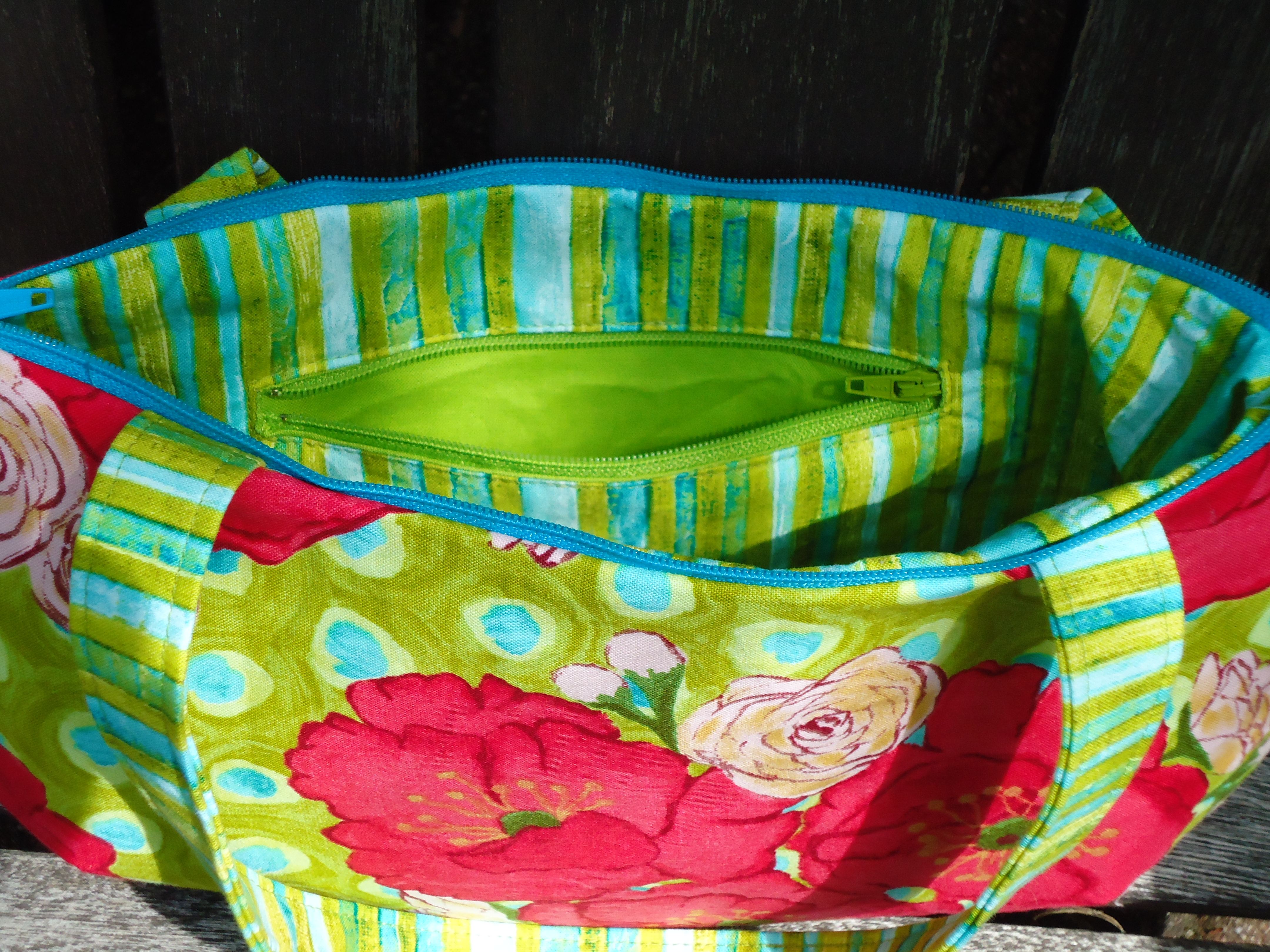 I also wanted something youthful and a little funky, but still functional. In my true style, I always like to add piping for that extra finished touch. This bag has a zipper pocket inside to hold loose items, and an open pocket on the other side to slip in a notebook.