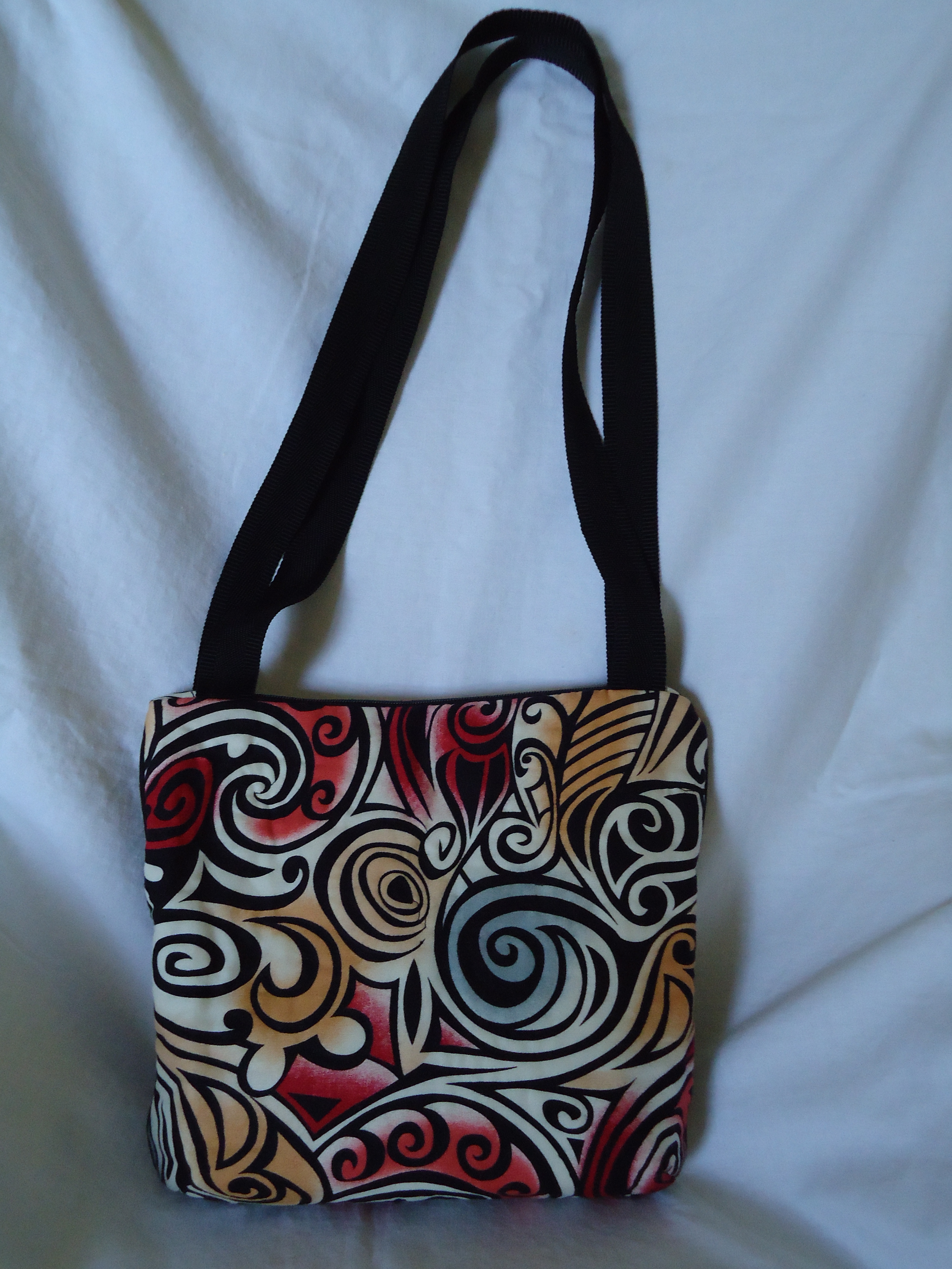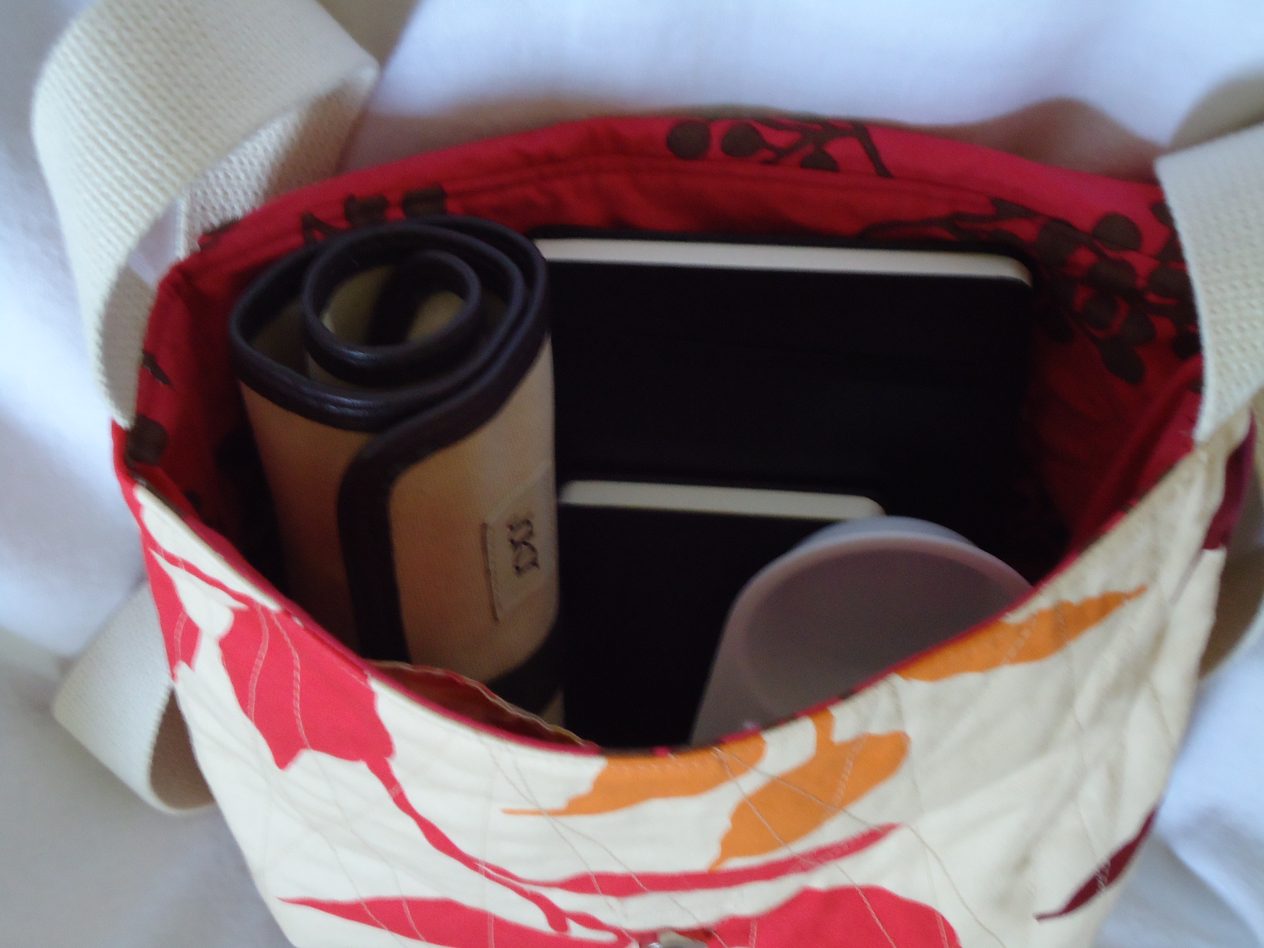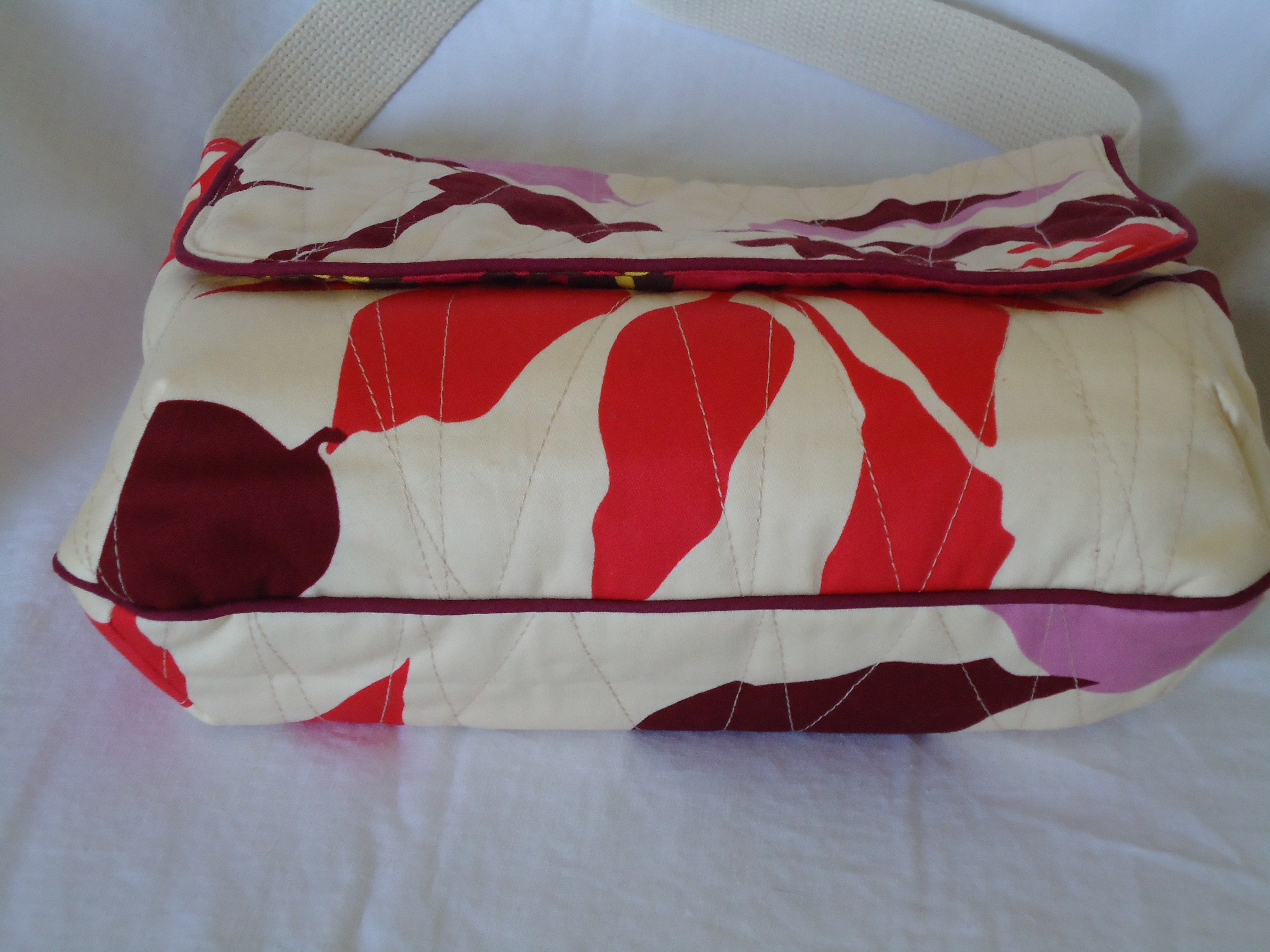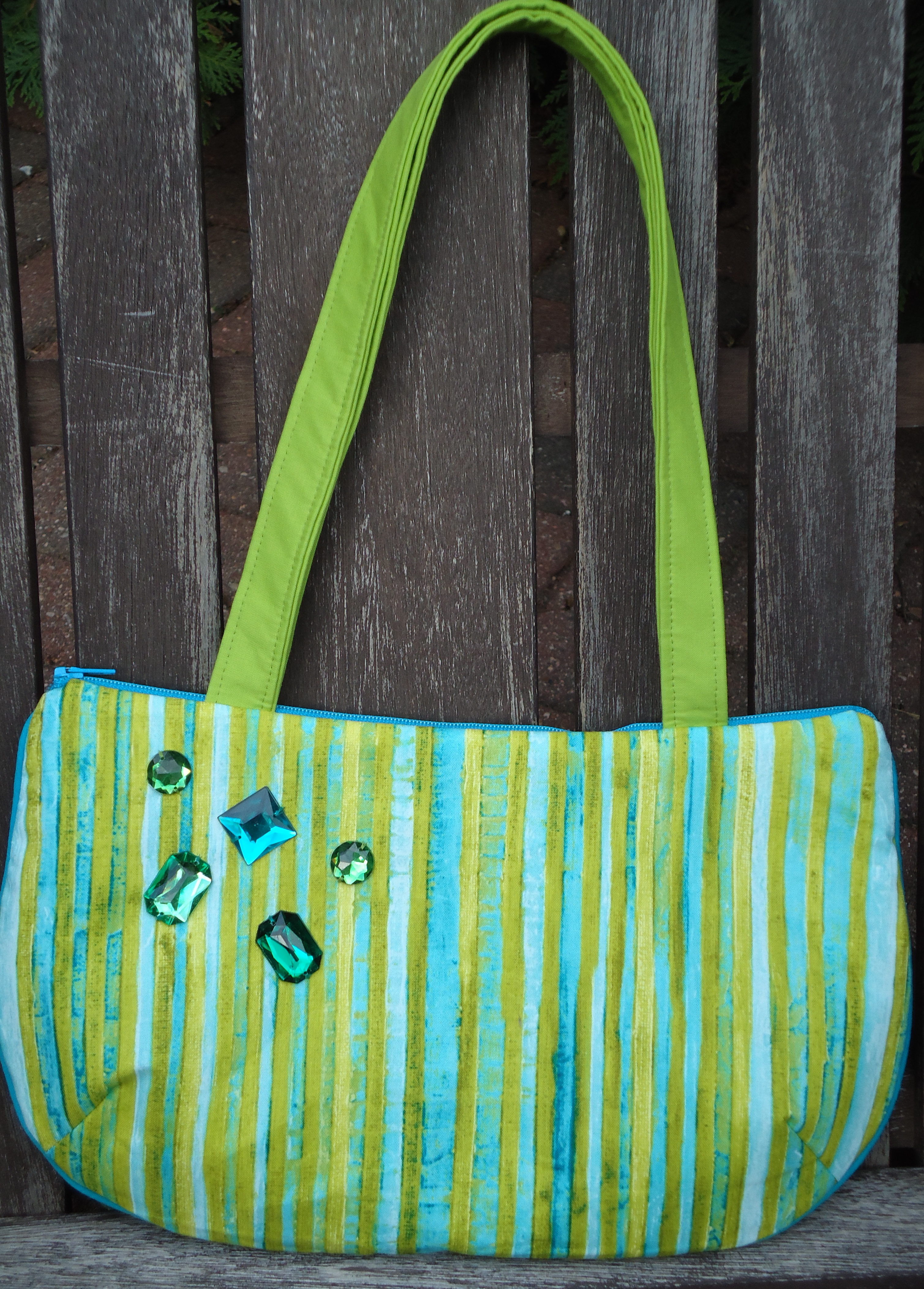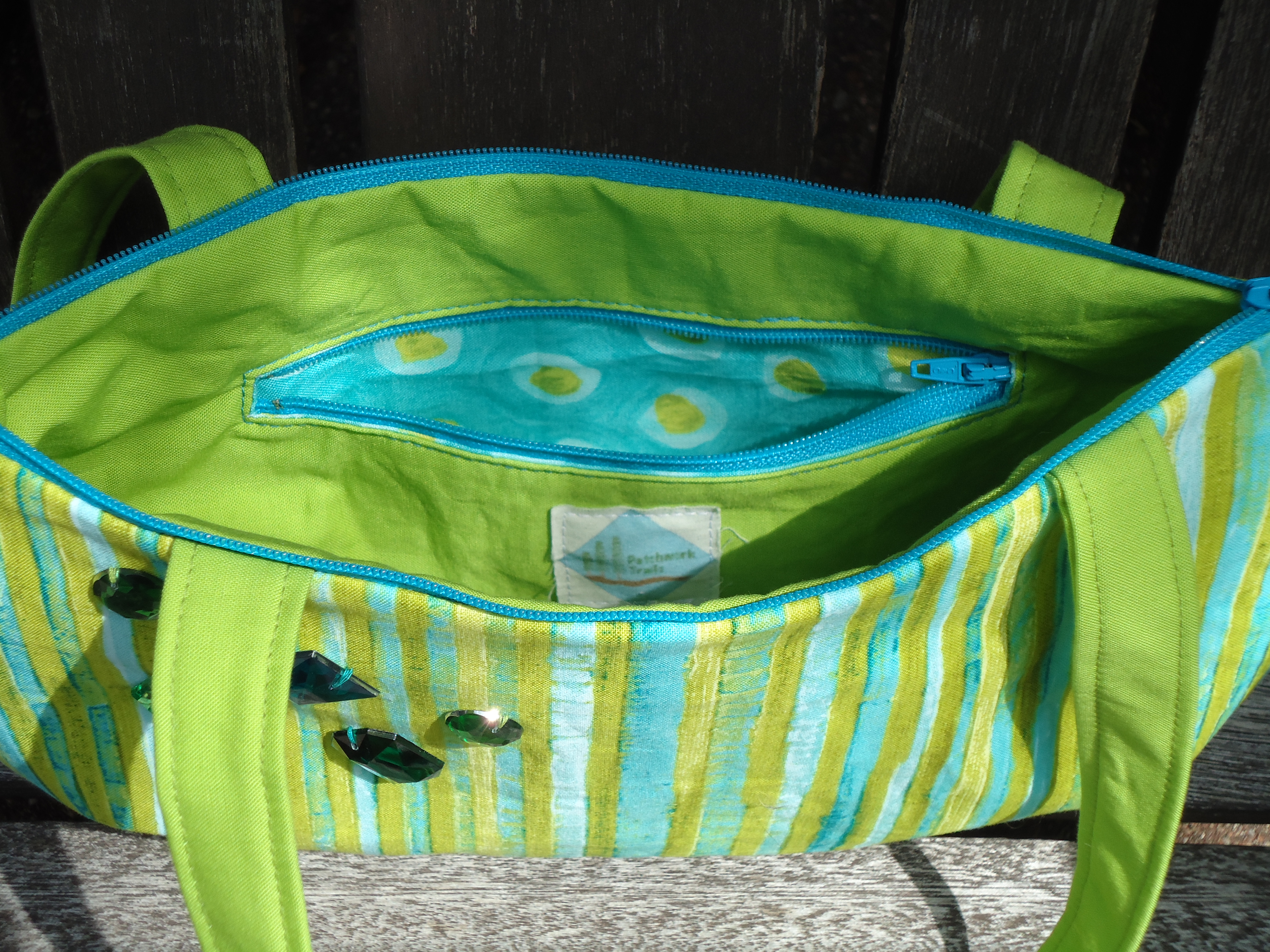 I also wanted something youthful and a little funky, but still functional. In my true style, I always like to add piping for that extra finished touch. This bag has a zipper pocket inside to hold loose items, and an open pocket on the other side to slip in a notebook.