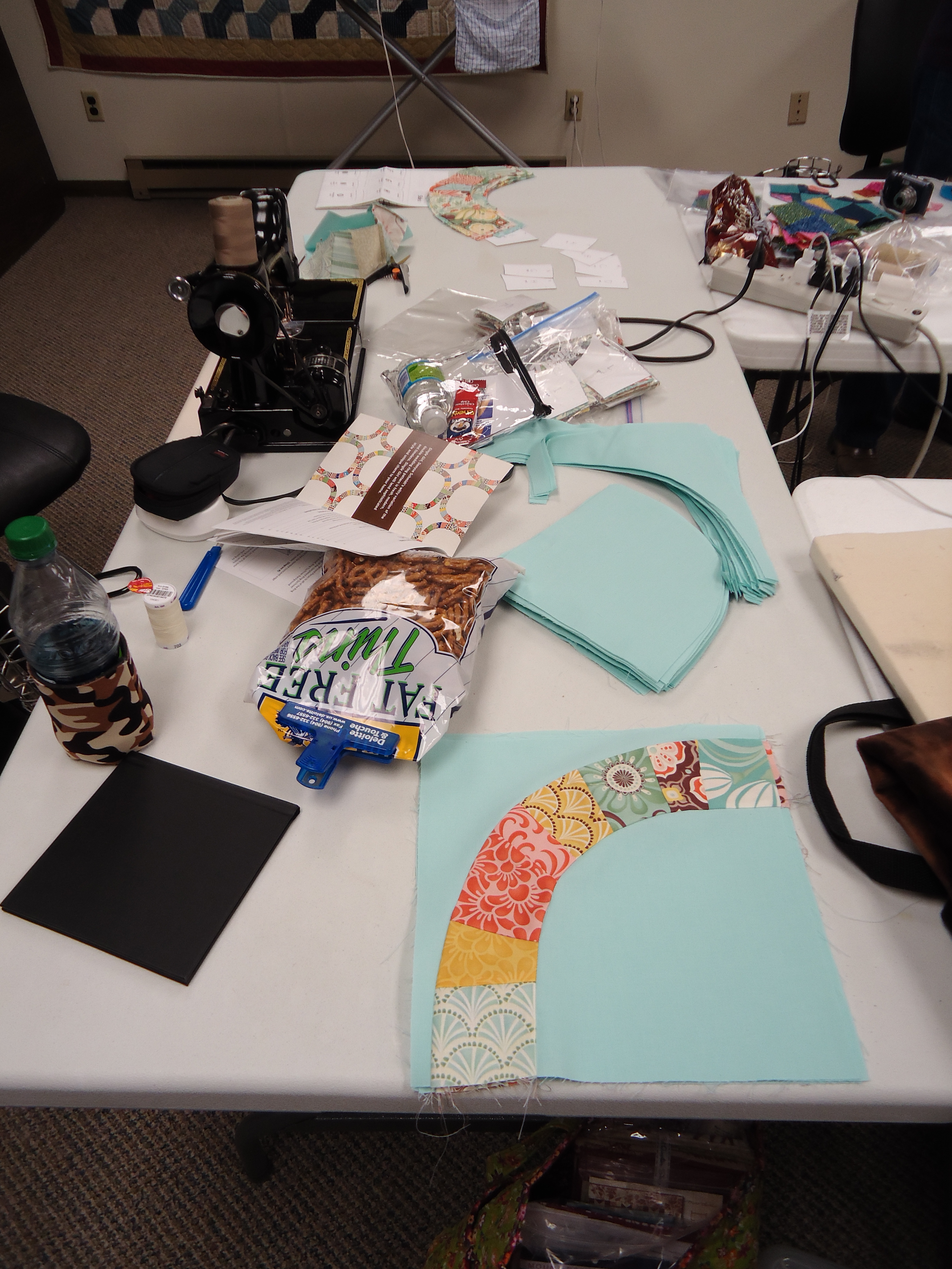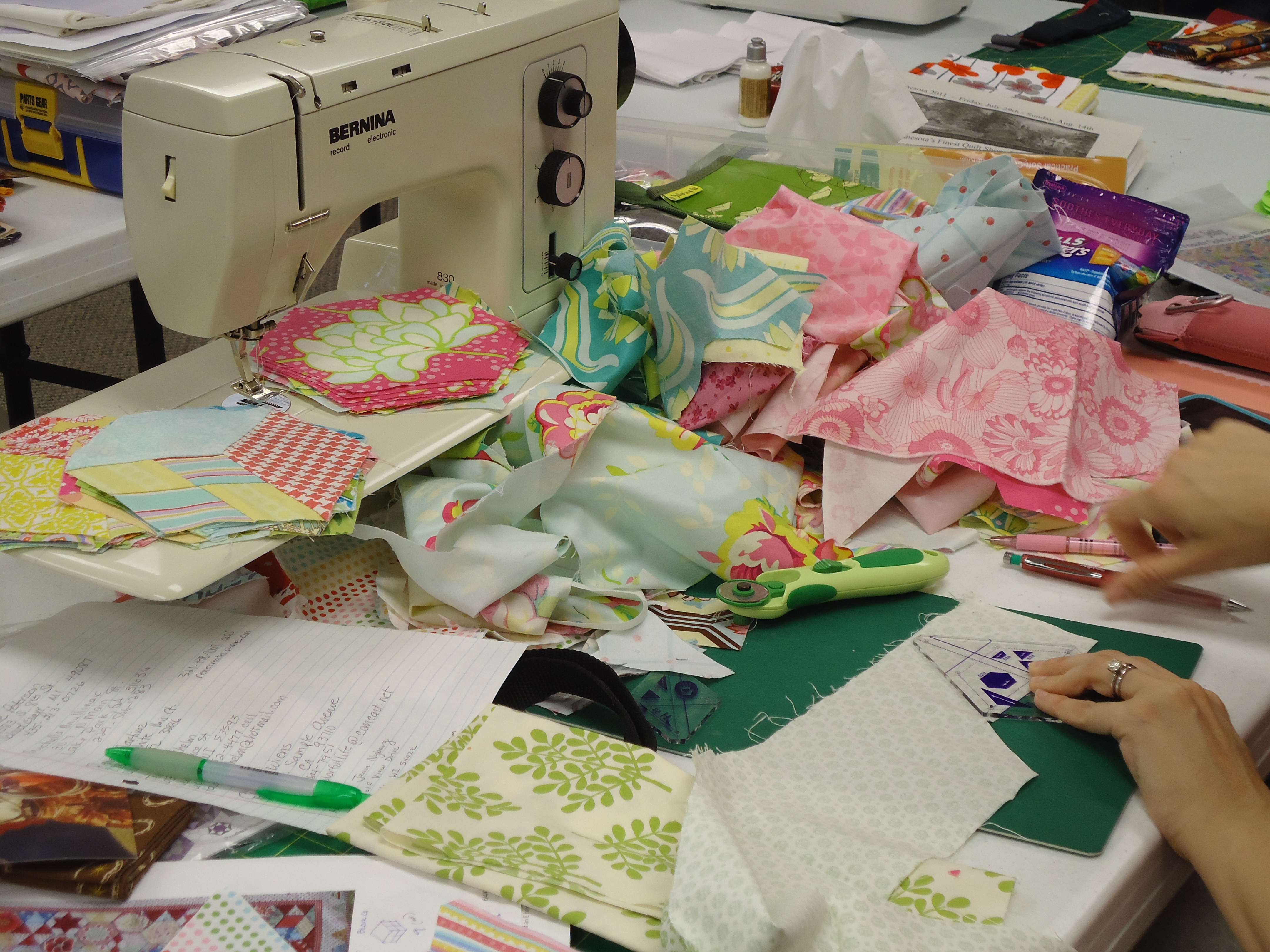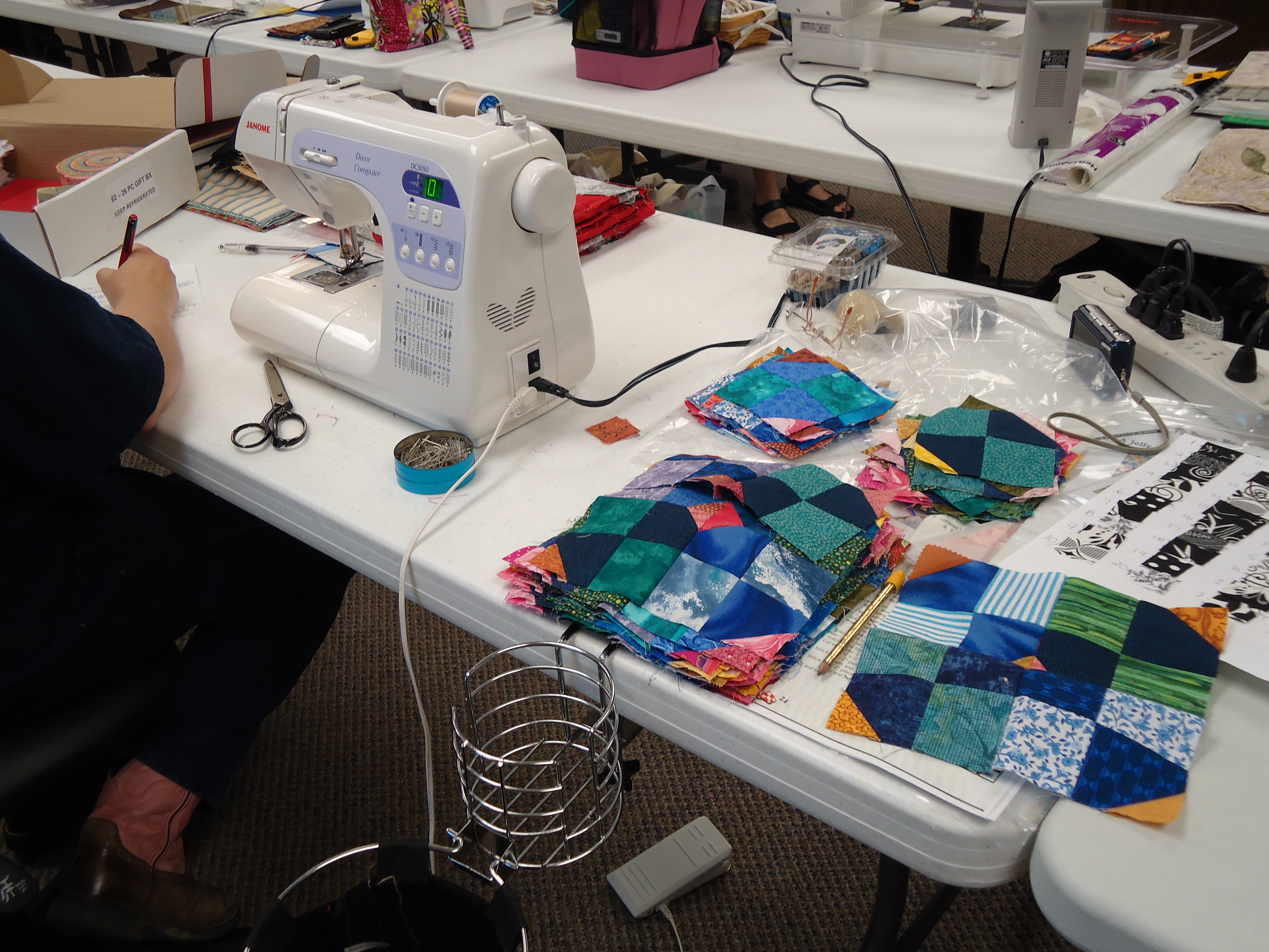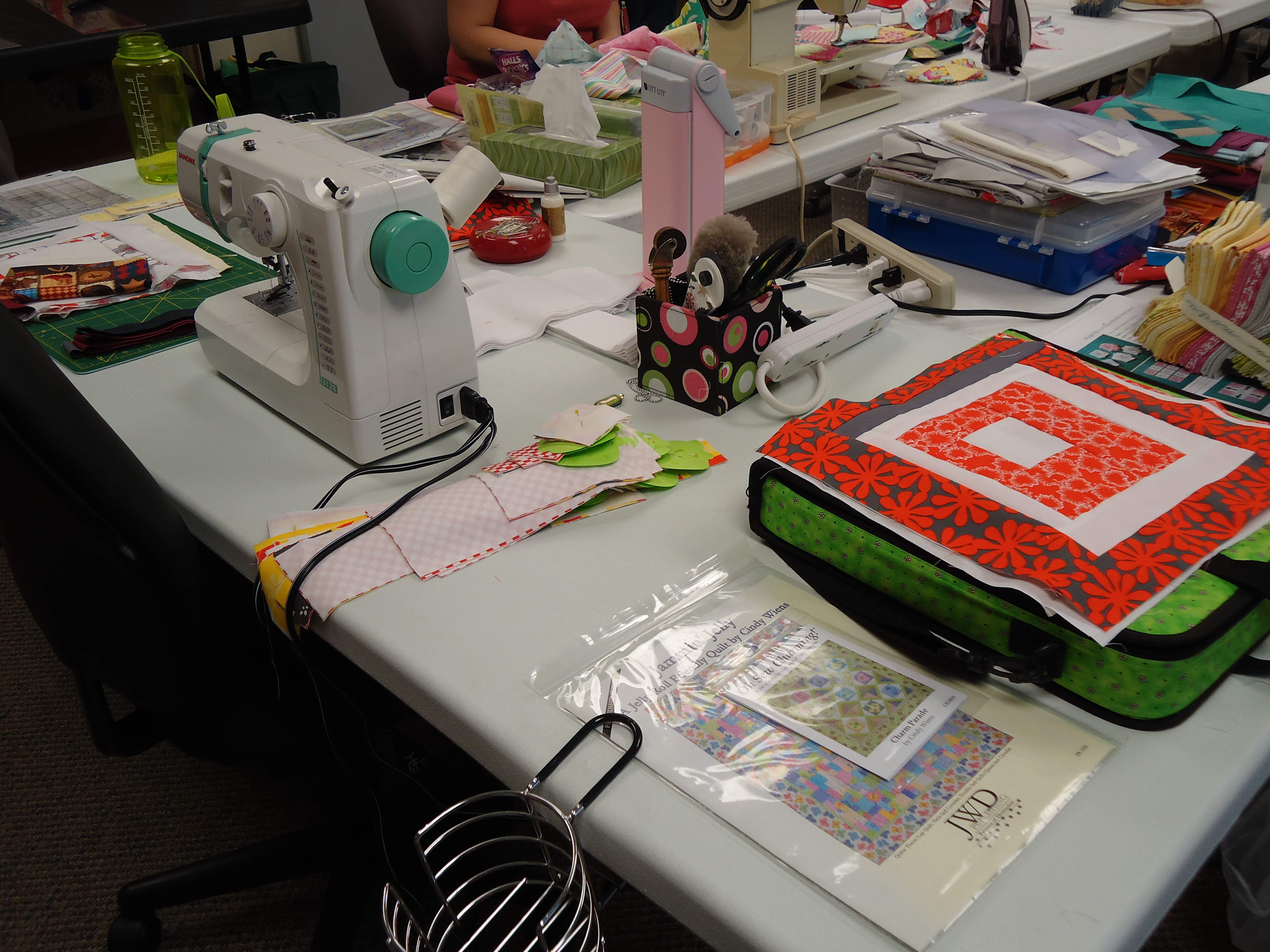 - Cindy made us the 1 hour basket with the cool license plate fabric, which we all used to throw our scraps in over the weekend.
