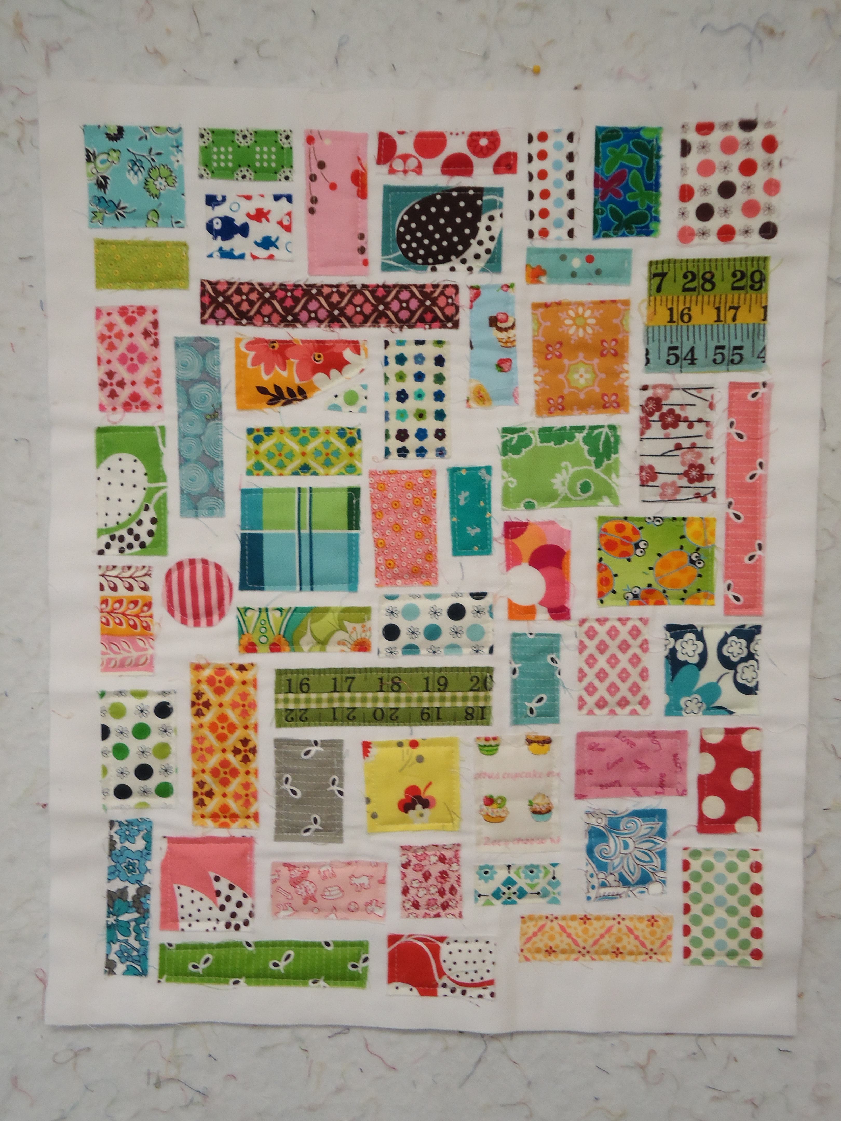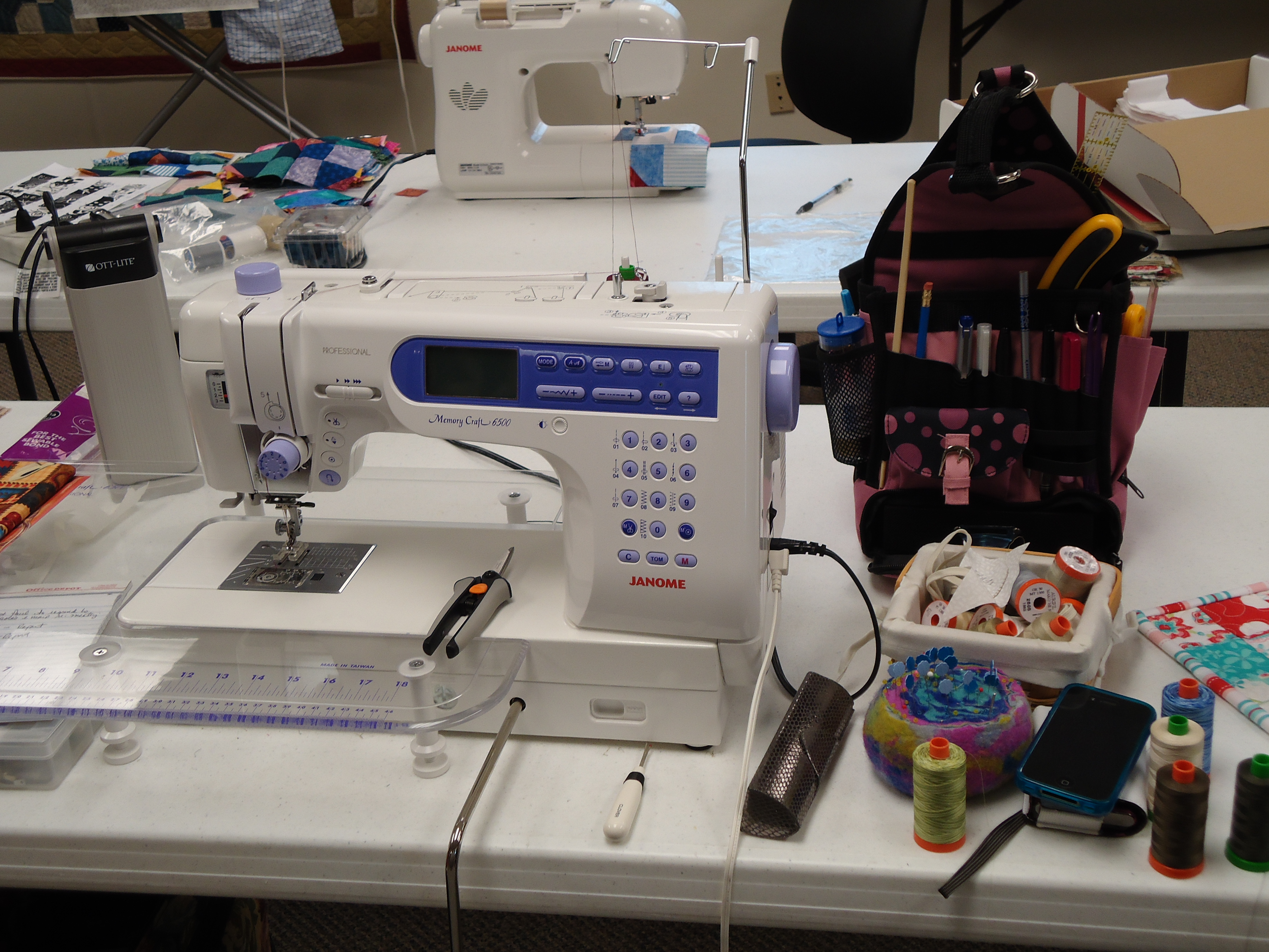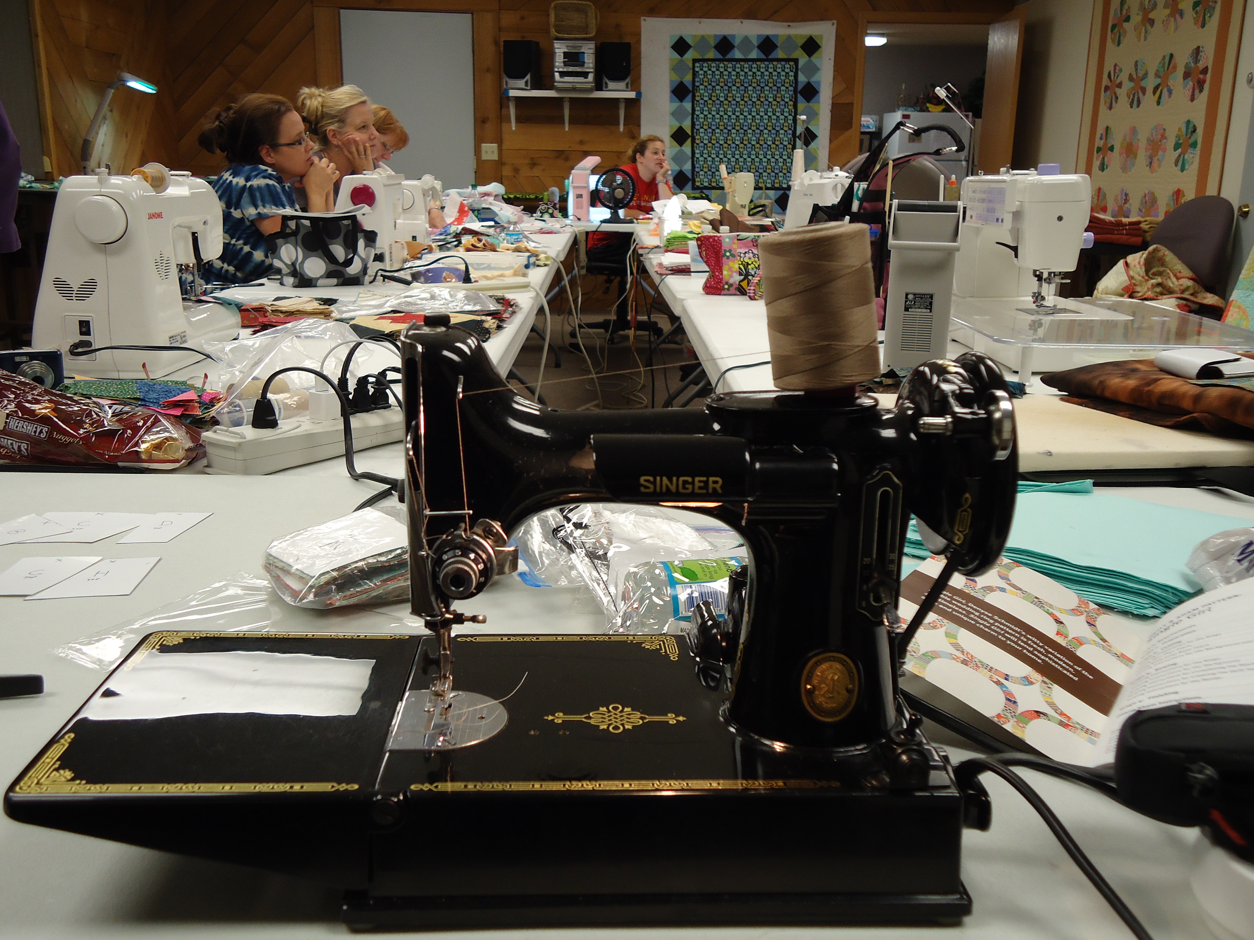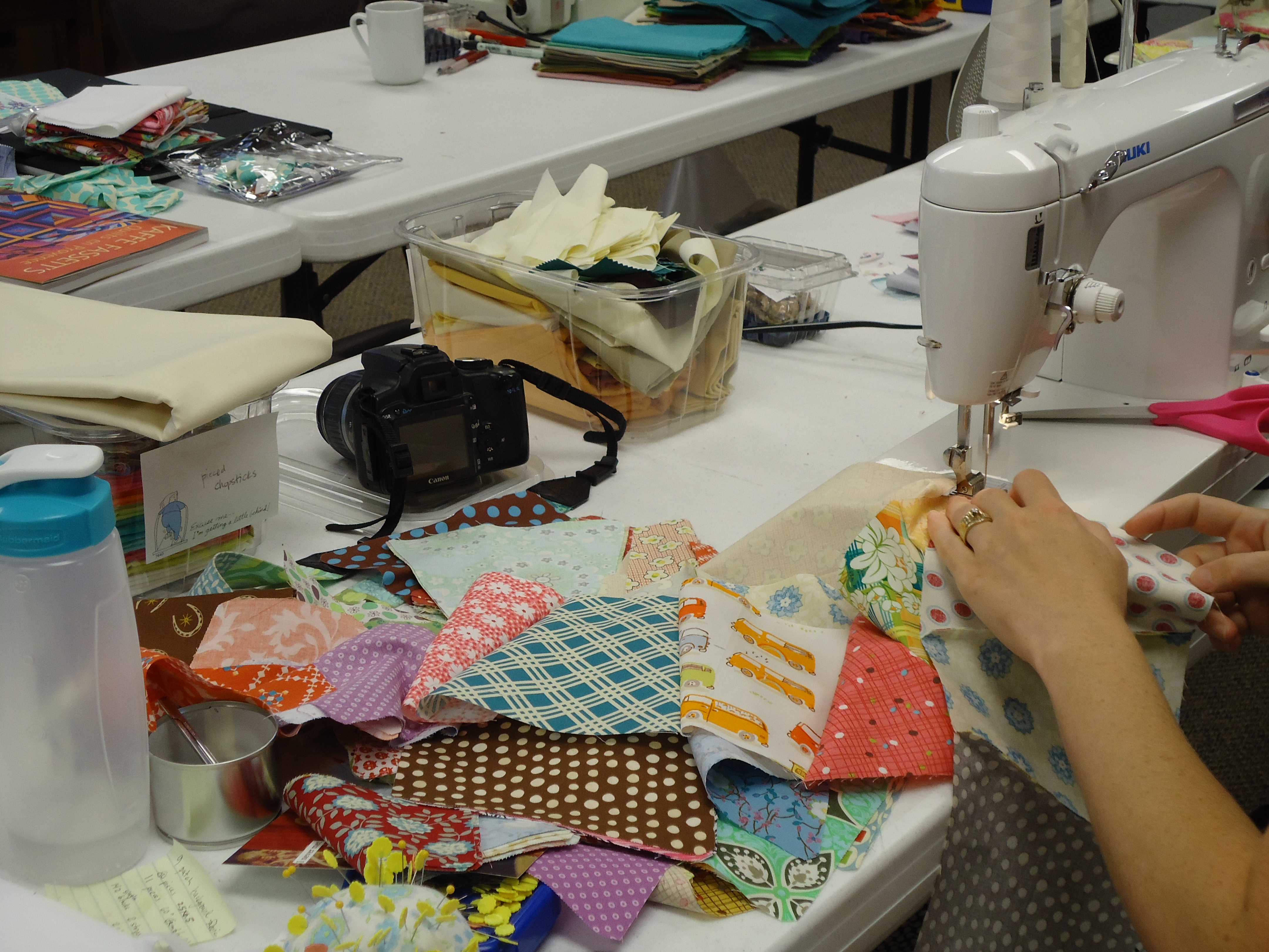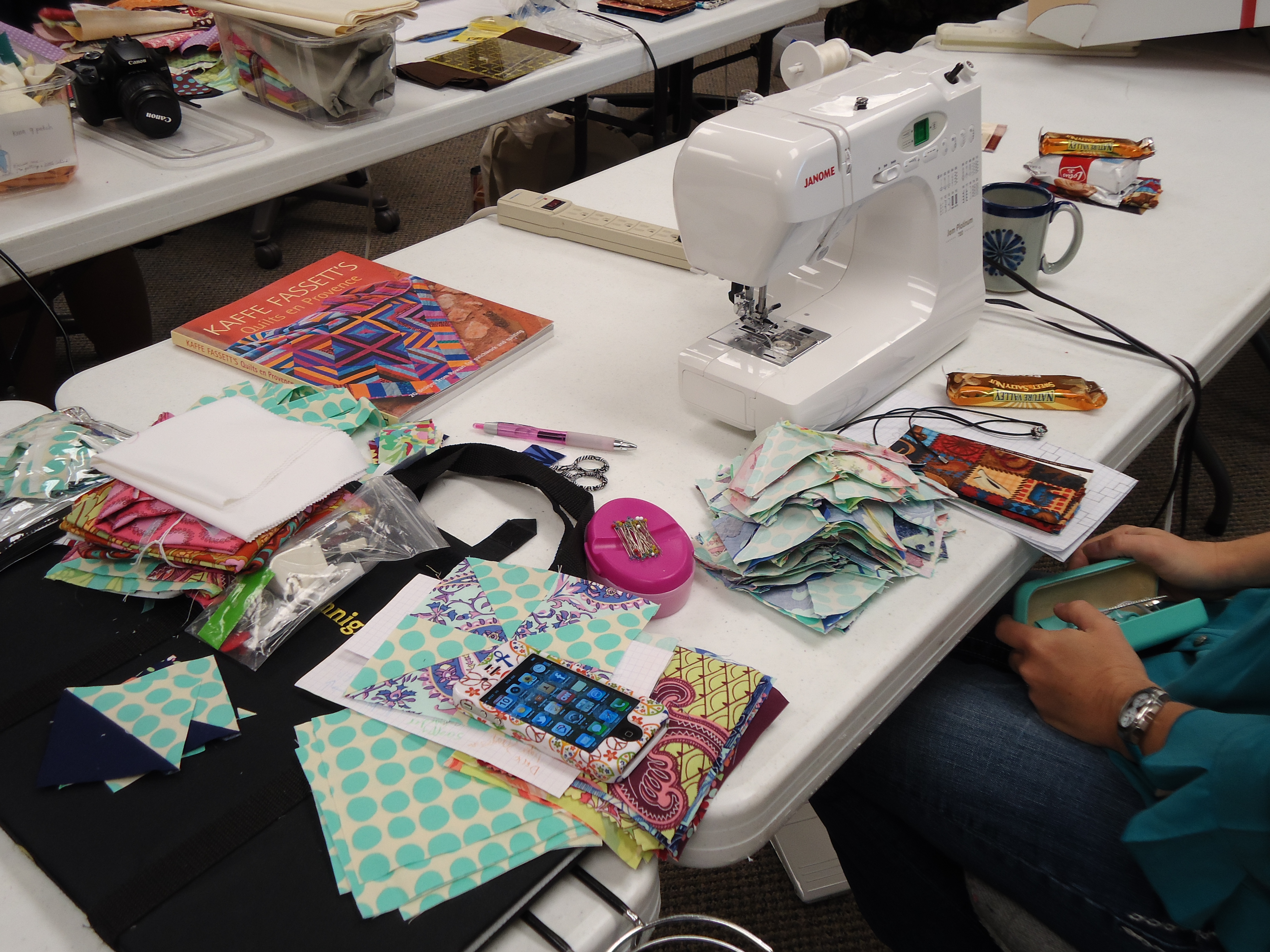 - Cindy made us the 1 hour basket with the cool license plate fabric, which we all used to throw our scraps in over the weekend.