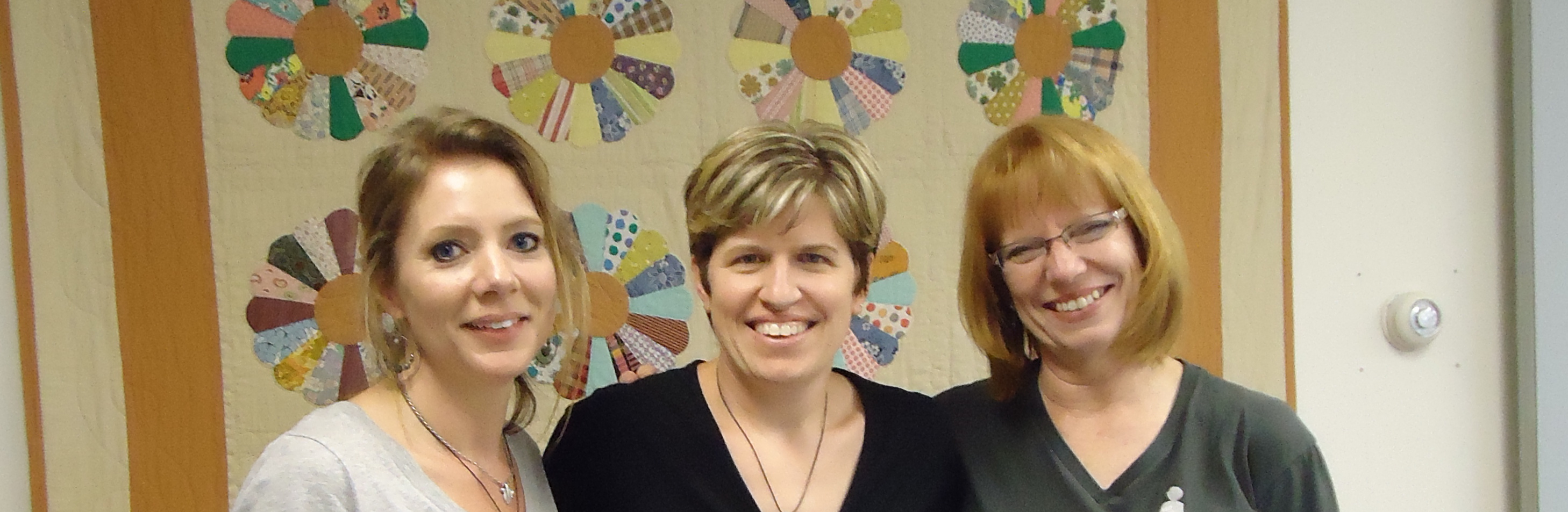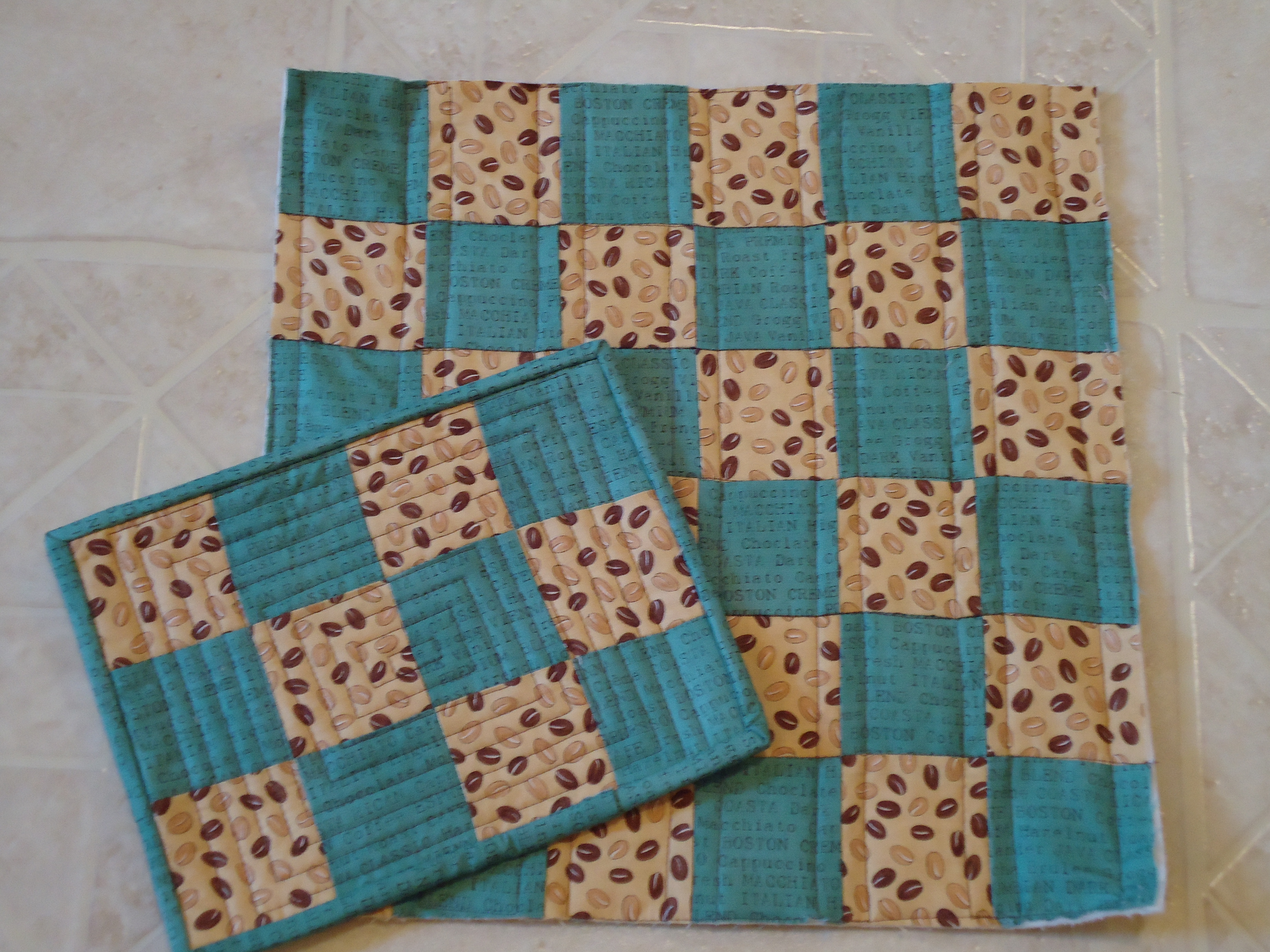 - Rene’ gave us a custom coffee mug with the logo I designed for our quilting bee, a stack of 2-1/2″ squares of fabric and a patchwork mug rug/mini quilt.