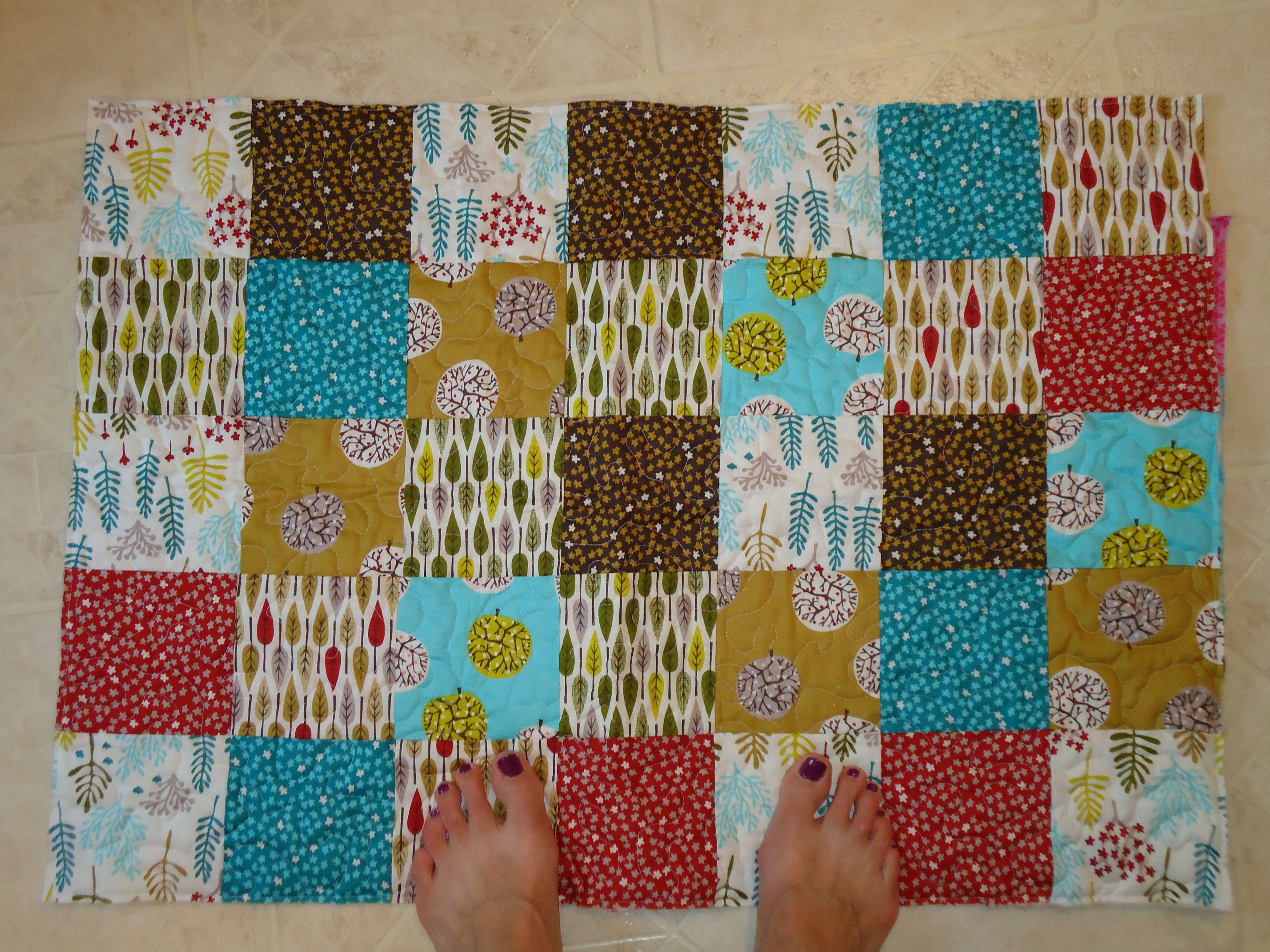 - Amanda Jean made us her work in progress bag, included the pattern and gave us a stack of 2-1/2″ squares from her upcoming fabric collection, Good Neighbors. She also gave me an autographed postcard from Sarah Watts, since I love her illustrations and fabric.
