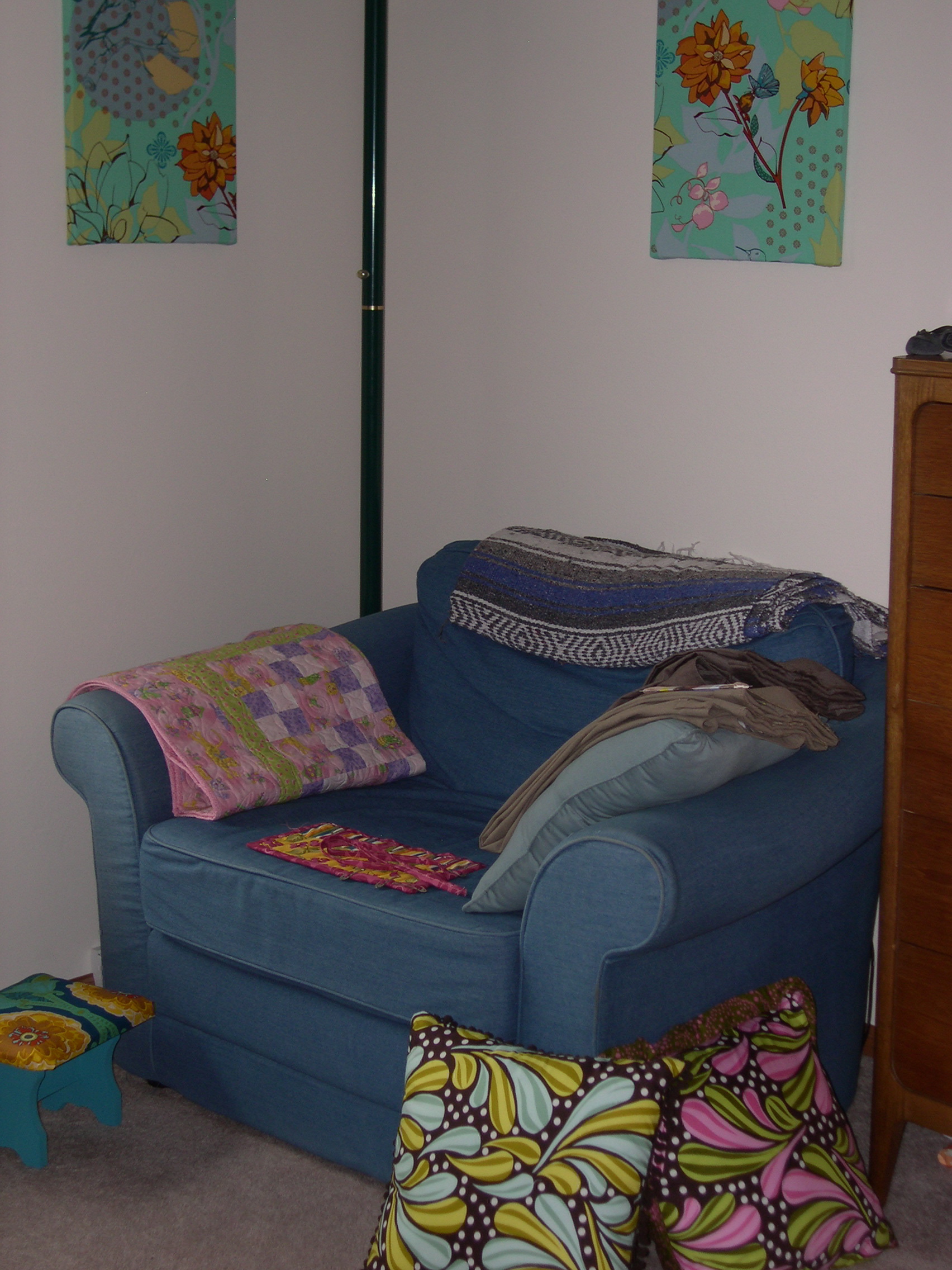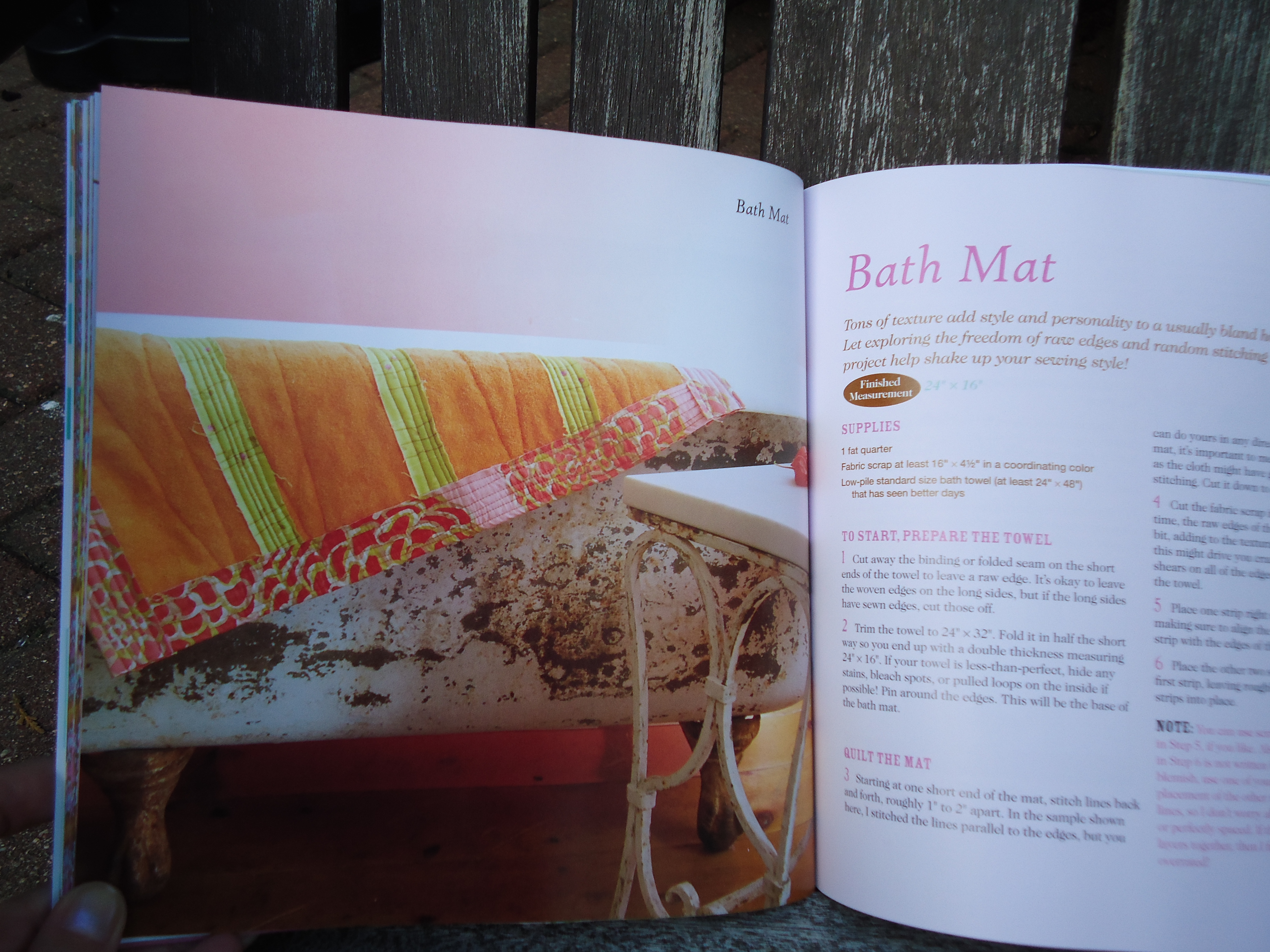 The At Home section includes a very hip argyle embellished pillow, a fabric-covered magnetic frame for your fridge, a gorgeous apron, and this cool bath mat, which is a couple fat quarters pieced over an old bath towel to spice up that old towel.
