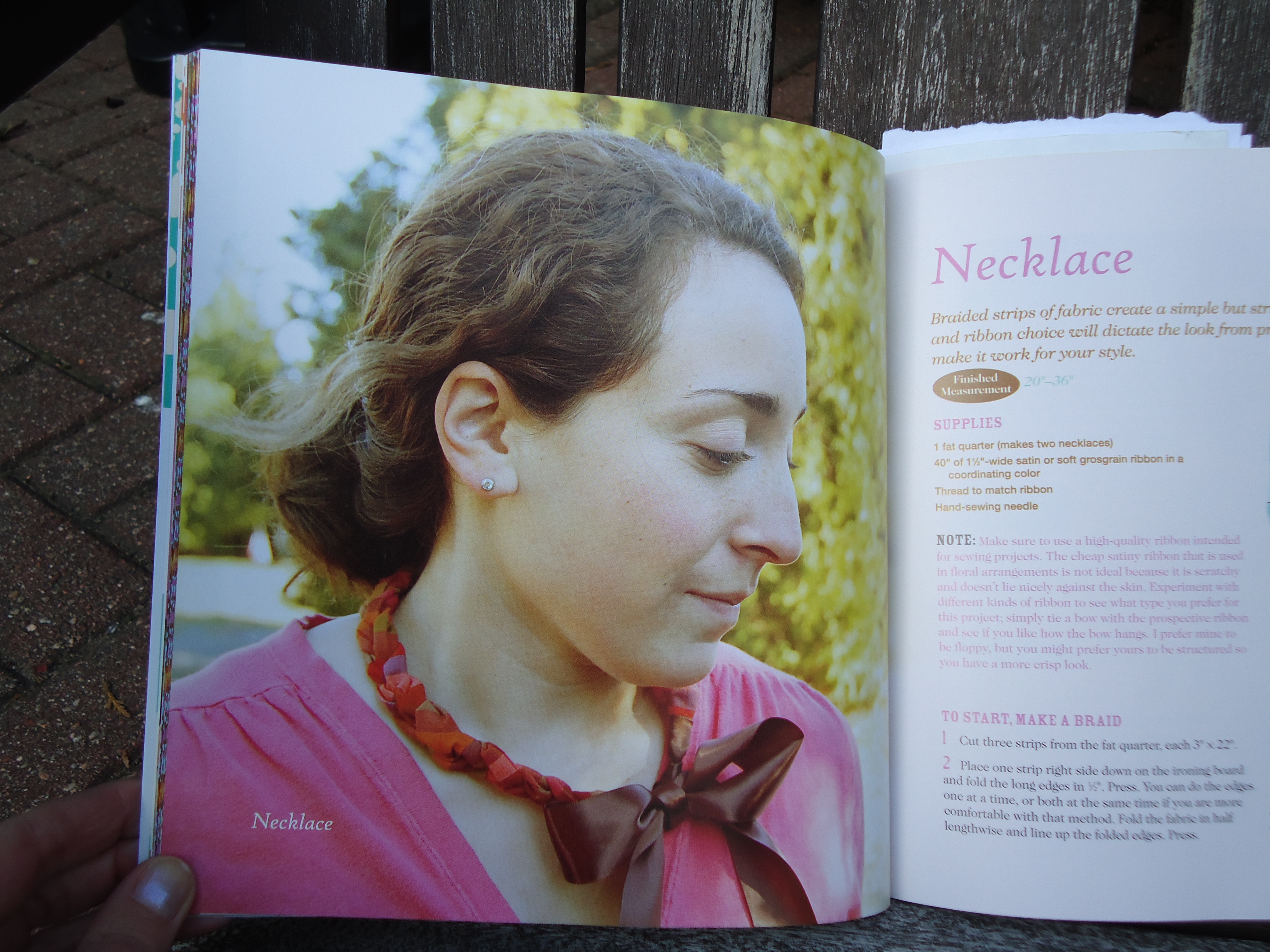 The To Wear section includes projects like a ruched patchwork belt, a spiced up tee for guys (Melissa’s sweety is the model), even custom shoelaces, which would really liven up my gray Converse. I am excited to make this adorable necklace with the pretty ribbon closure.