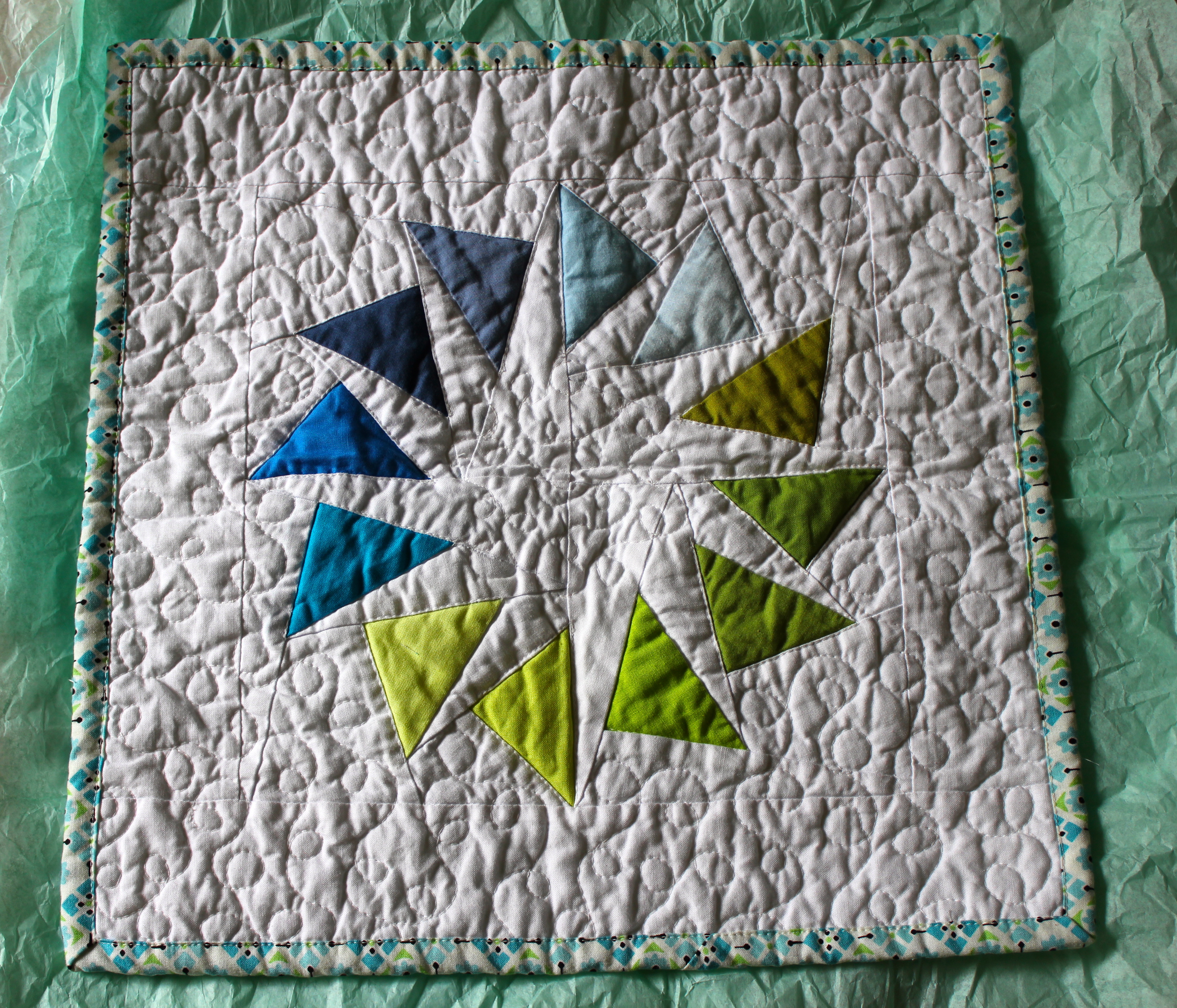Lay the dresden on a piece of felt for backing and top-stitch 1/8″ in around the points and valleys. Trim the felt close to the points and valleys.