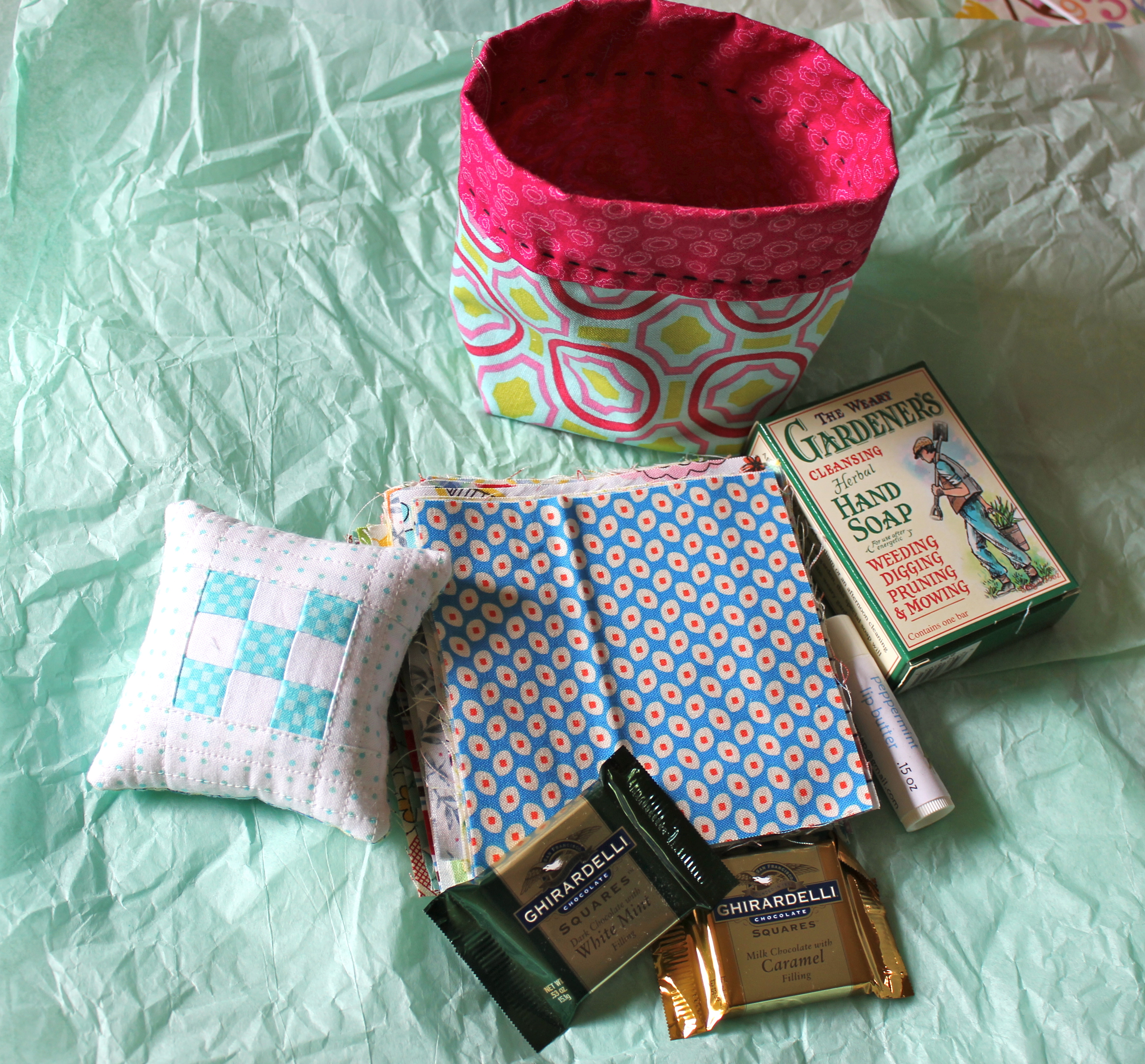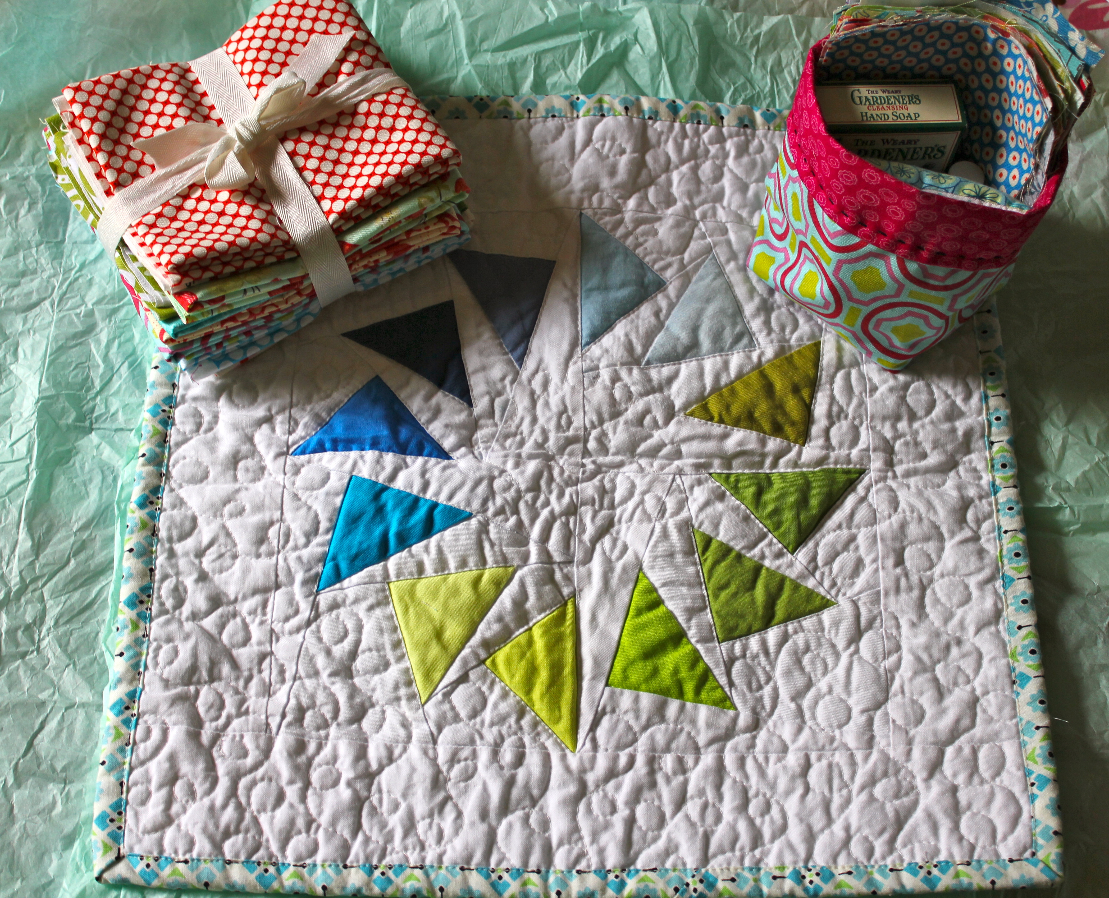 I had a lot of fun making mini Dresden color wheels this past week, so I wanted to share a quick tutorial on how to make your own. I backed this one with felt to use as a mug rug, which really brightens up my work space and makes me happy!