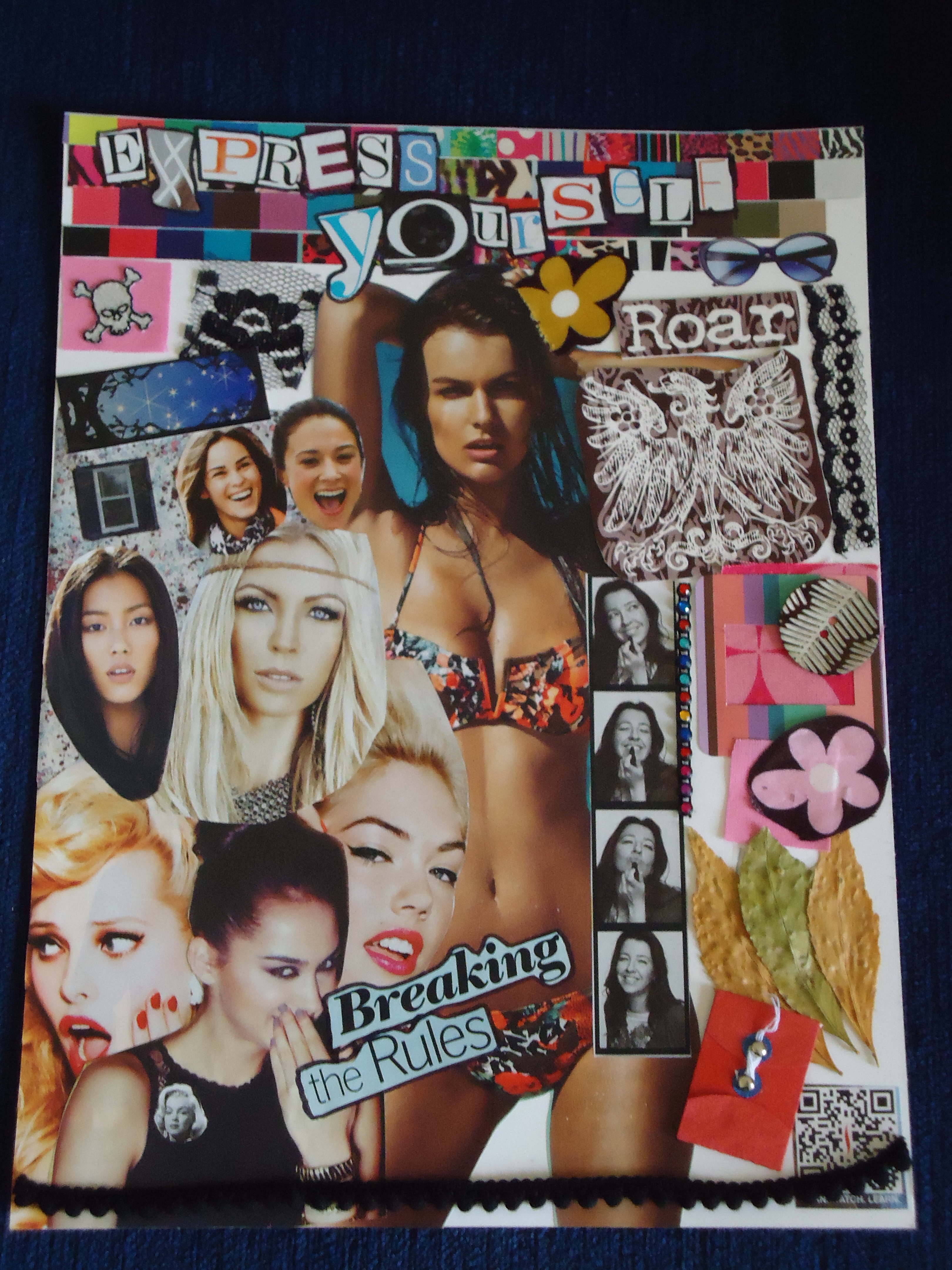 Our third assignment was to create a traditional collage, using newspaper clippings, ribbons, bits of colored paper, artwork, photographs and found objects, glued to a piece of paper. I’ve never done any collaging, so I wasn’t sure how to approach this one. I looked for a central idea in a stack of magazines and catalogs I have been saving. I originally intended to look for images of body parts to go along with a theme “your perfect body.” But then I came up with an inspiration I liked better, “Express yourself.”