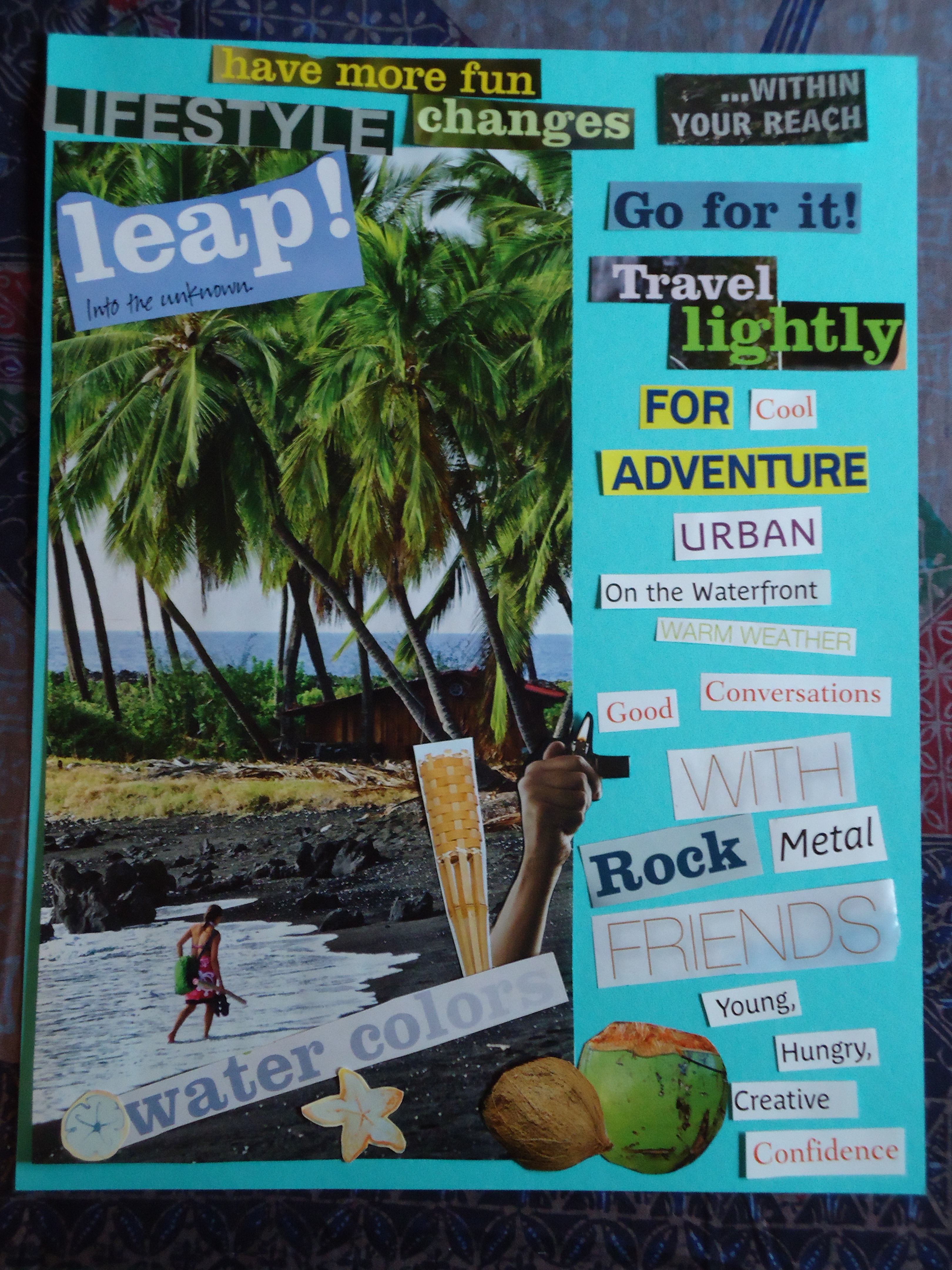 (Addition: I should add that your final image or message also really depends on the materials you have on hand to cut apart and glue back together. For this exercise, I had access to Lucky magazines, Martha Stewart Living magazines, Victoria’s Secret catalogs, Title 9 catalogs, and Patagonia catalogs – quite the hodge podge of imagery!)